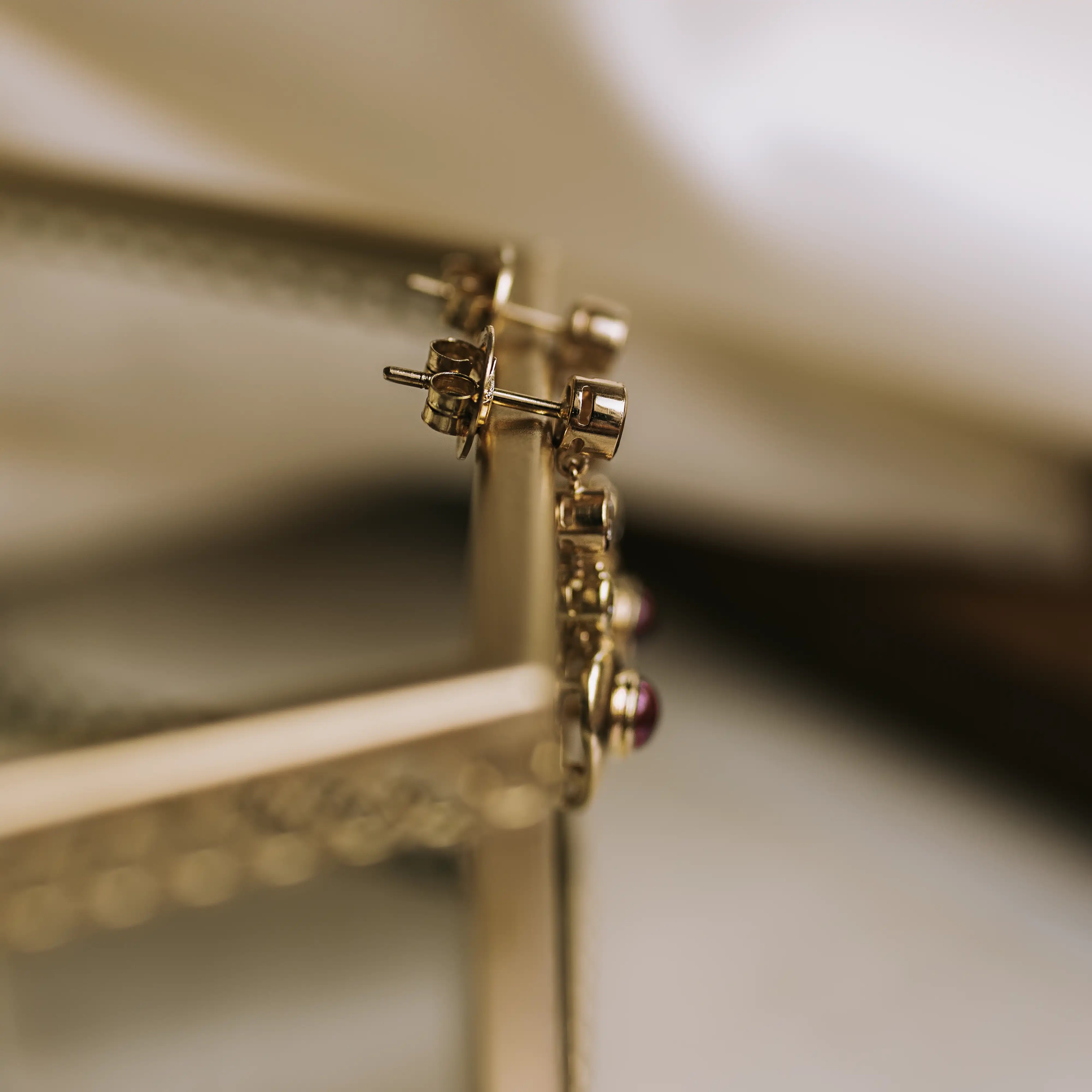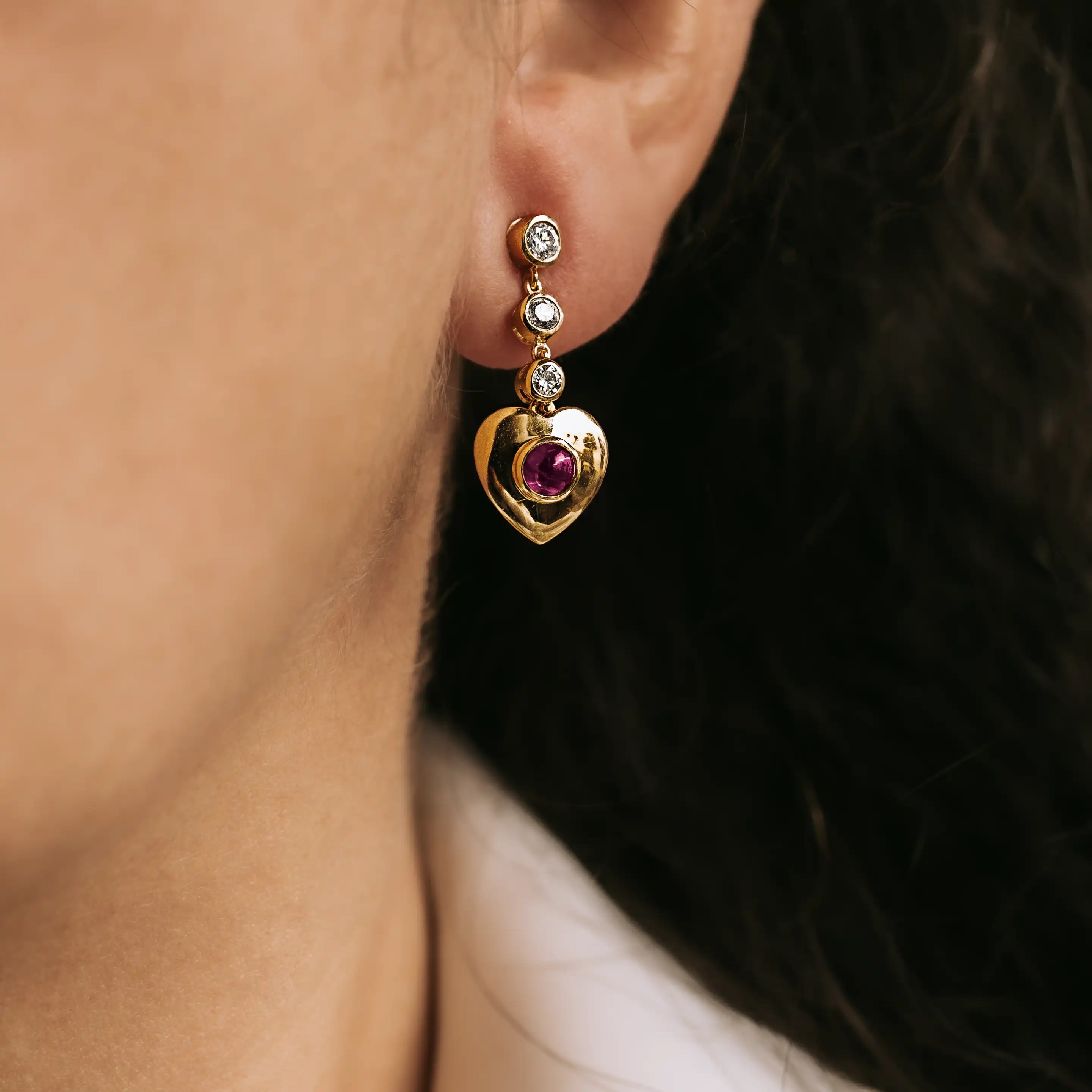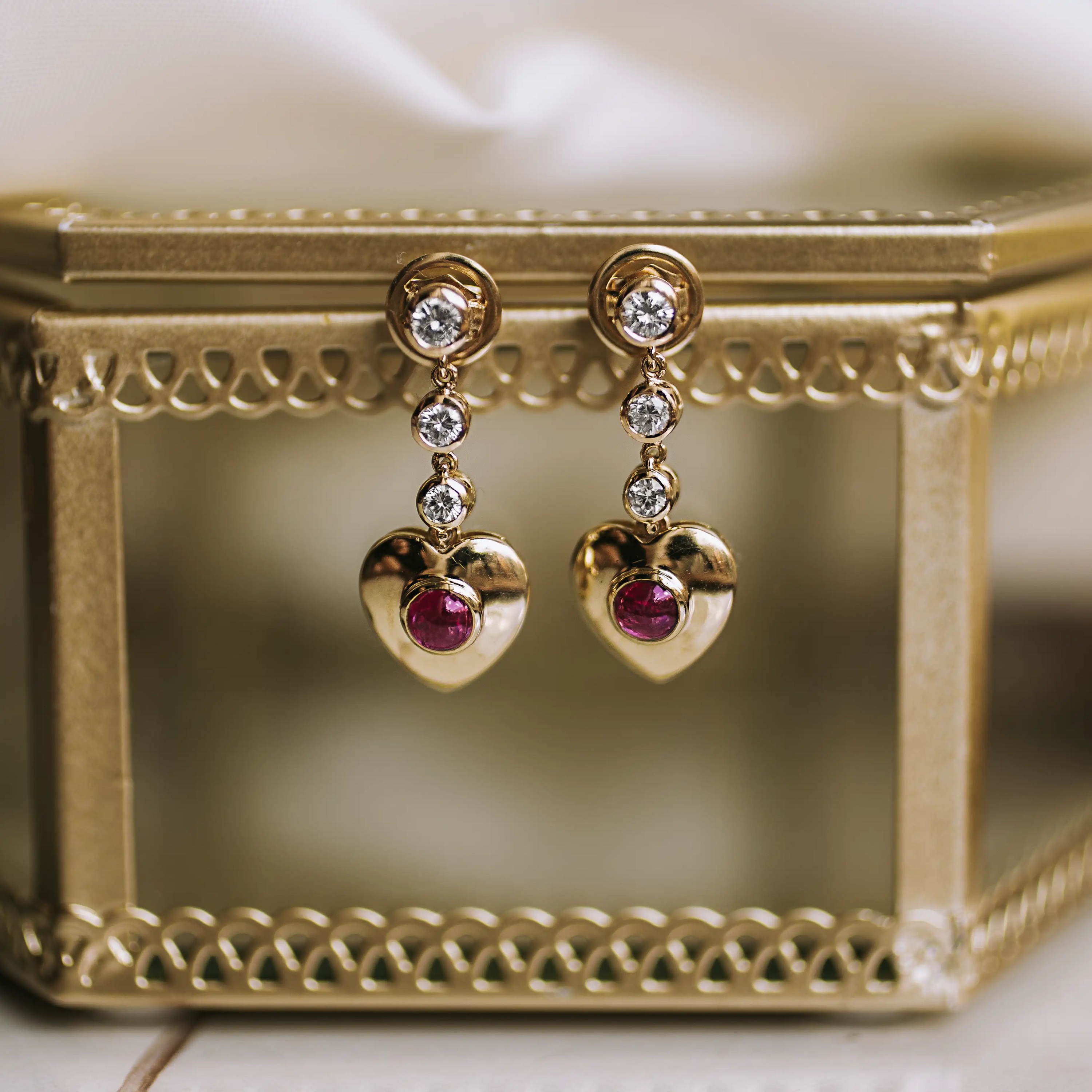 Pendientes vintage de oro amarillo con 6 diamantes talla brillante en chatón y corazones de oro con dos rubíes talla cabujón.