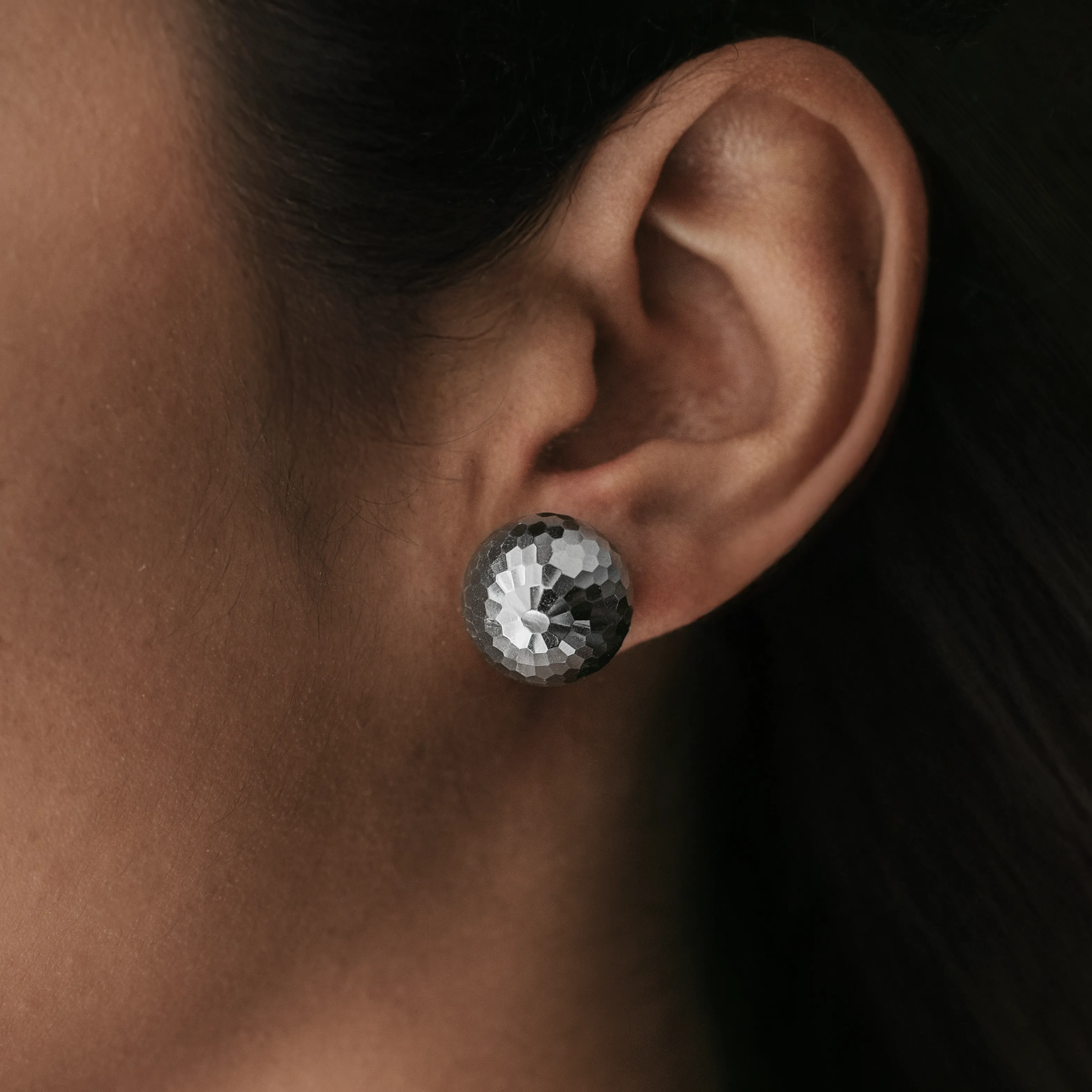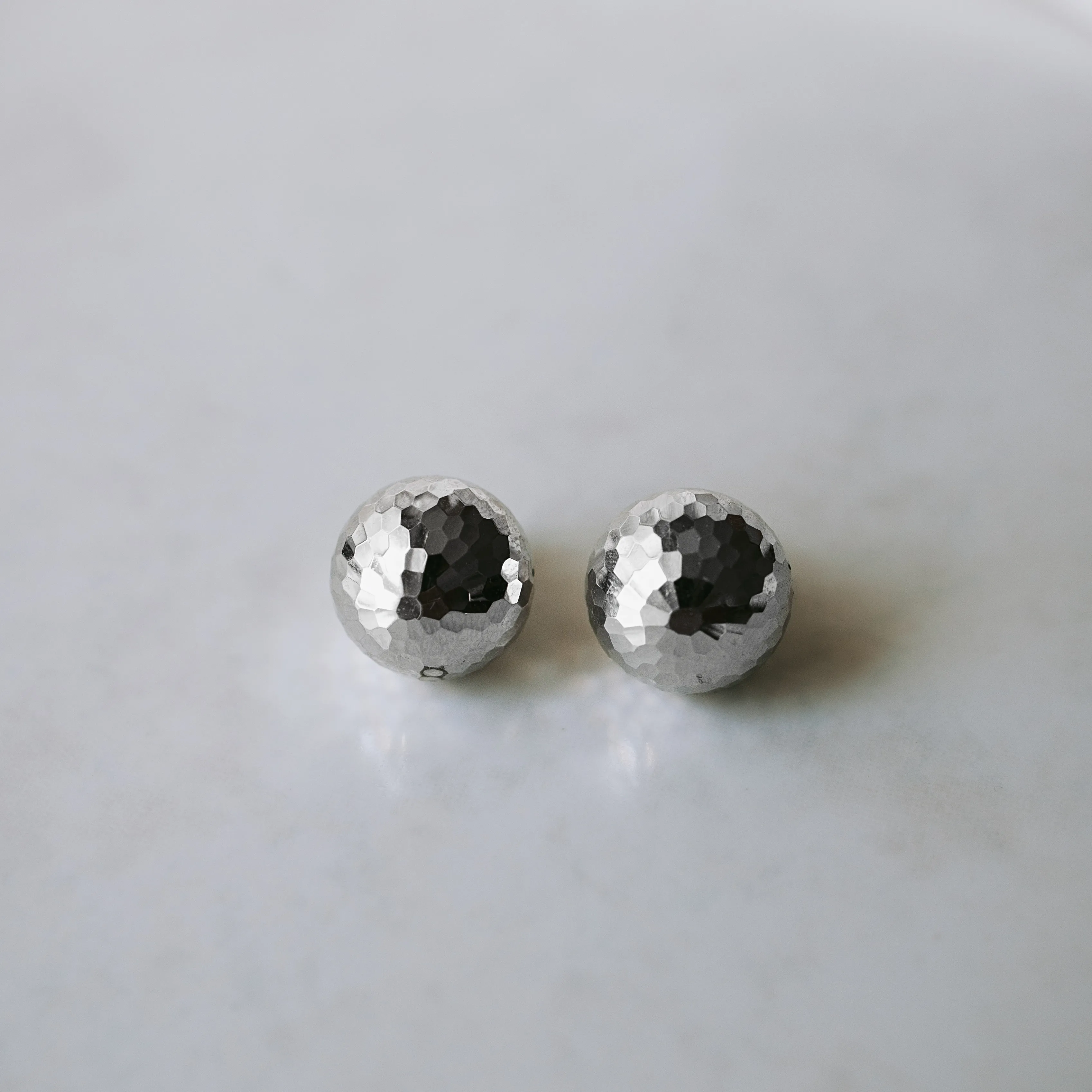 Vintage white gold disco ball earrings with all-over hexagonal motifs carved in shiny gold.