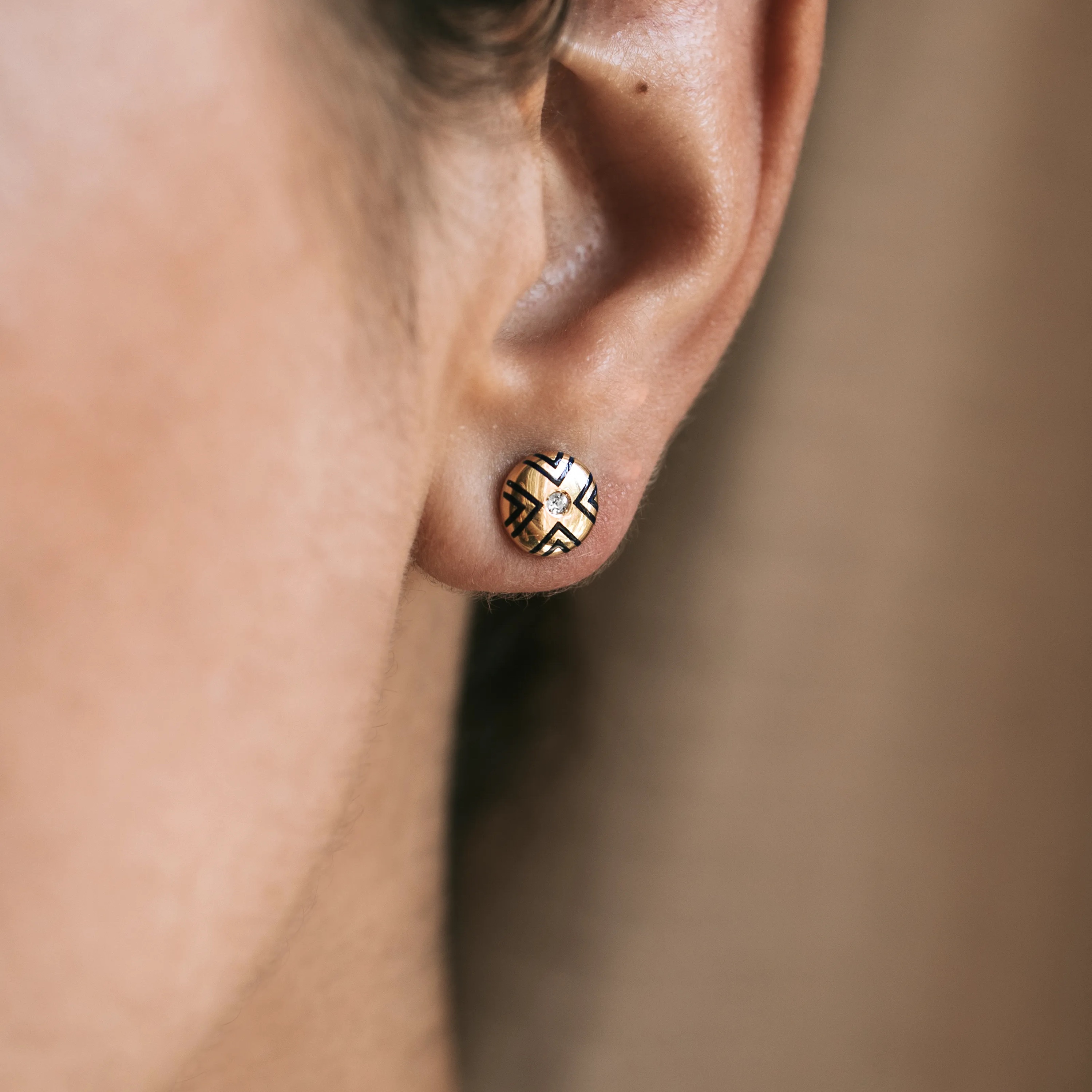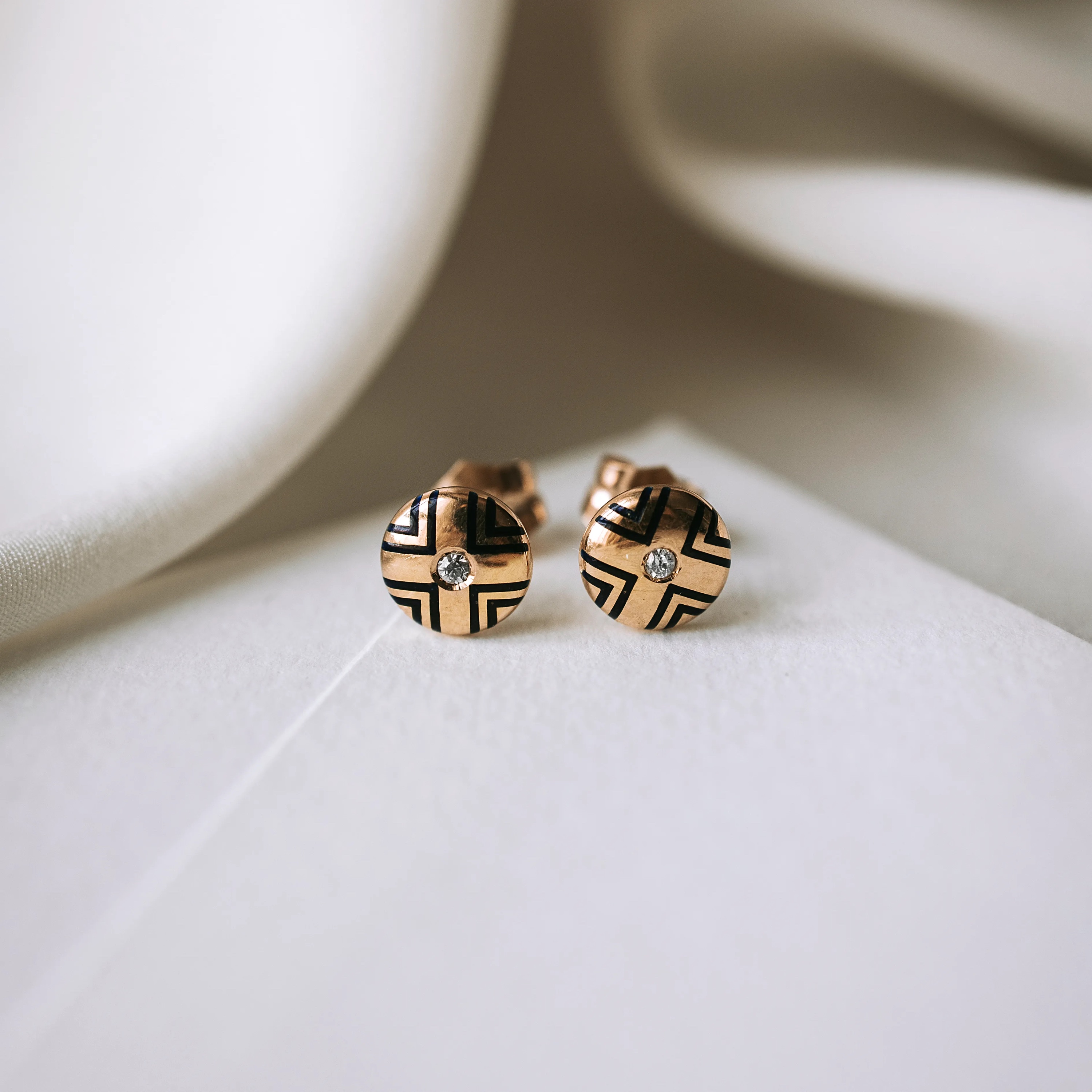 Vintage yellow gold earrings with enamel and old-cut diamonds.