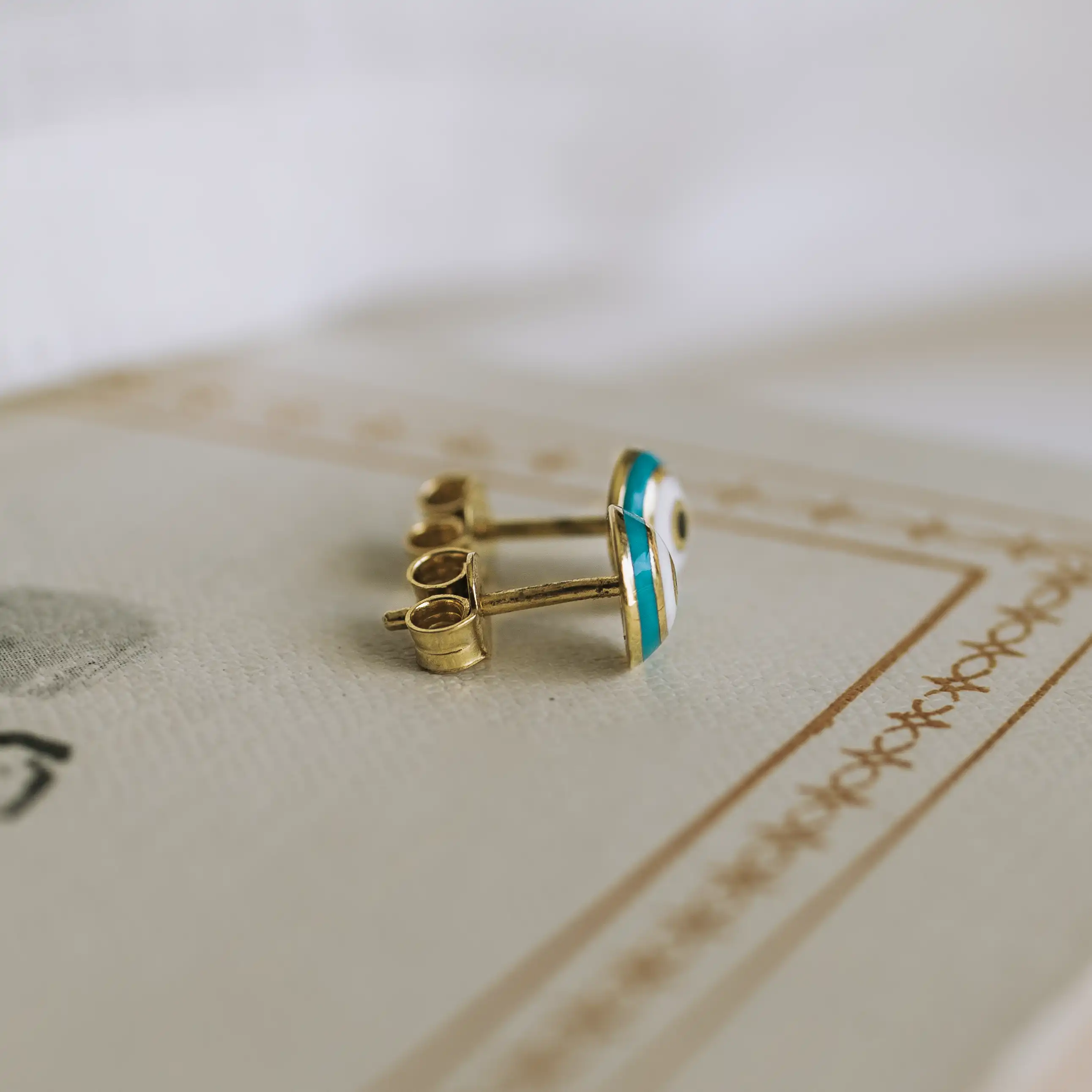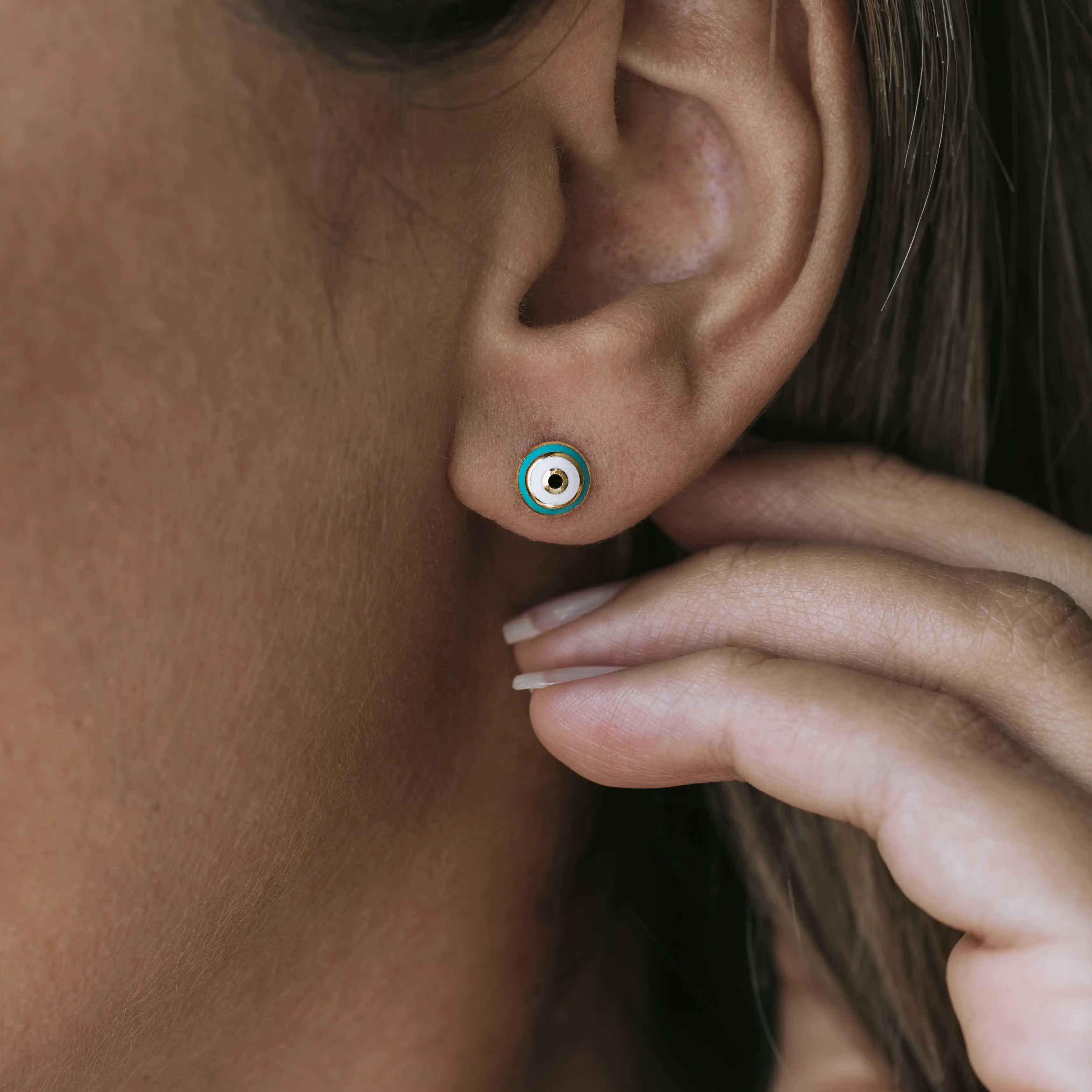 Vintage yellow gold earrings with concentric circles in blue, gold, and white.