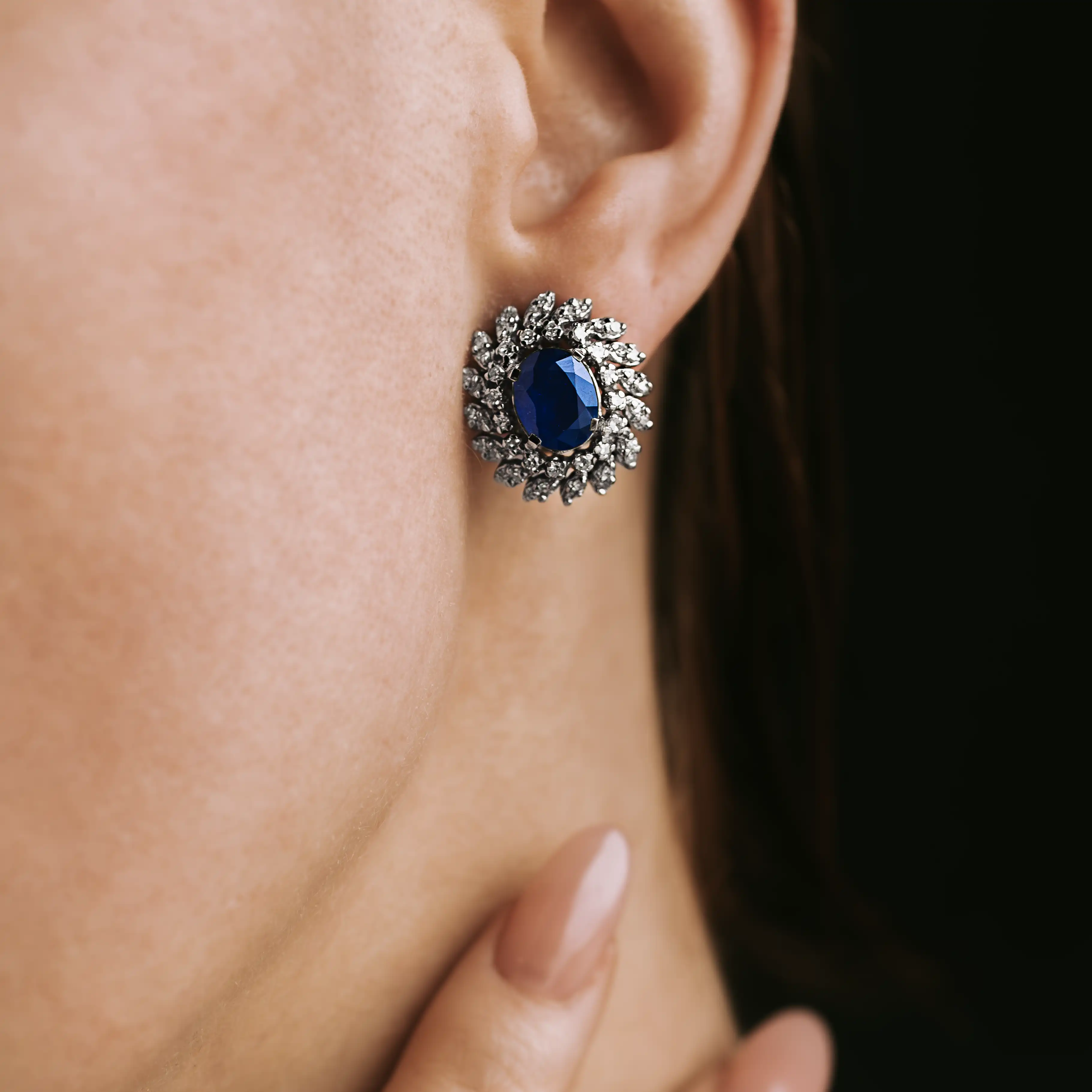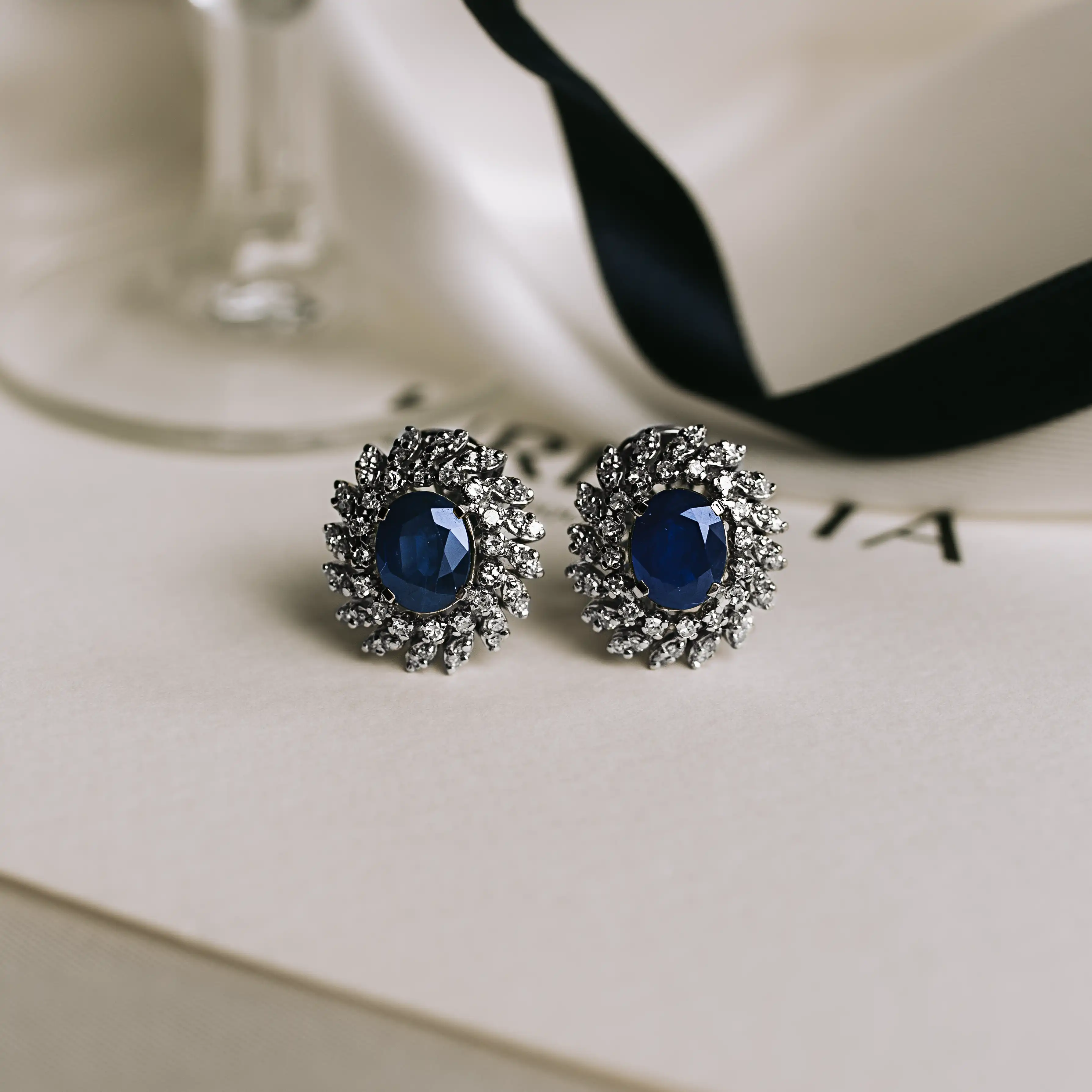 Pendientes vintage rosetas de oro blanco con dos grandes zafiros talla oval y dobles orlas en espiral con 96 diamantes talla antigua.