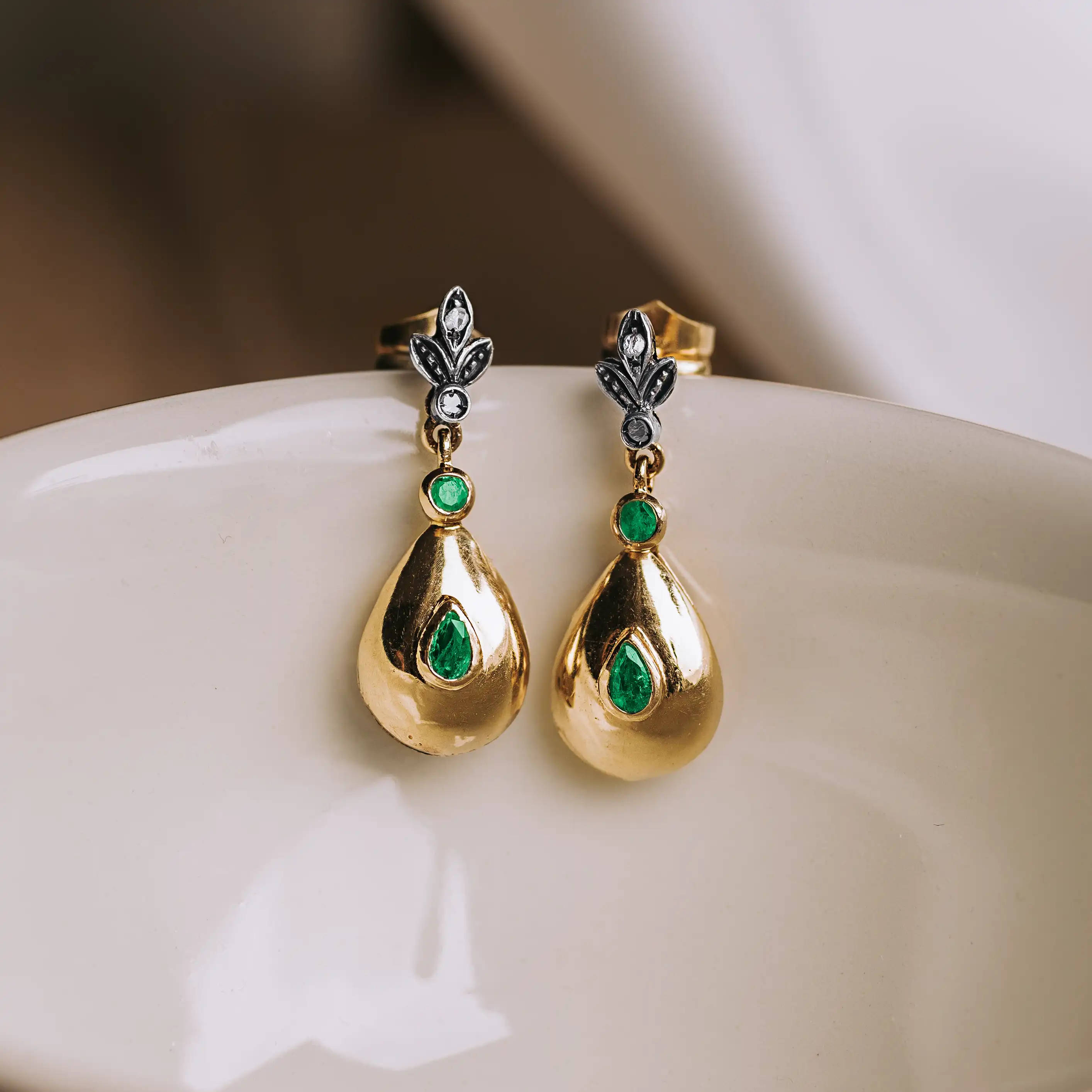 Pendientes vintage de oro amarillo y vistas parciales de plata con 4 esmeraldas talla pera y redonda y 4 diamantes talla rosa.