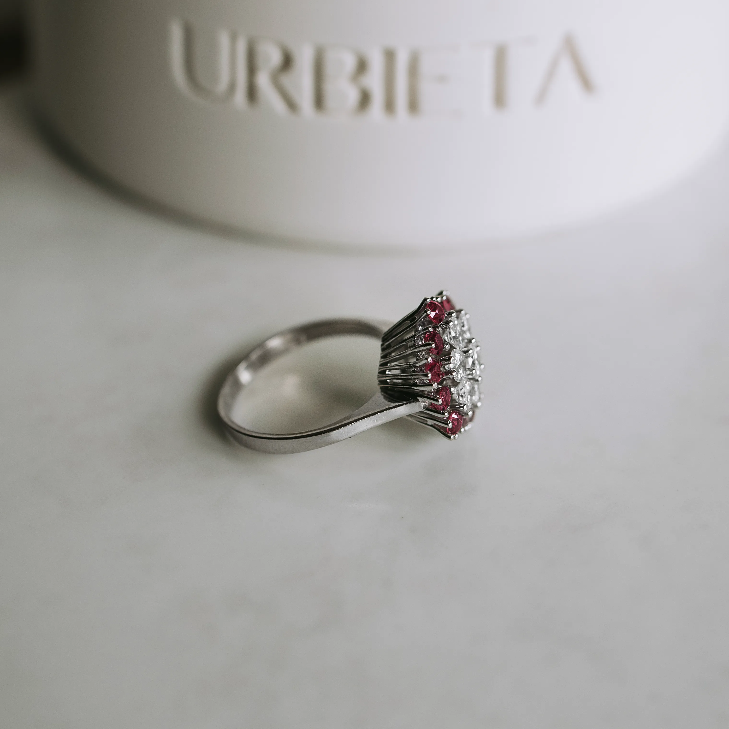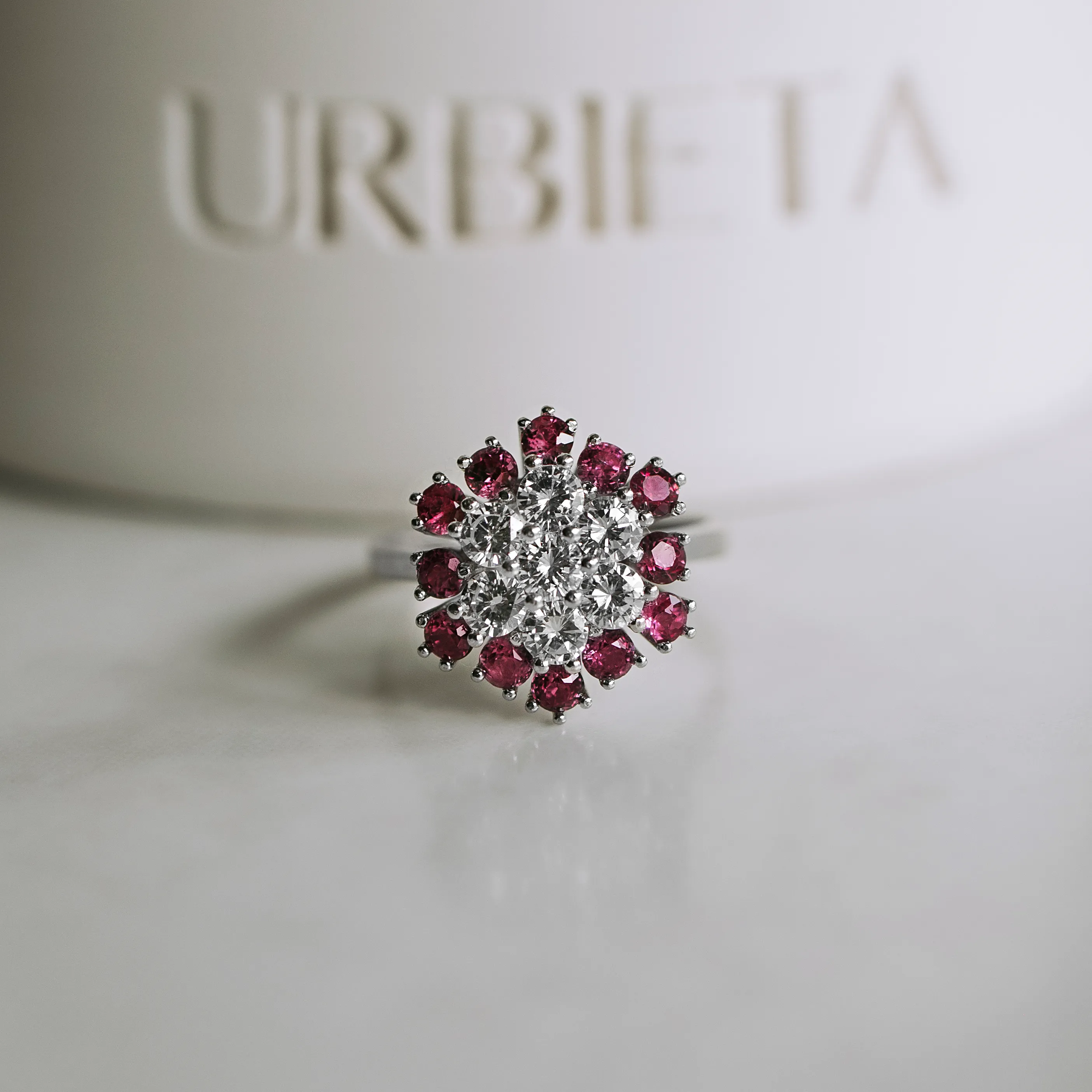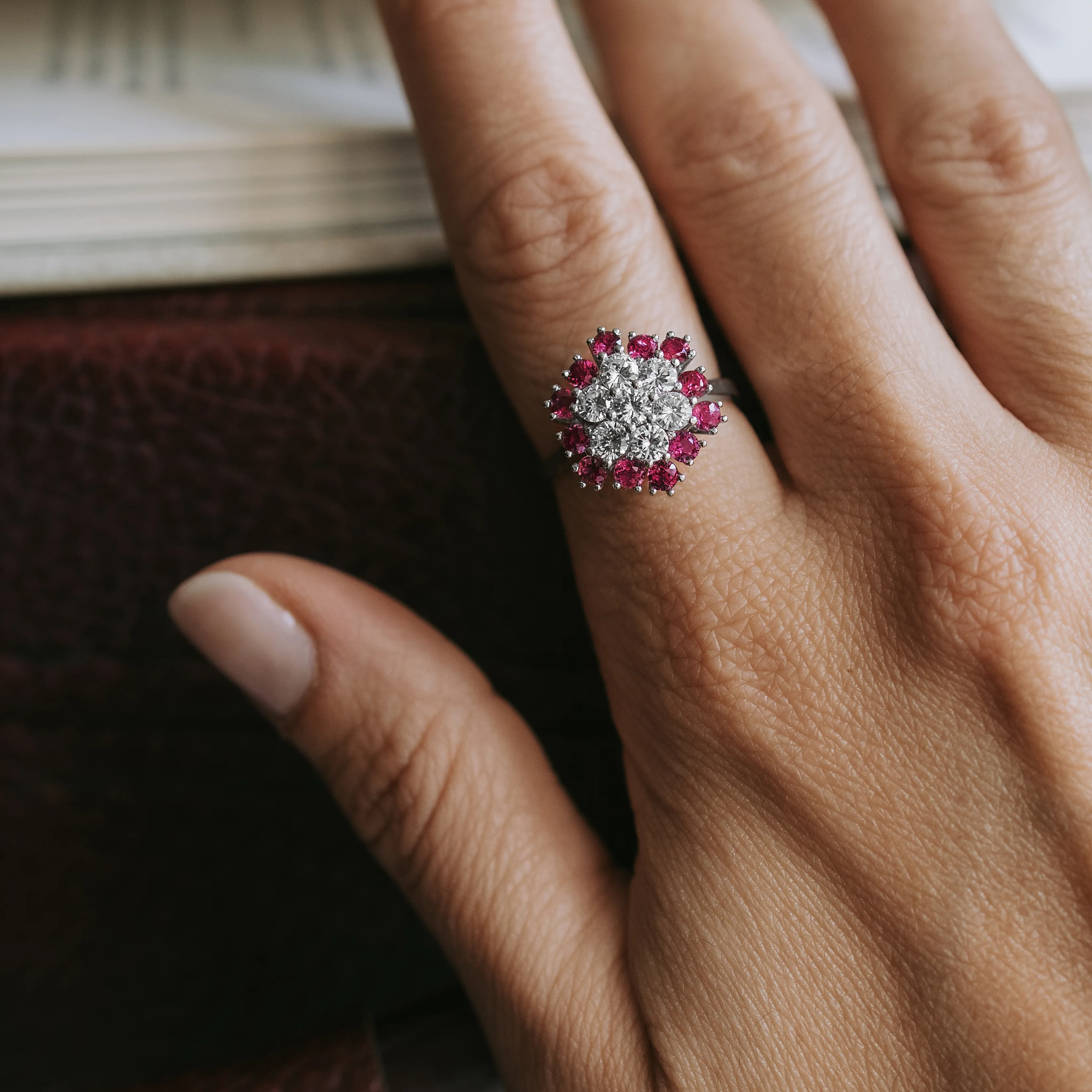 Vintage white gold rosette ring with 7 brilliant-cut diamonds and 12 round-cut rubies.