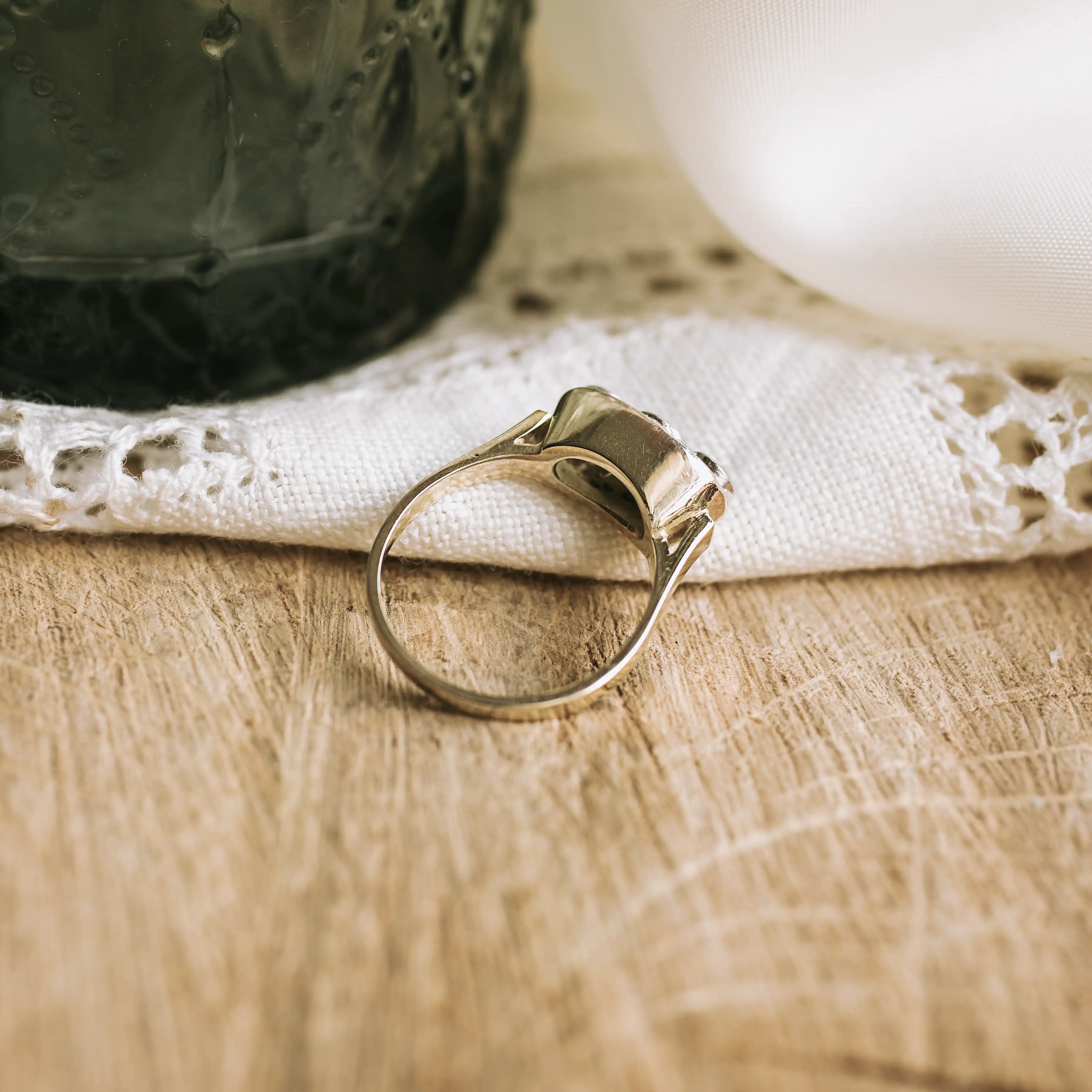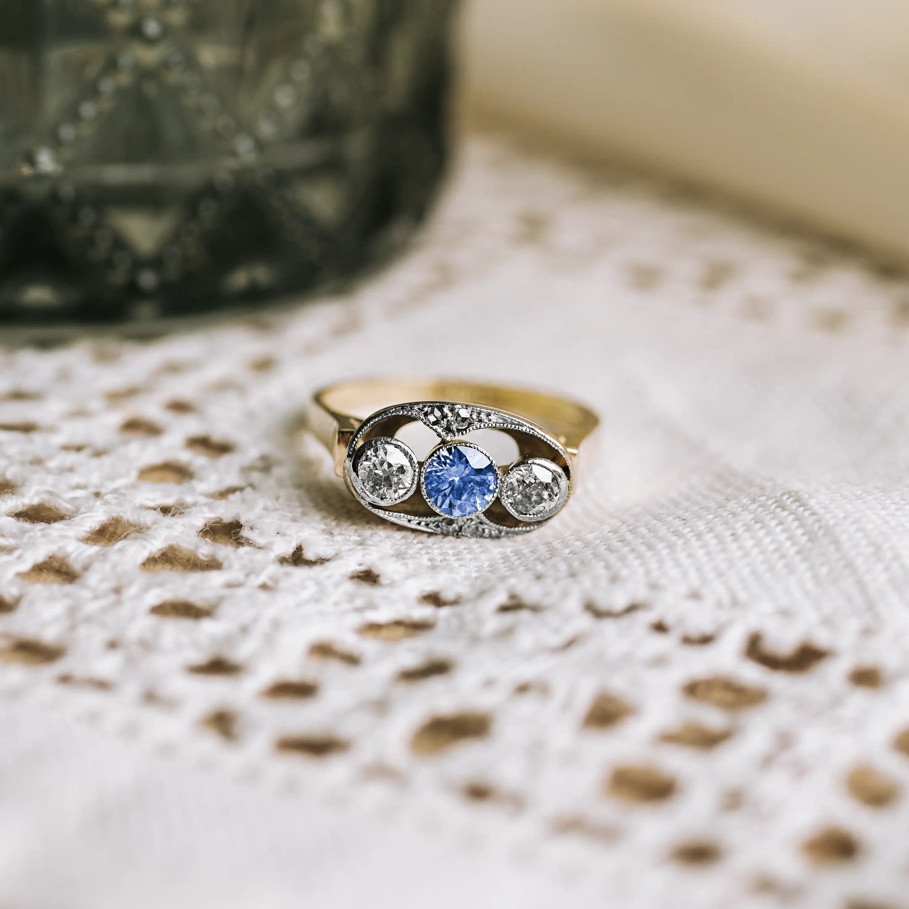 Tresillo antiguo de oro amarillo y blanco con zafiro de Ceilán y dos diamantes talla antigua y otros 4 diamantes talla rosa.