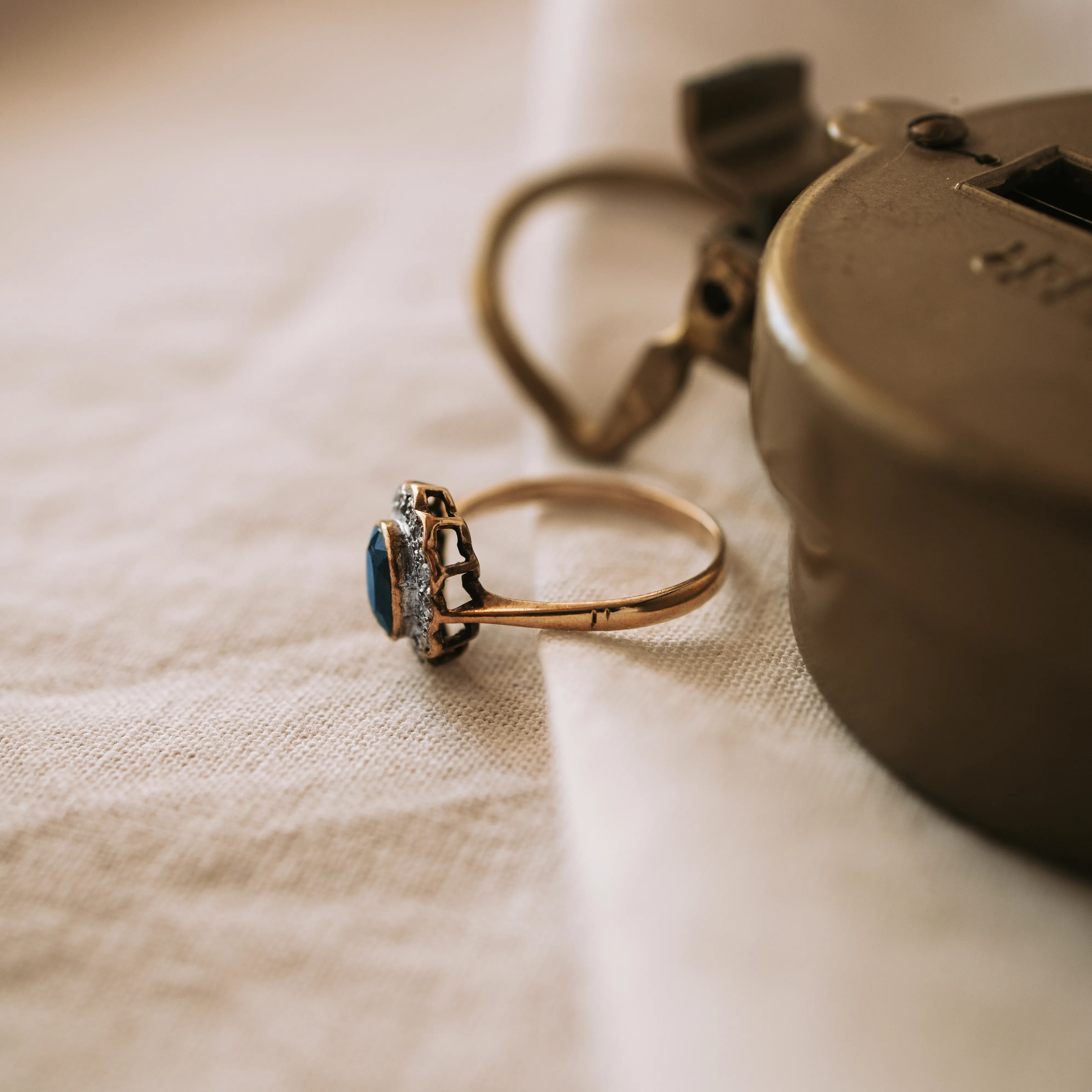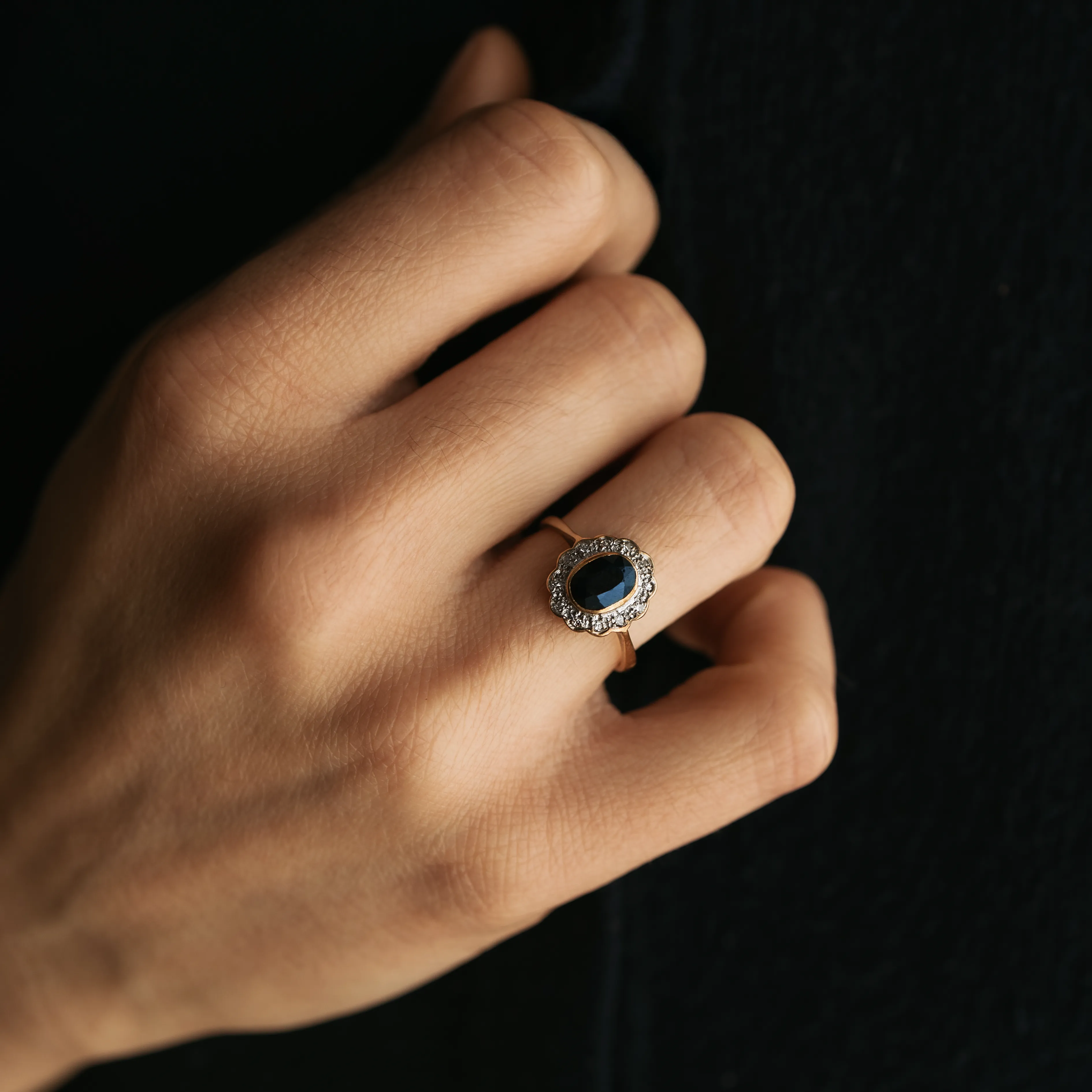 Roseta vintage de oro amarillo con zafiro talla oval y orla de 12 diamantes talla antigua en oro blanco.
