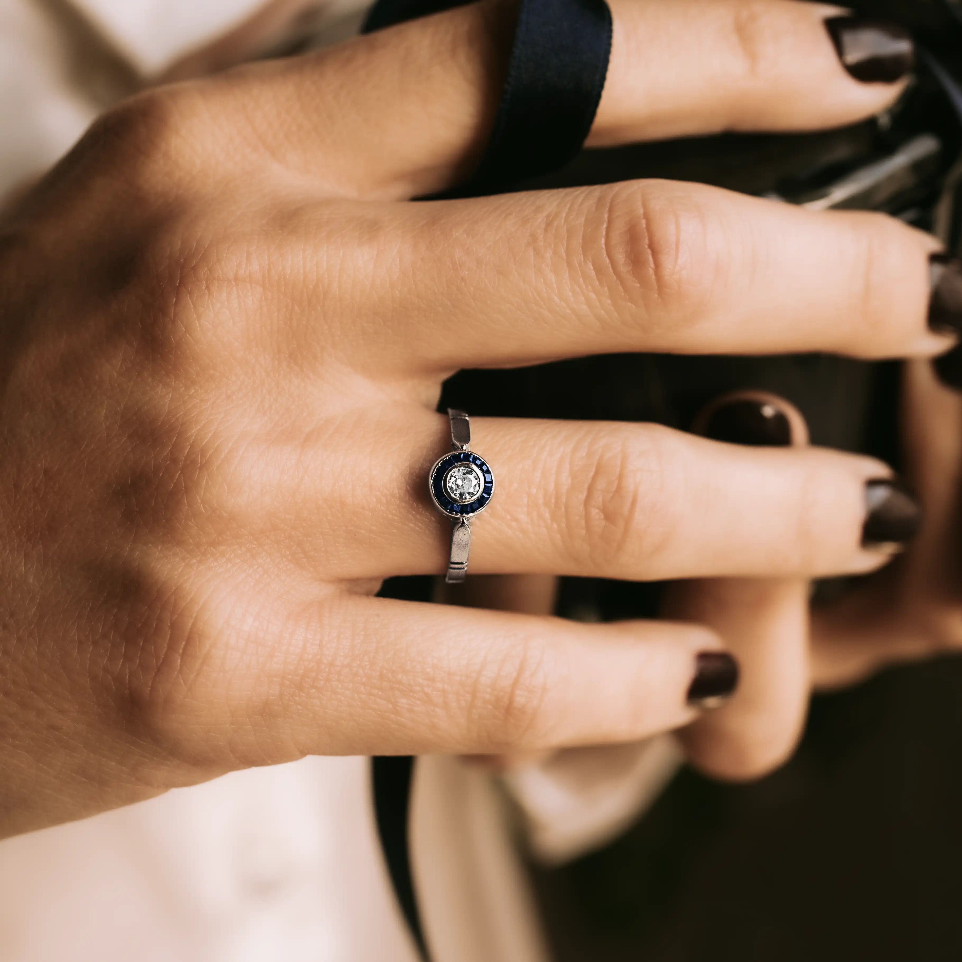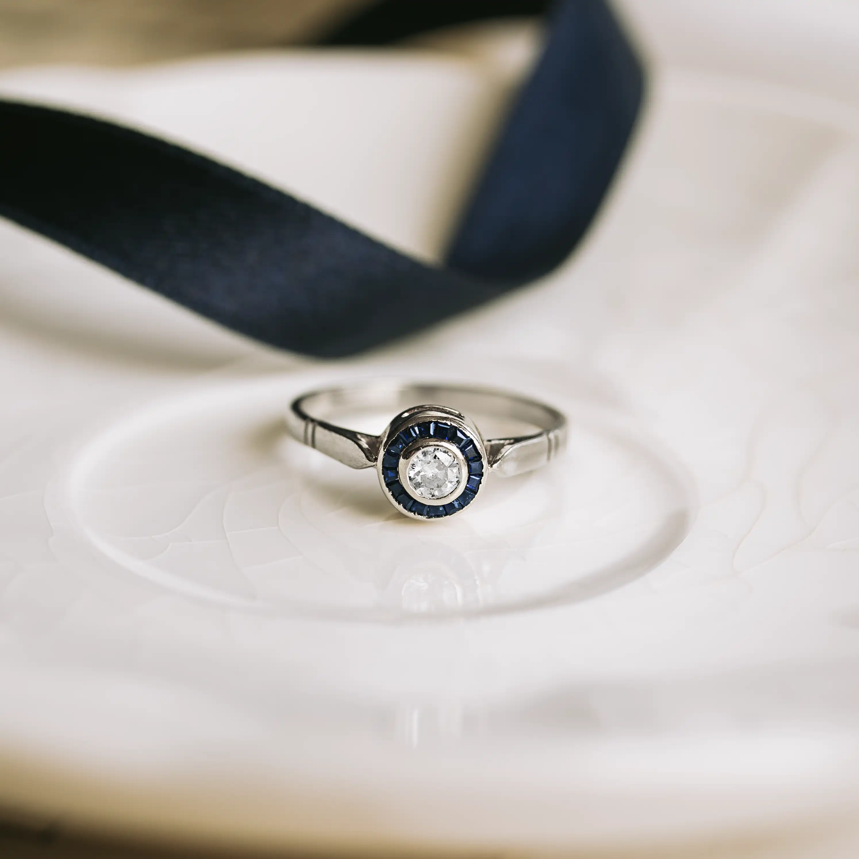 Ojo de perdiz de oro blanco con diamante talla brillante y orla 16 zafiros calibrados.