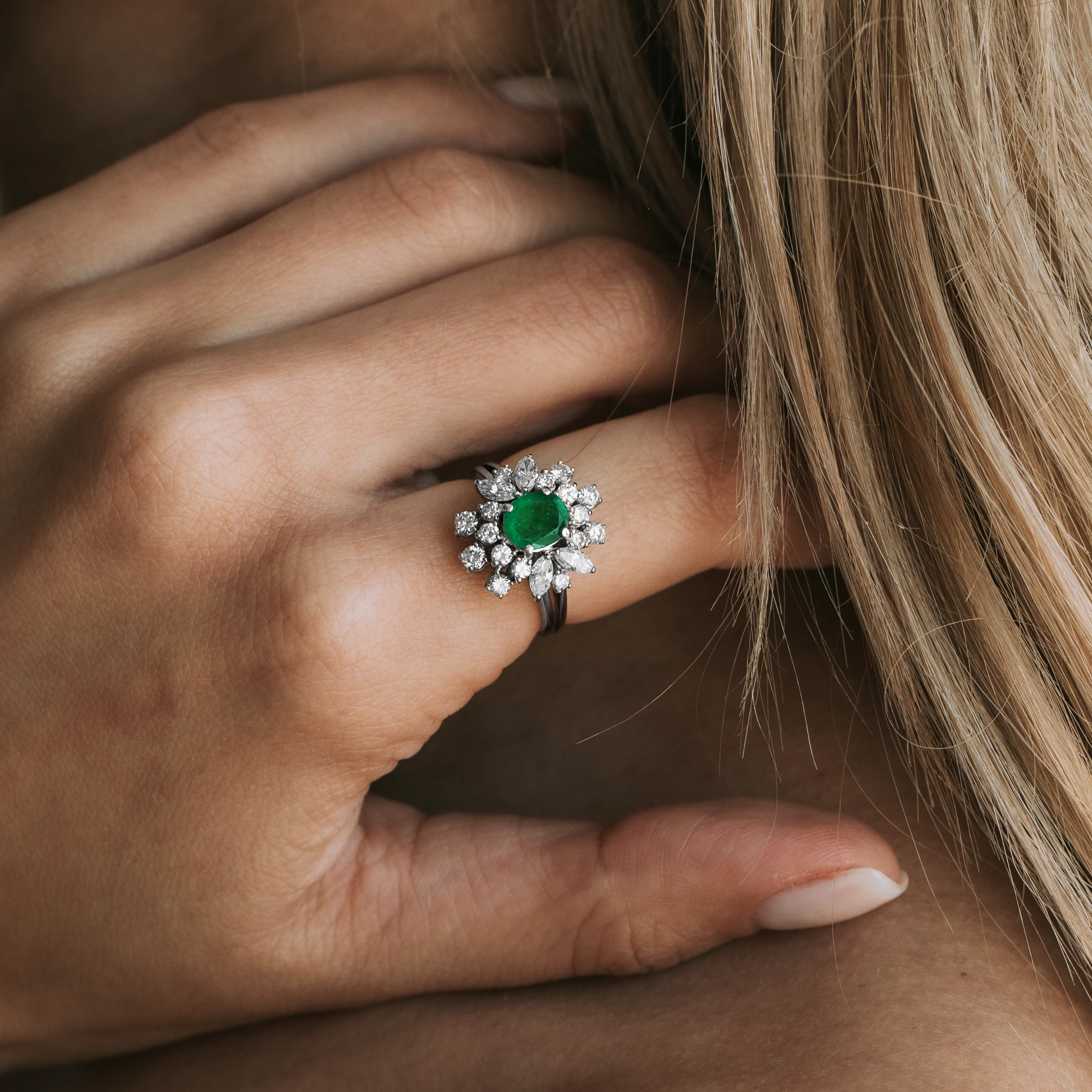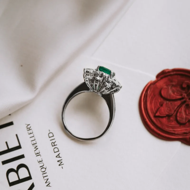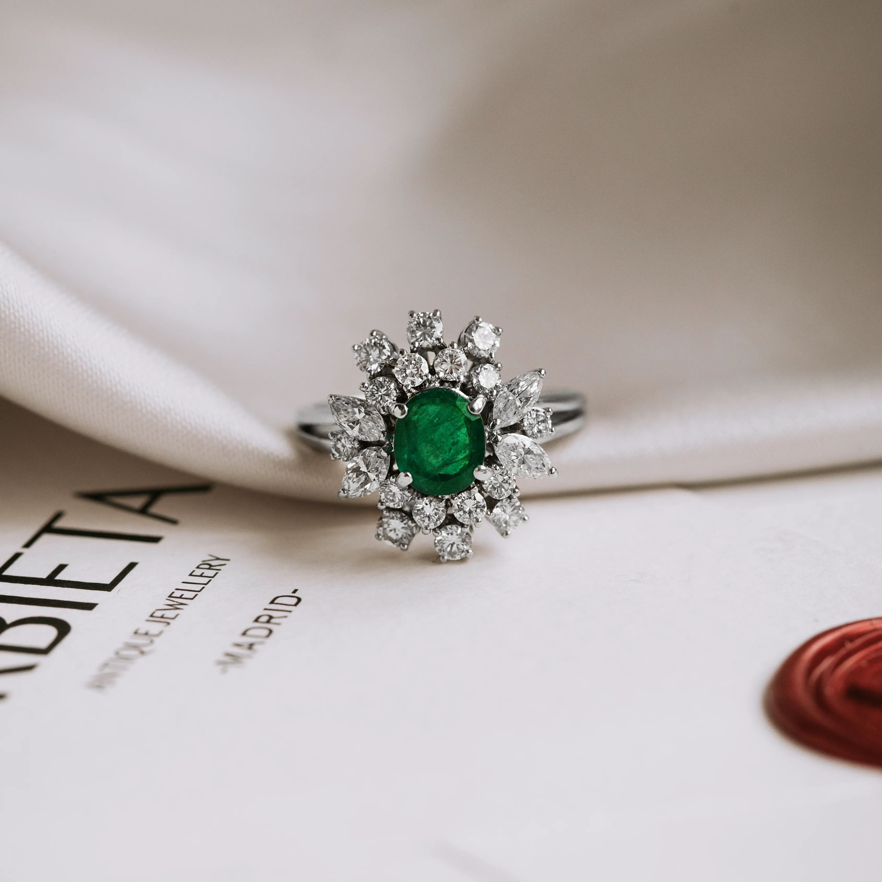 Roseta vintage de oro blanco con esmeralda talla oval y orla de 20 diamantes tallas brillante y marquesa.