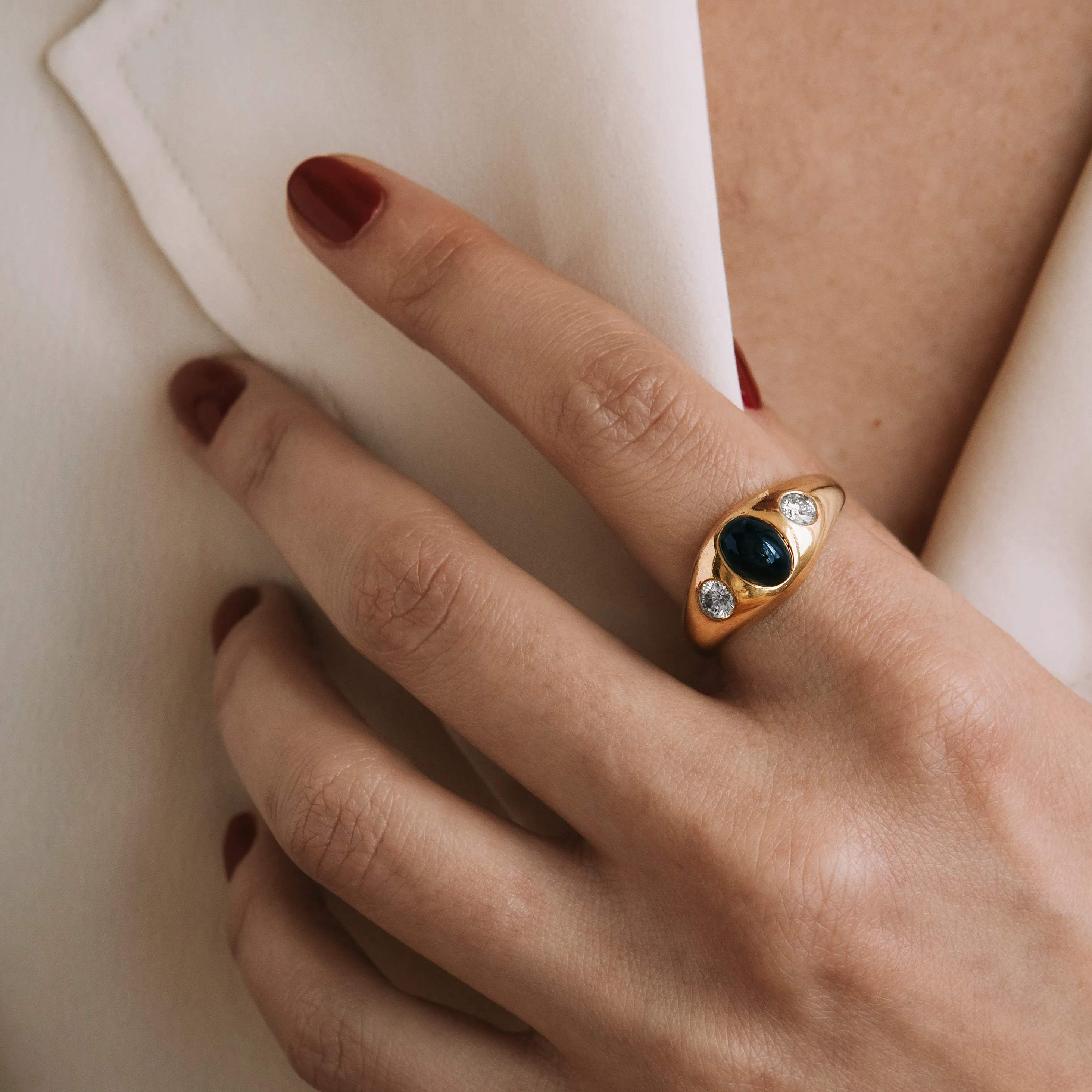 Tresillo vintage de oro amarillo con zafiro talla oval cabujón y dos diamantes talla brillante.
