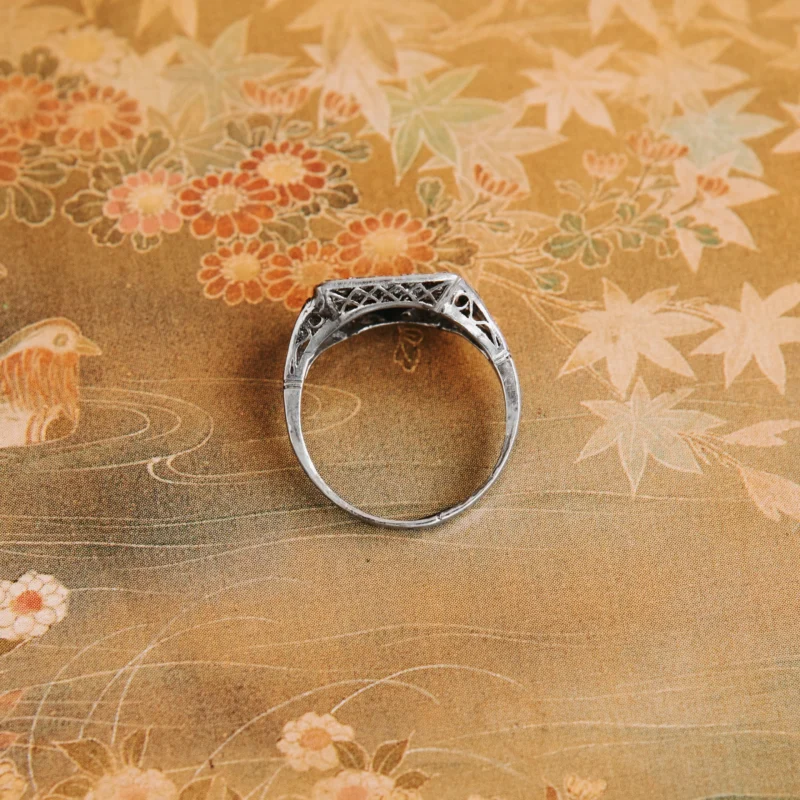 Roseta art déco de platino con zafiro talla redonda y 22 diamantes talla antigua en orla y hombros.
