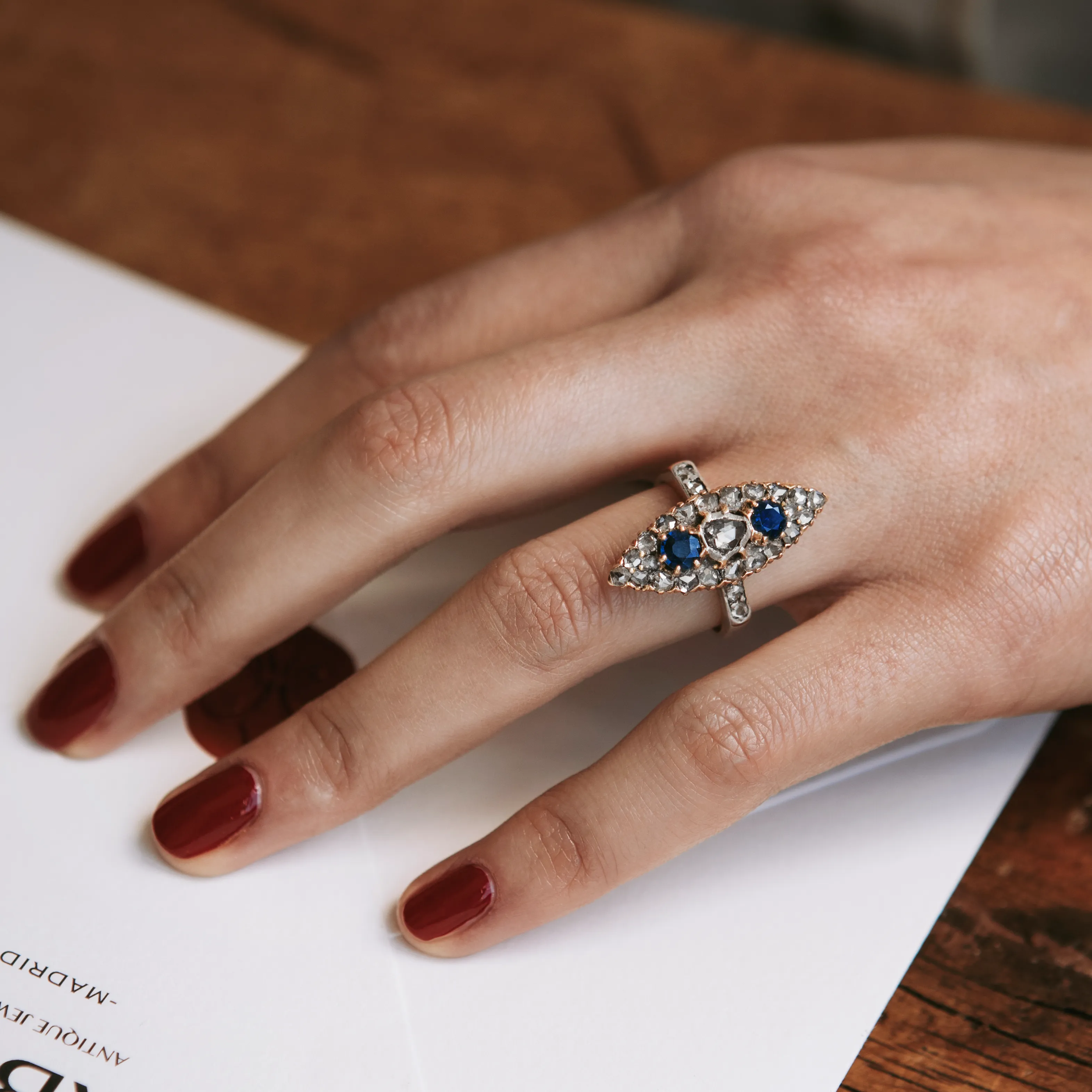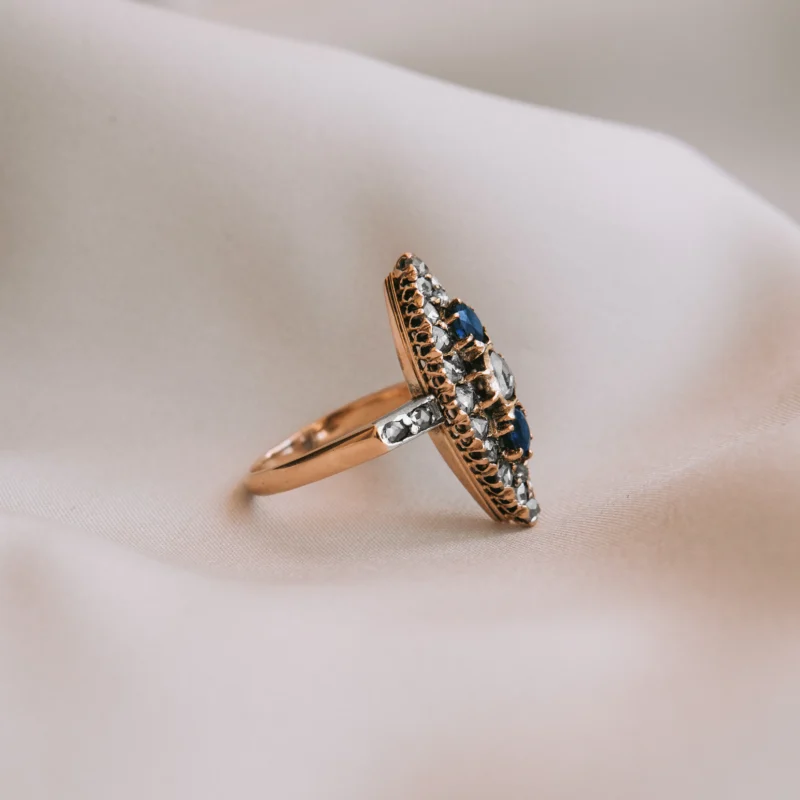 Lanzadera del siglo XIX de oro rosa y vistas parciales de plata con 27 diamantes talla rosa y dos zafiros talla redonda.