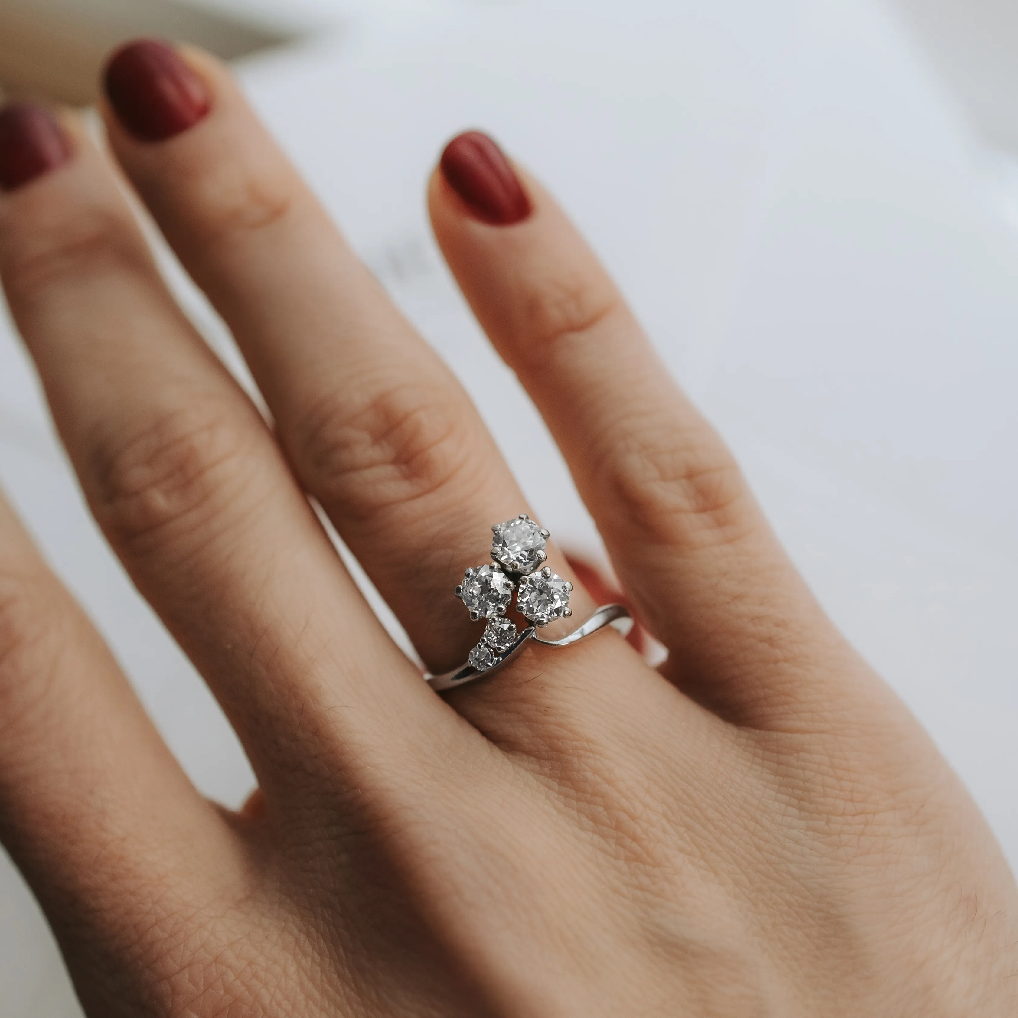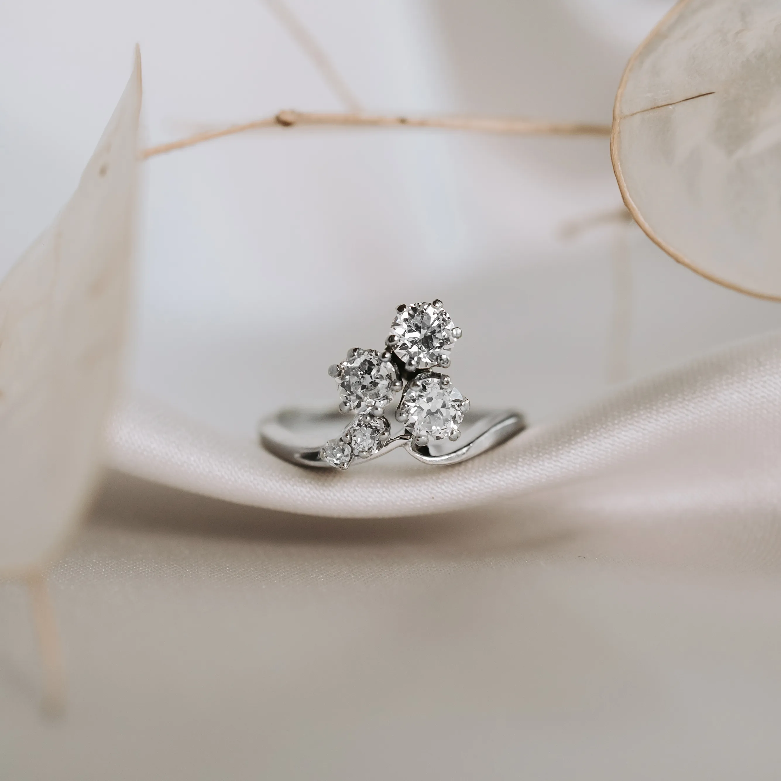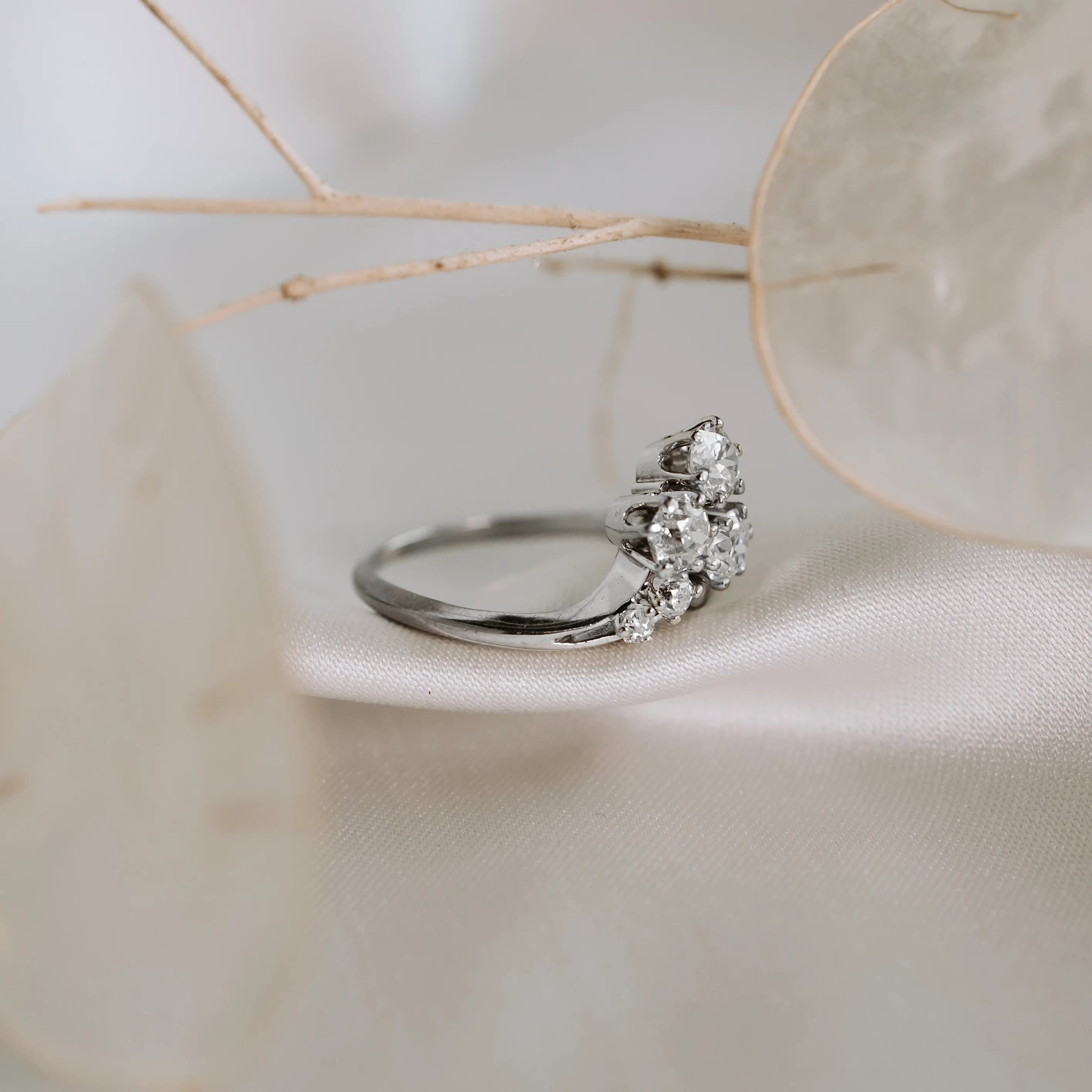 Rosetón vintage de oro blanco con cinco diamantes talla brillante y antigua.