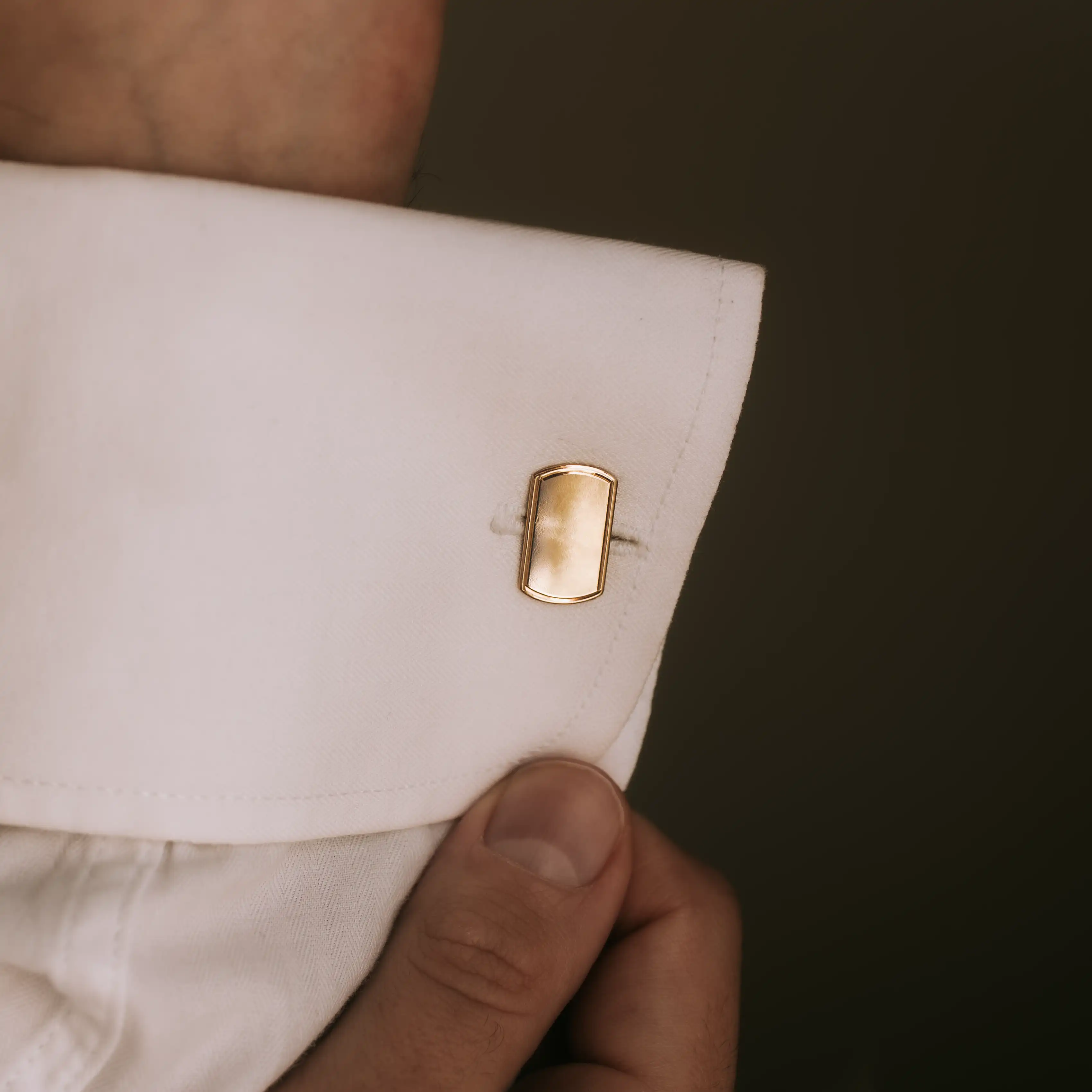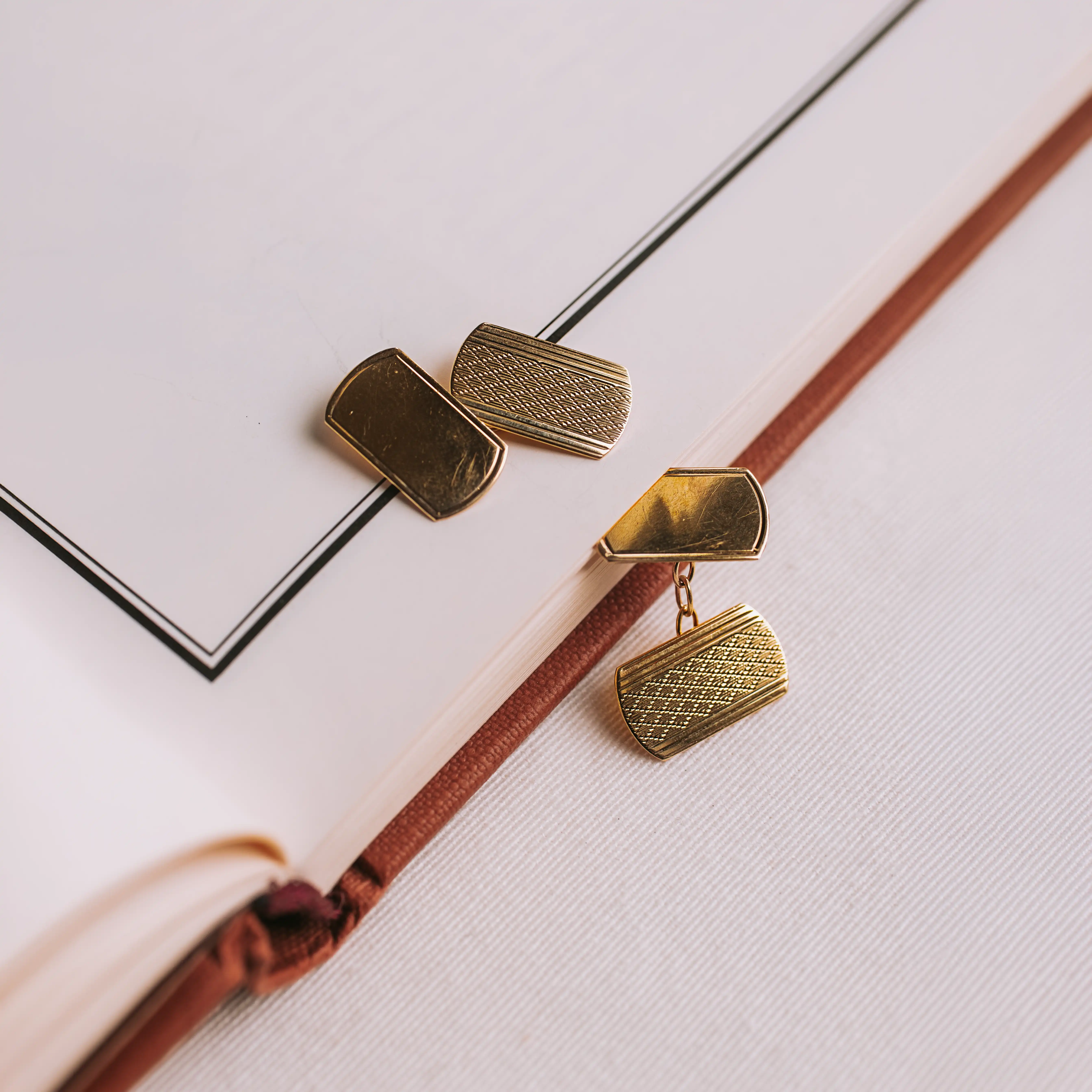 Gemelos vintage de oro amarillo con forma rectangular con motivos geométricos flanqueados por líneas paralelas