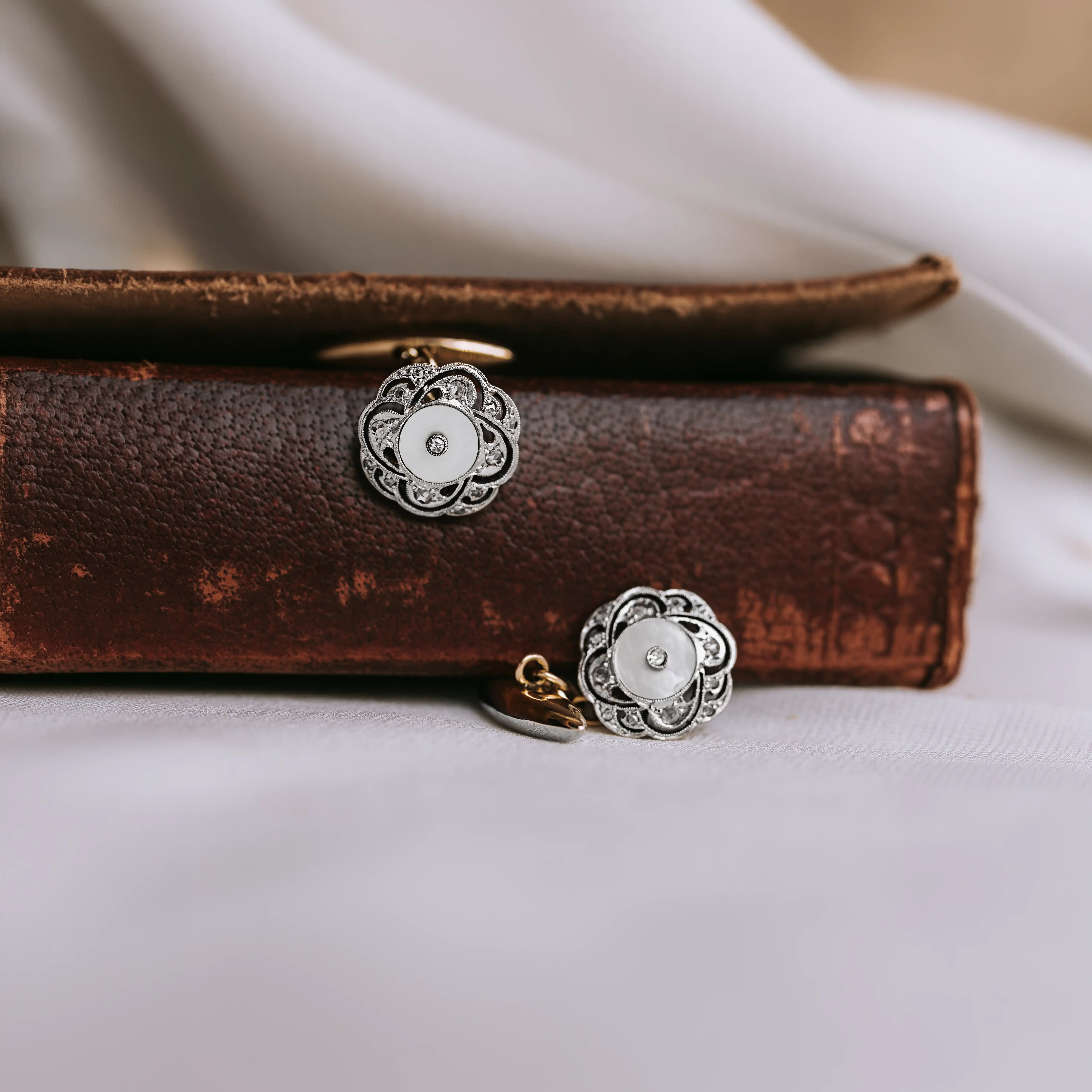 Gemelos art déco de oro amarillo y vistas de oro blanco con madreperlas y magnífico trabajo con 26 diamantes tallas rosa y antigua.