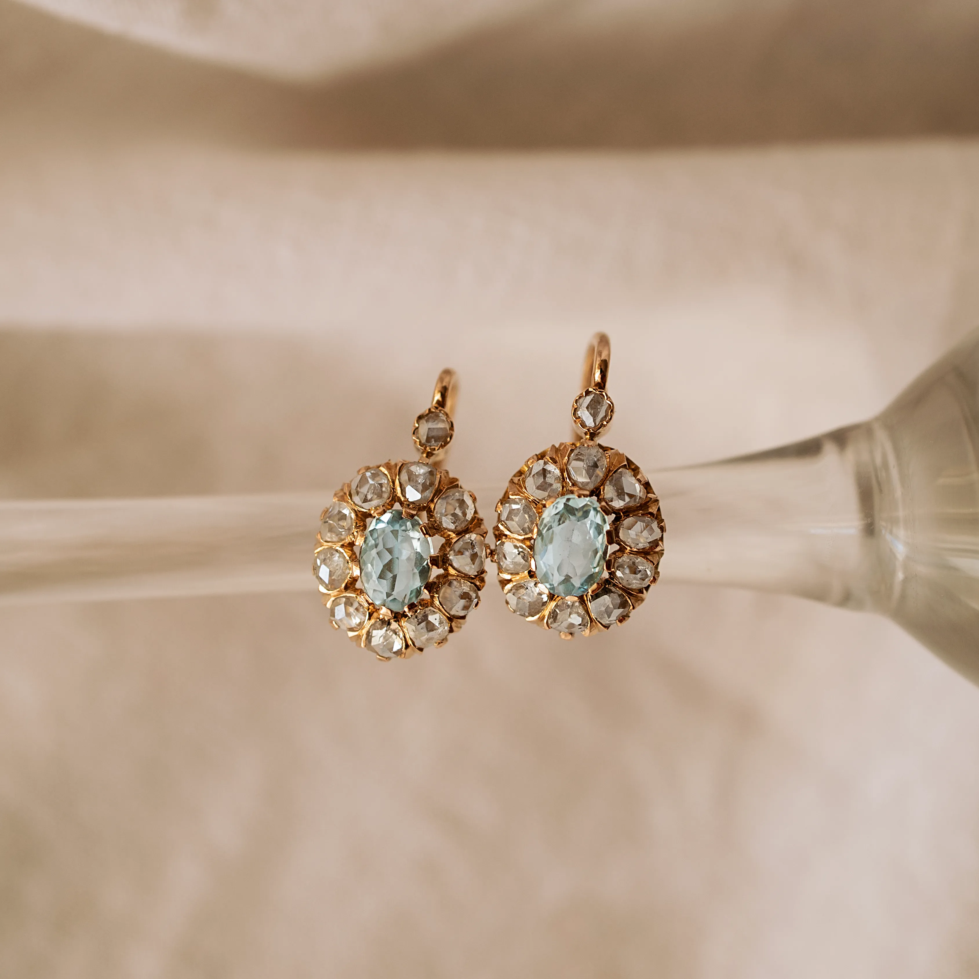 Pendientes del siglo XIX de oro rosa con dos rosetas con aguamarinas talla oval y orlas con 22 diamantes talla rosa.