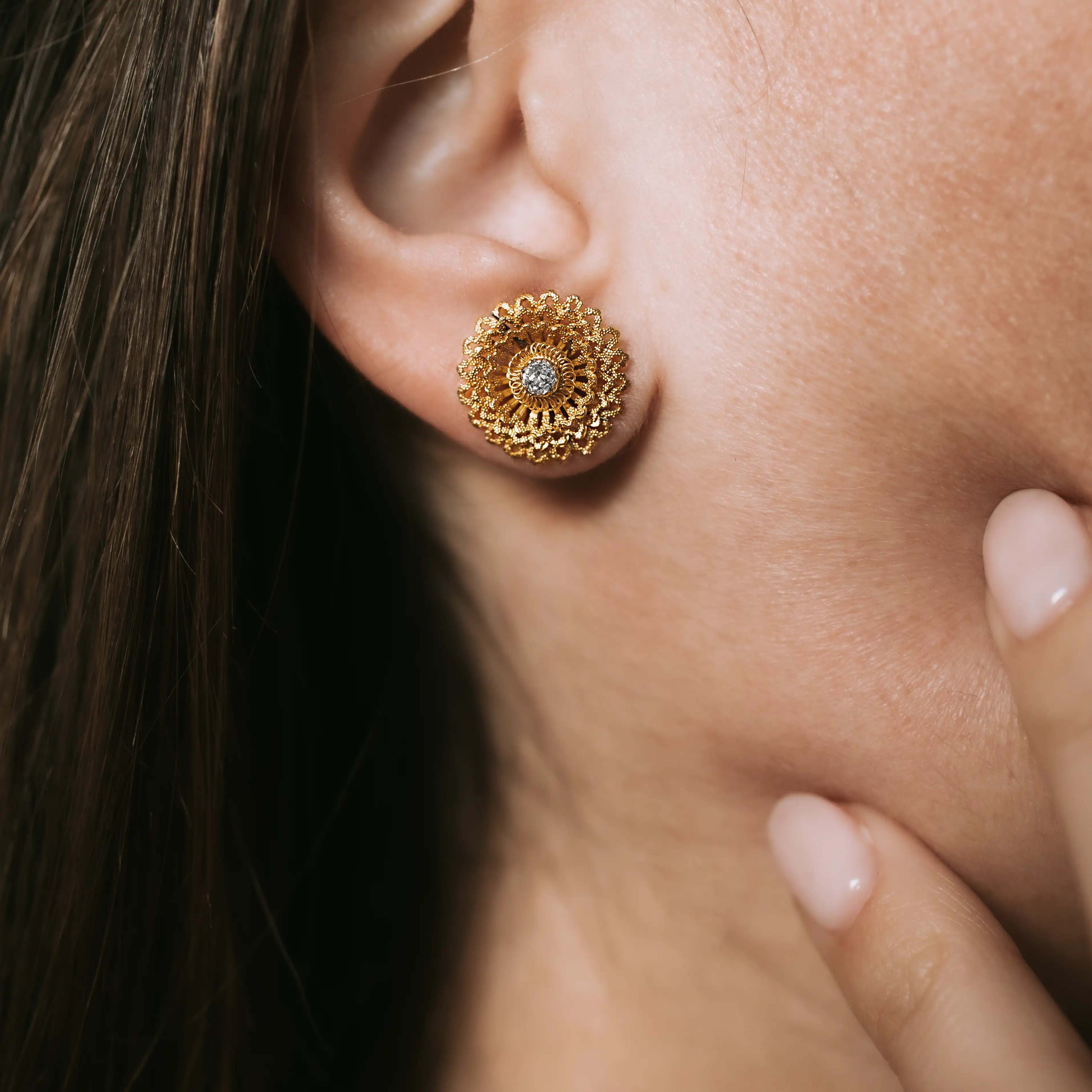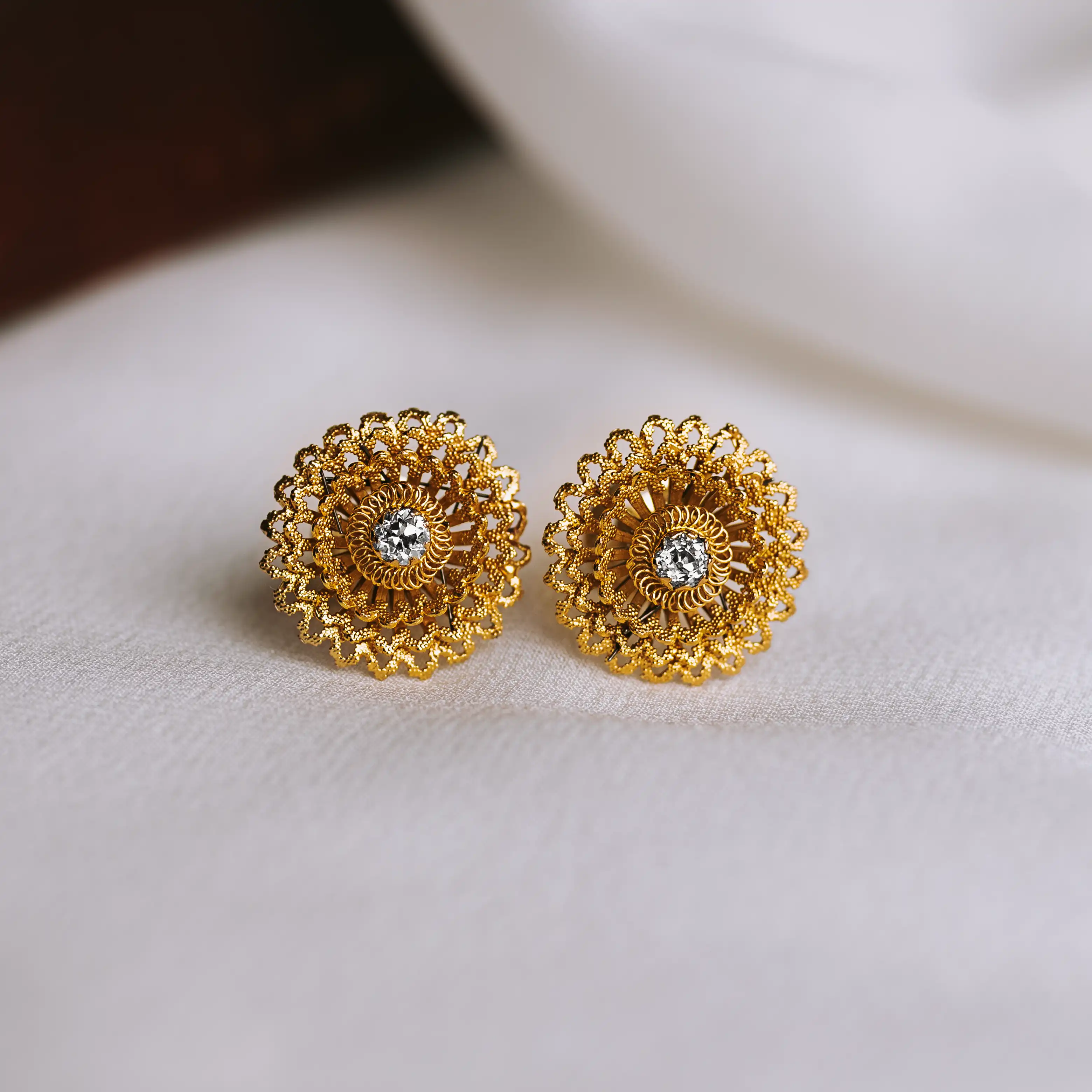 Pendientes vintage de magnífico trabajo en filigrana de oro con dos diamantes talla antigua.