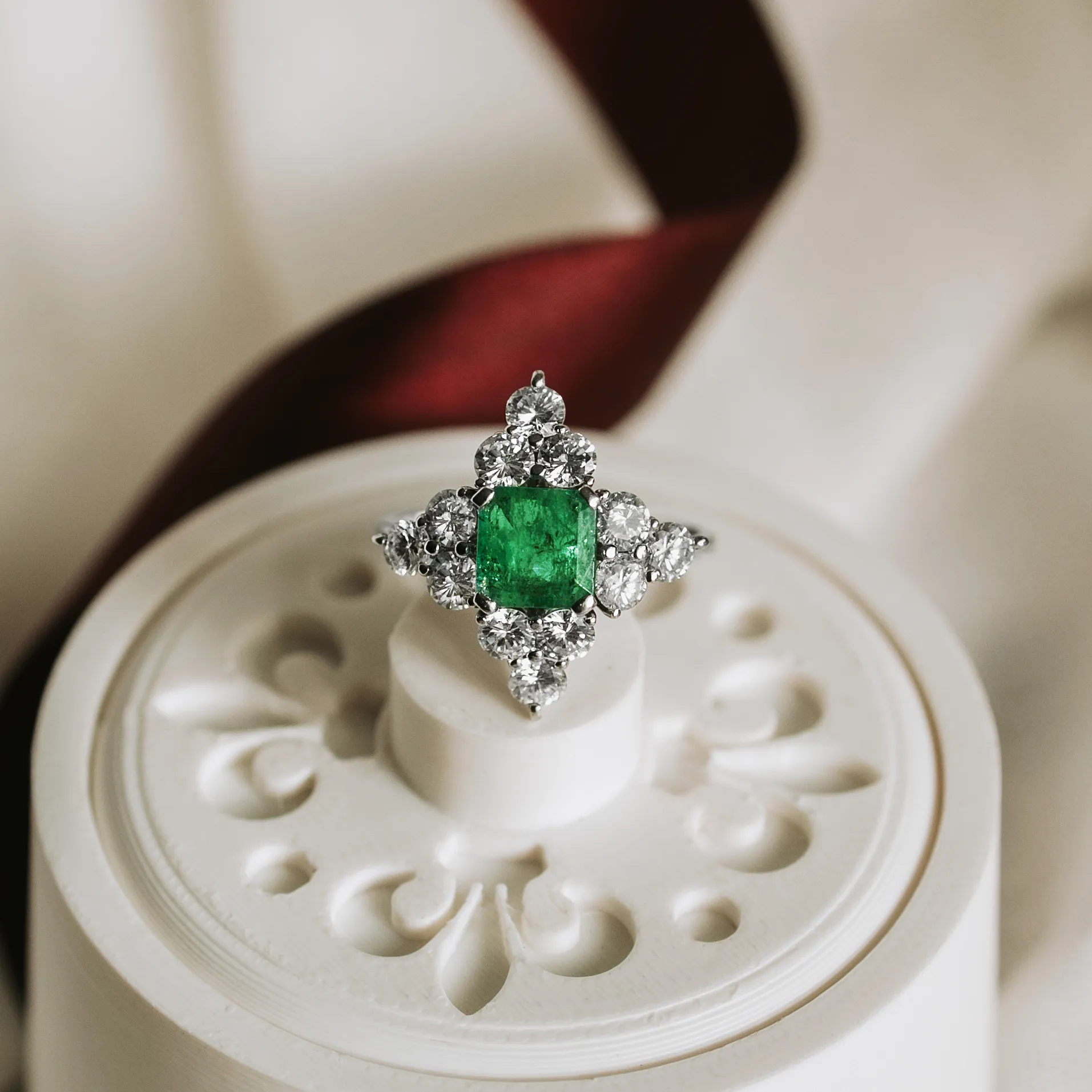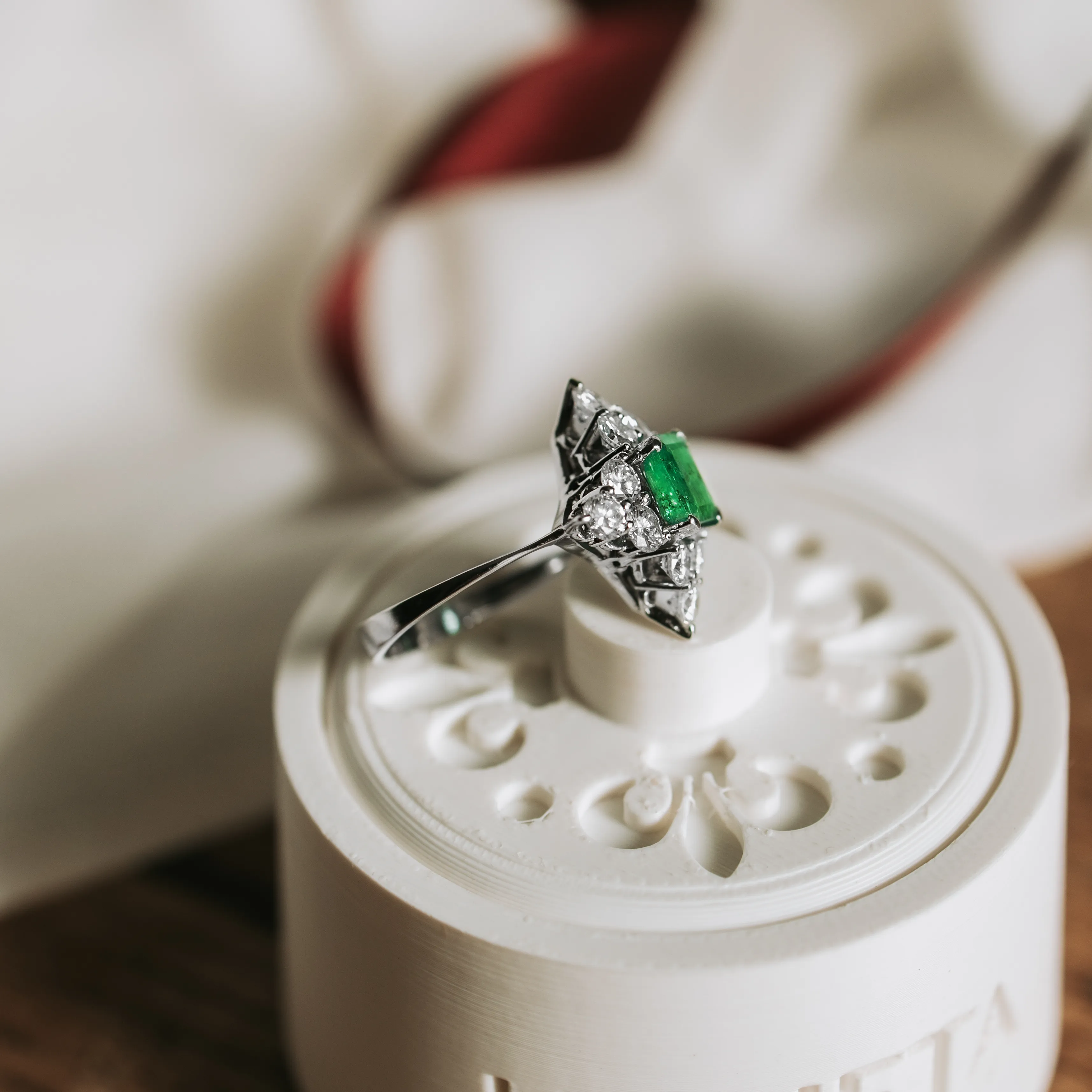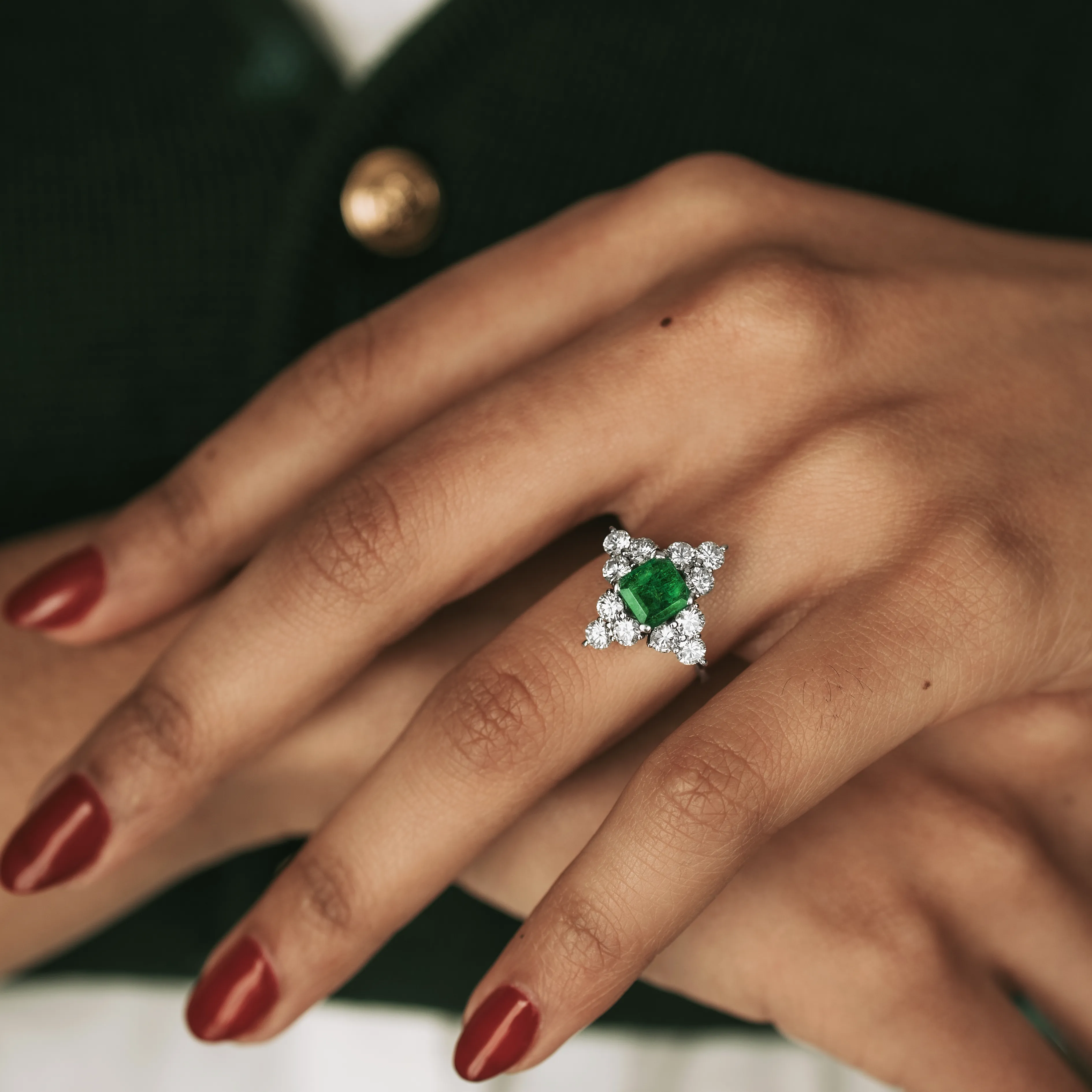 Roseta vintage de oro blanco con esmeralda en su talla y 12 diamantes en orla talla brillante.