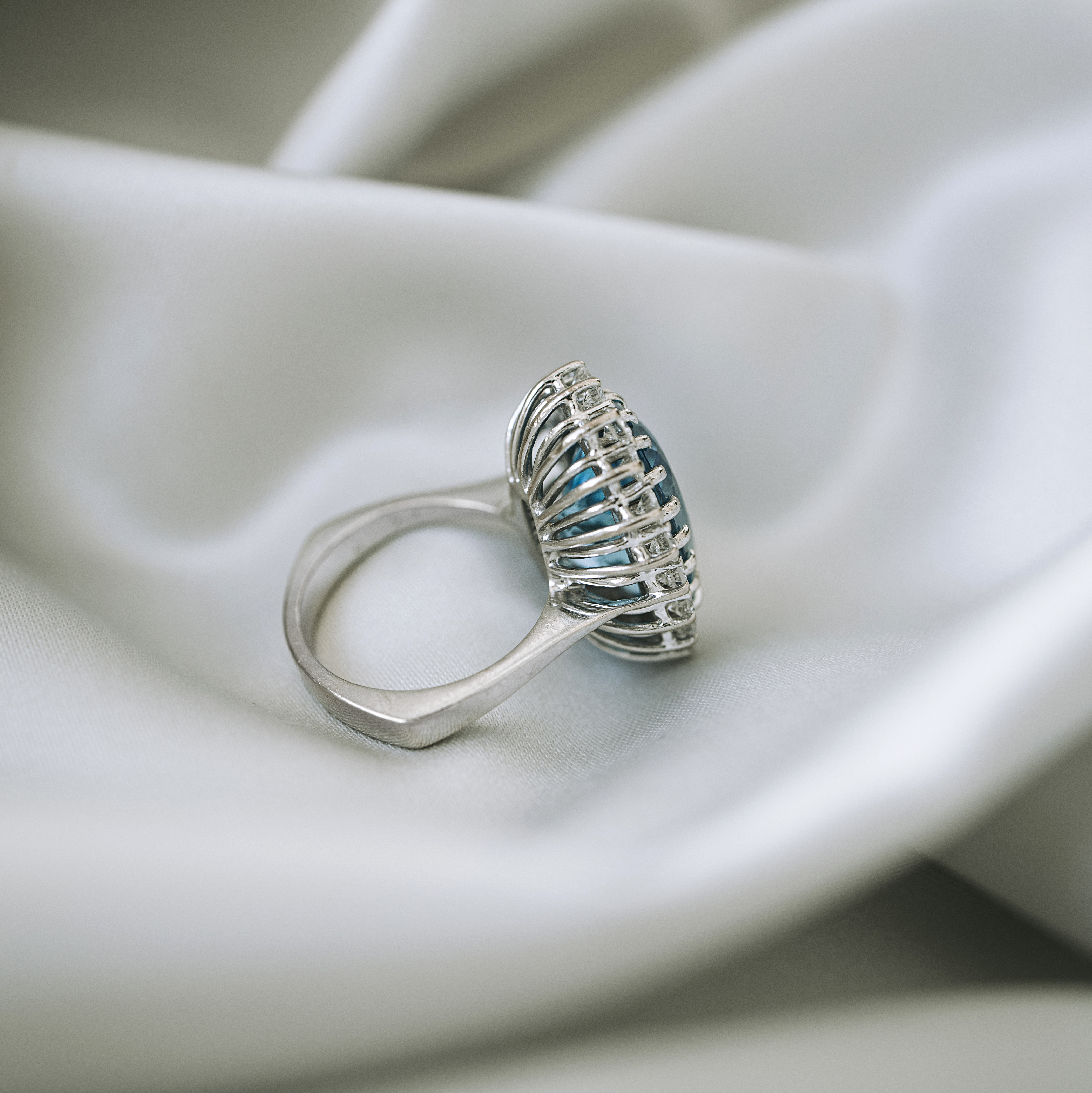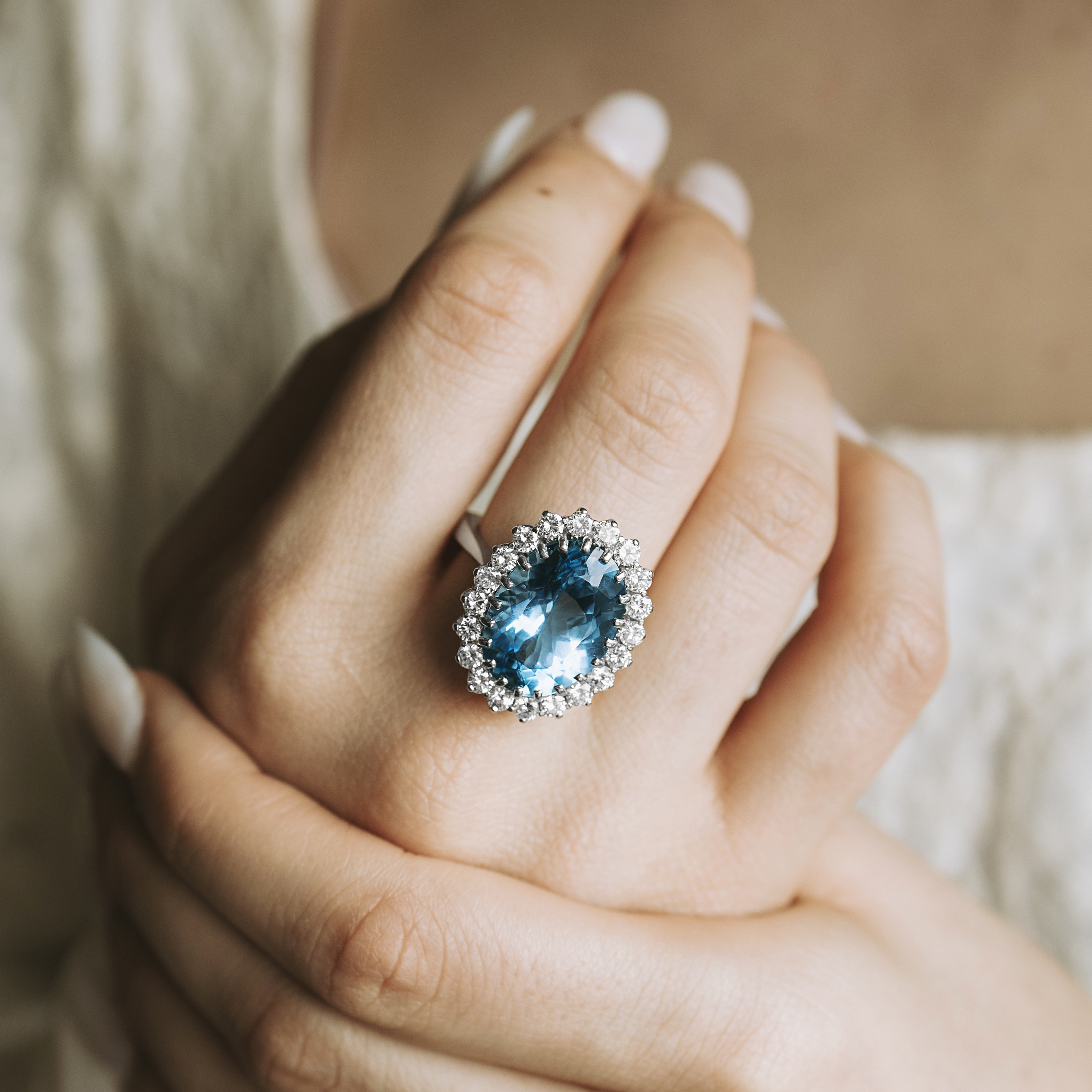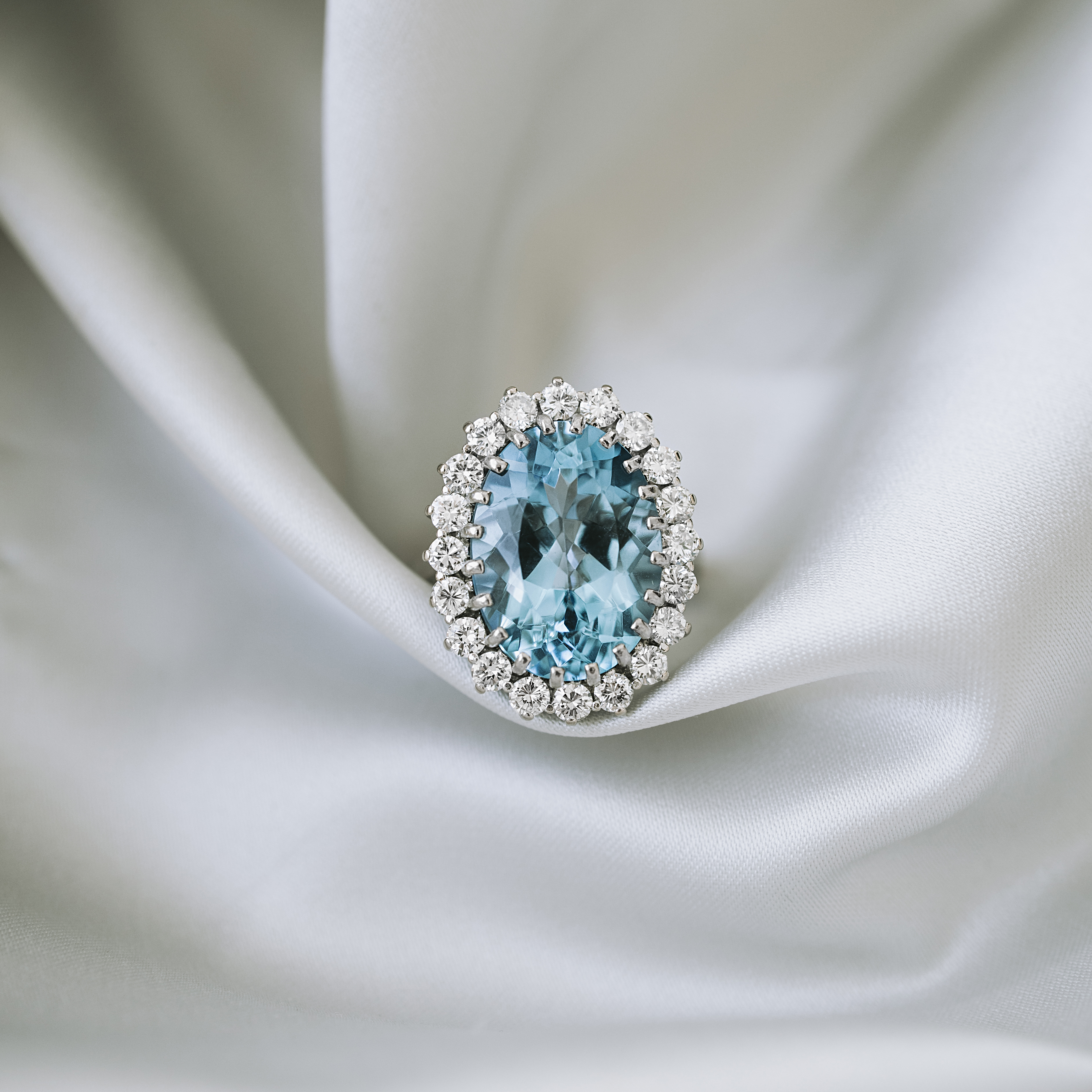 Roseta vintage de oro blanco con gran topacio talla oval y orla de 20 diamantes talla brillante.