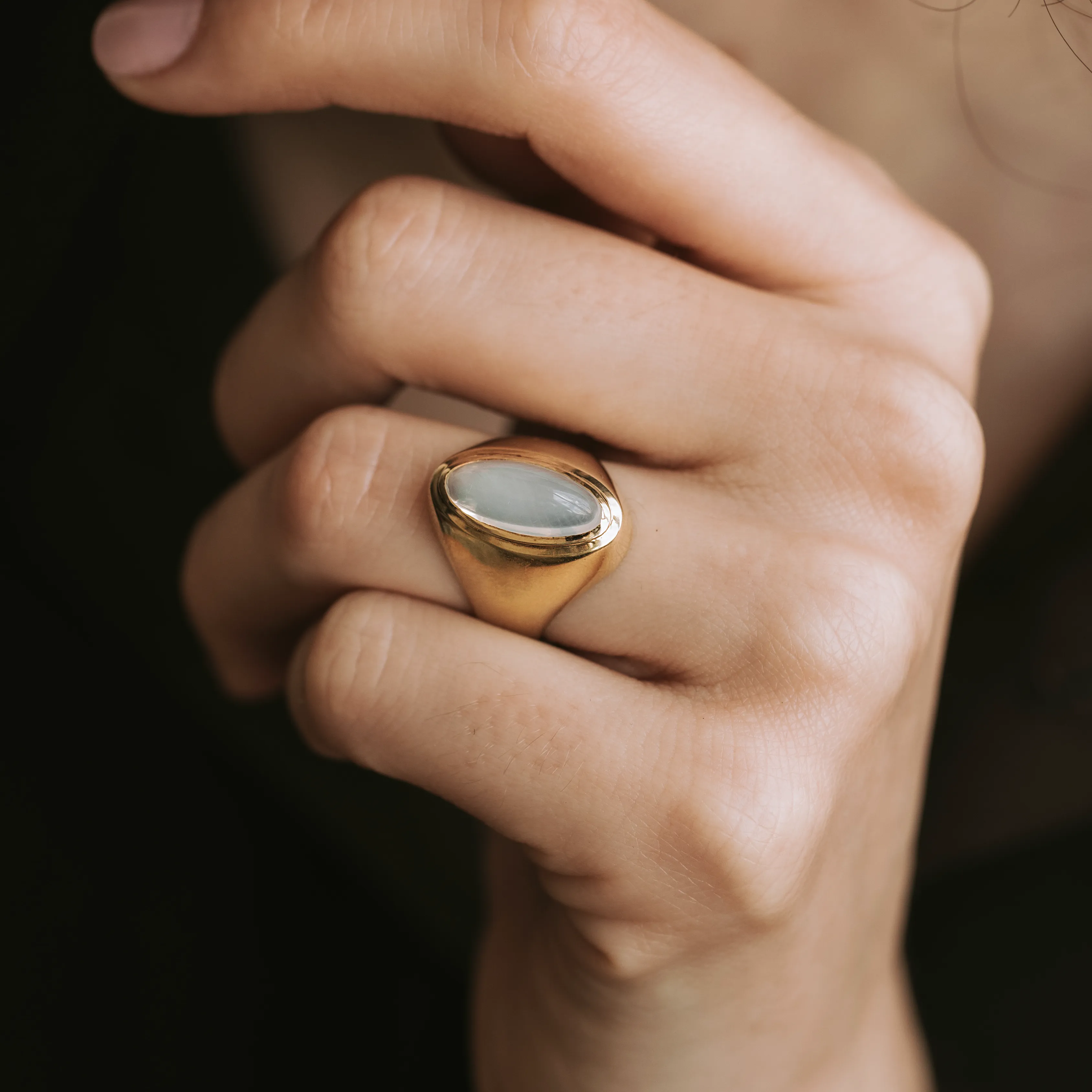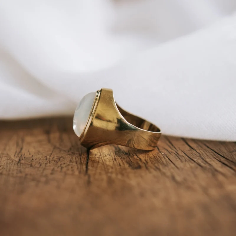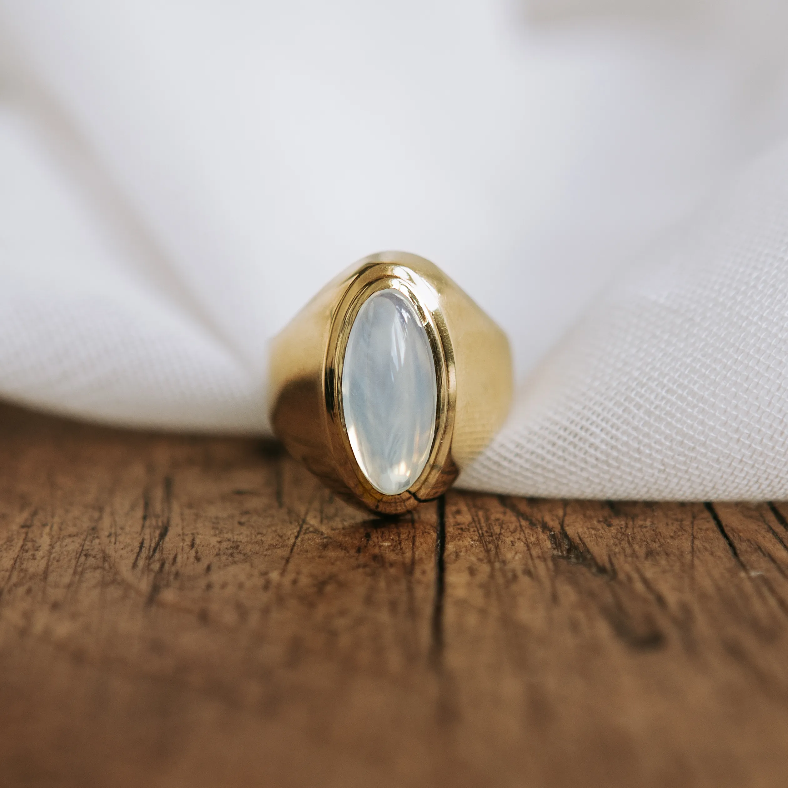 Sortija vintage de oro amarillo con piedra luna talla oval cabujón.