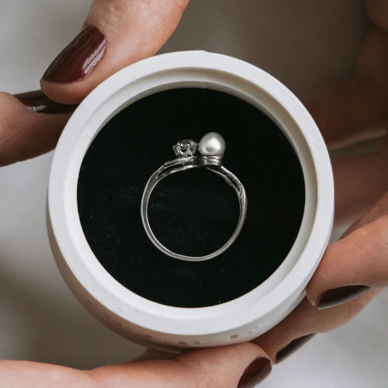 Tú y yo antiguo de platino con diamante talla antigua, perla Akoya y otros 10 diamantes talla antigua en brazos.