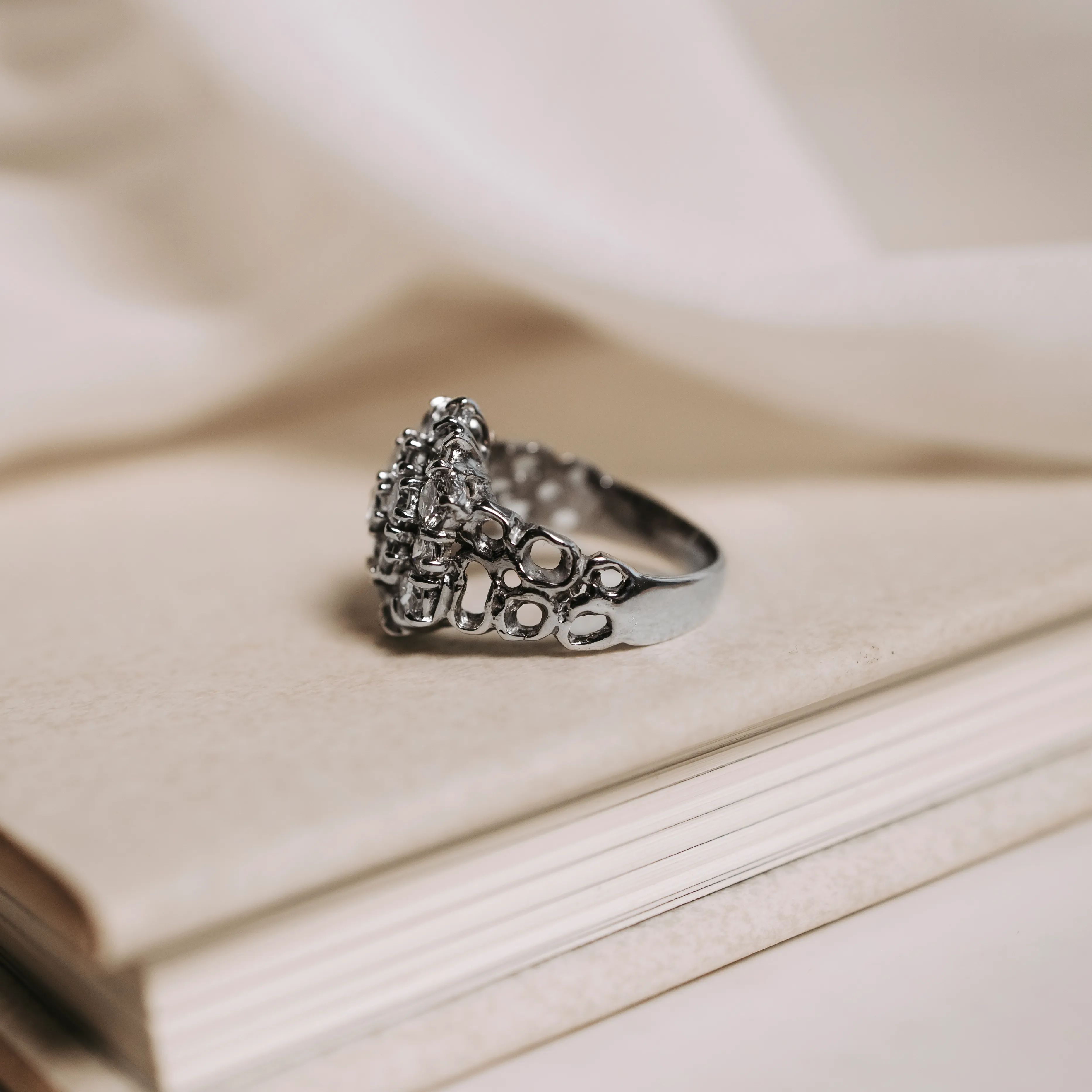 Rosetón vintage de oro blanco con 19 diamantes talla brillante.