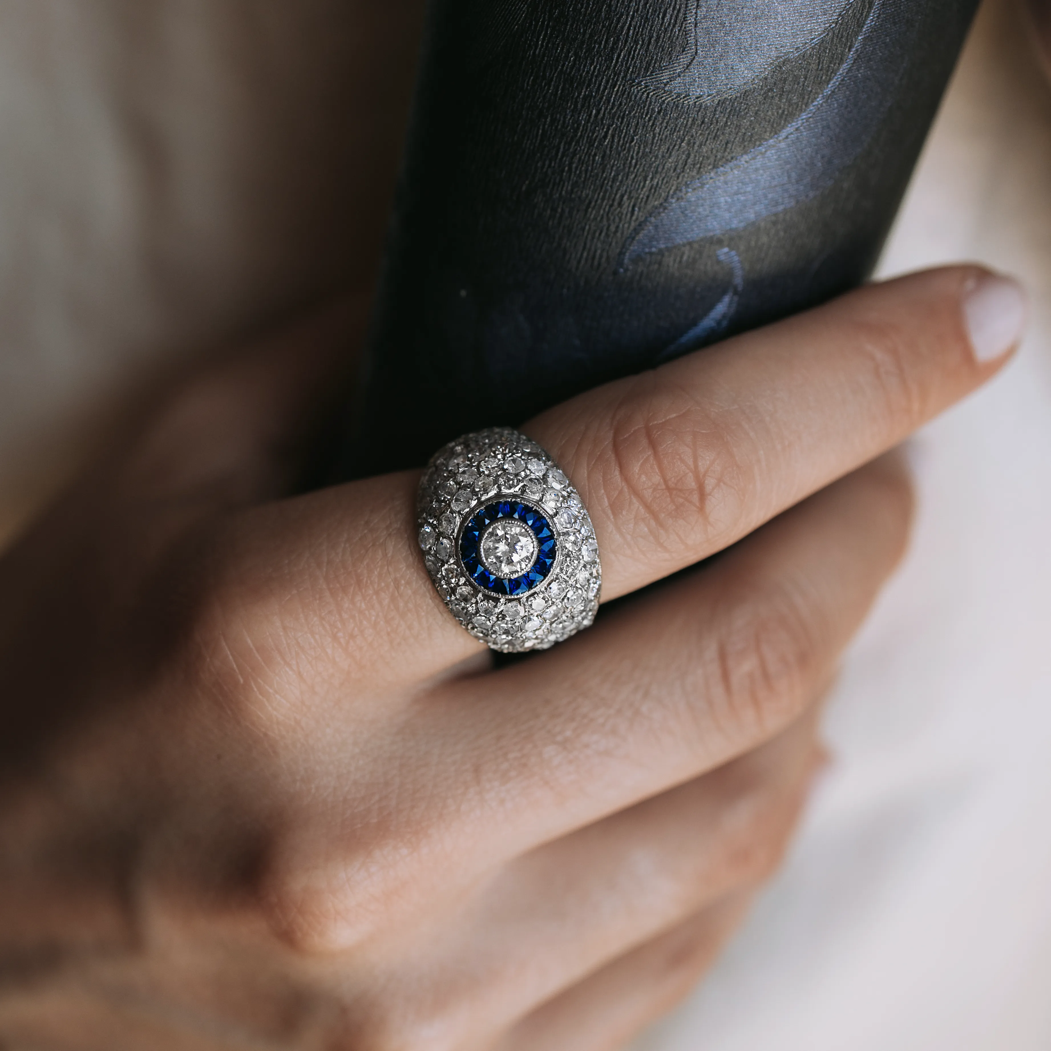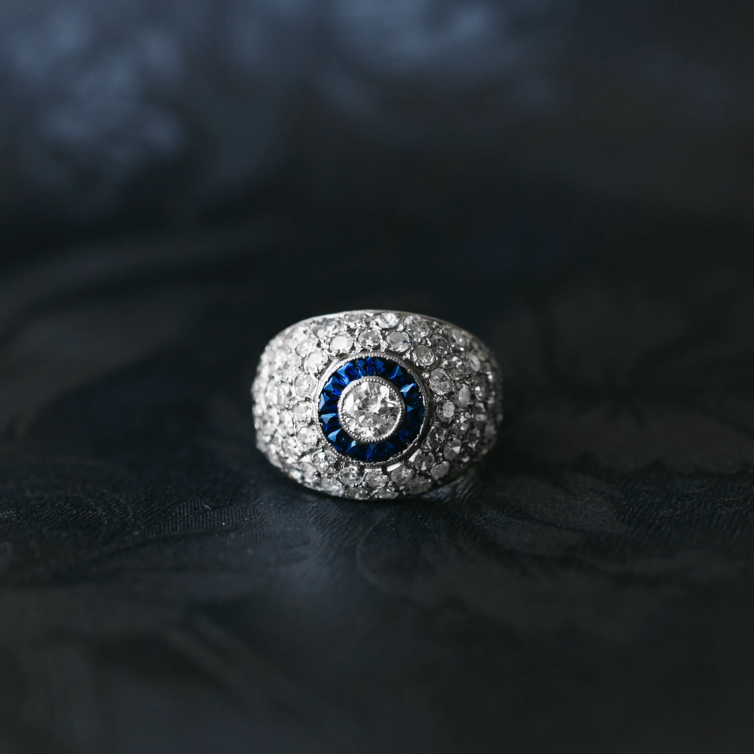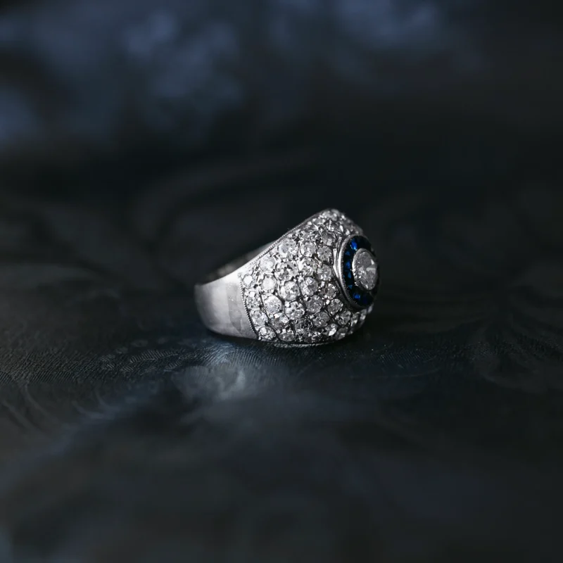 Gran sortija bombé de platino con ojo de perdiz con diamante talla brillante, orla de zafiros y pavé con 66 diamantes.