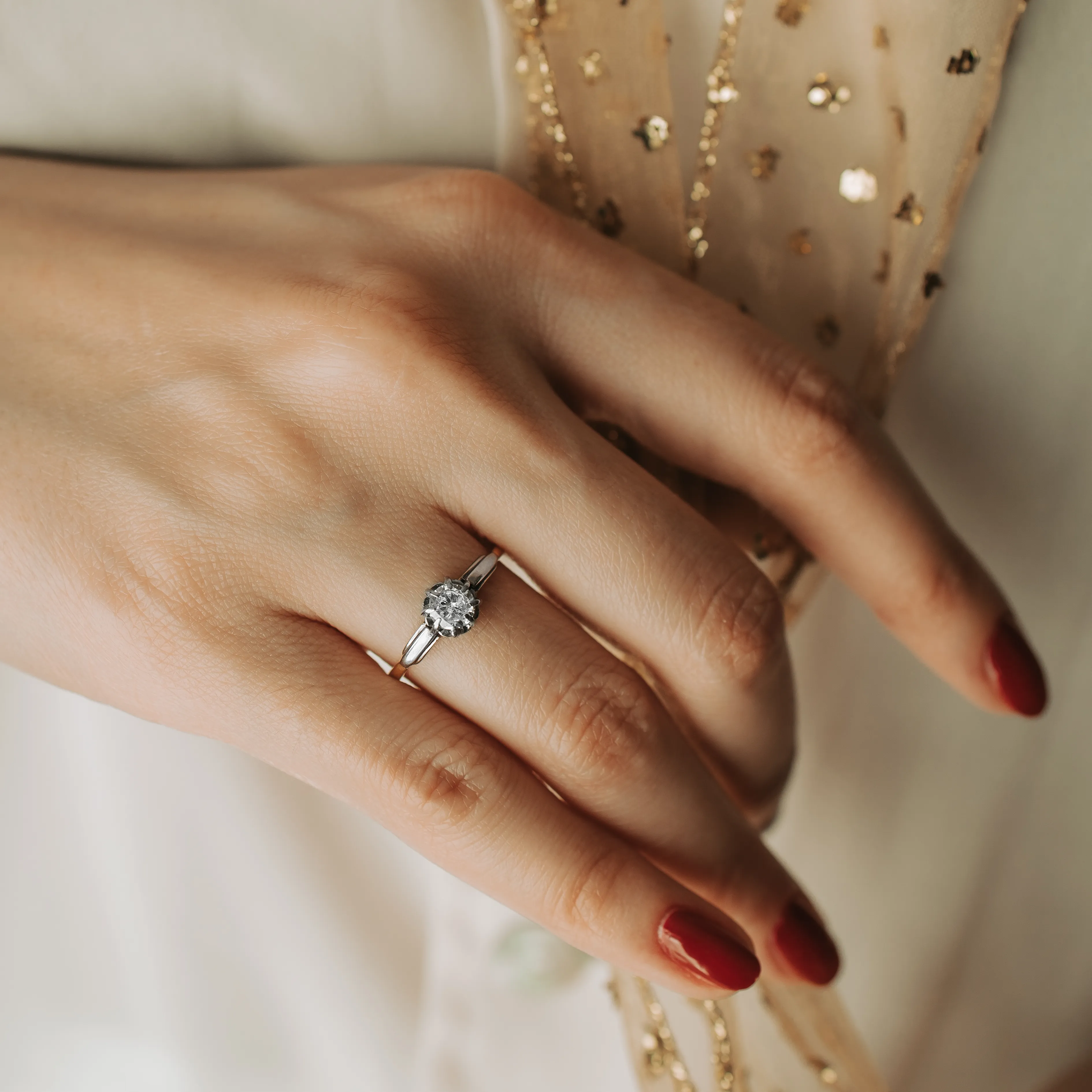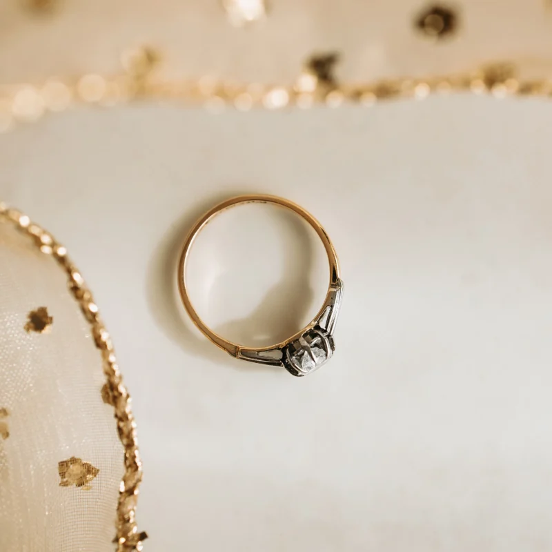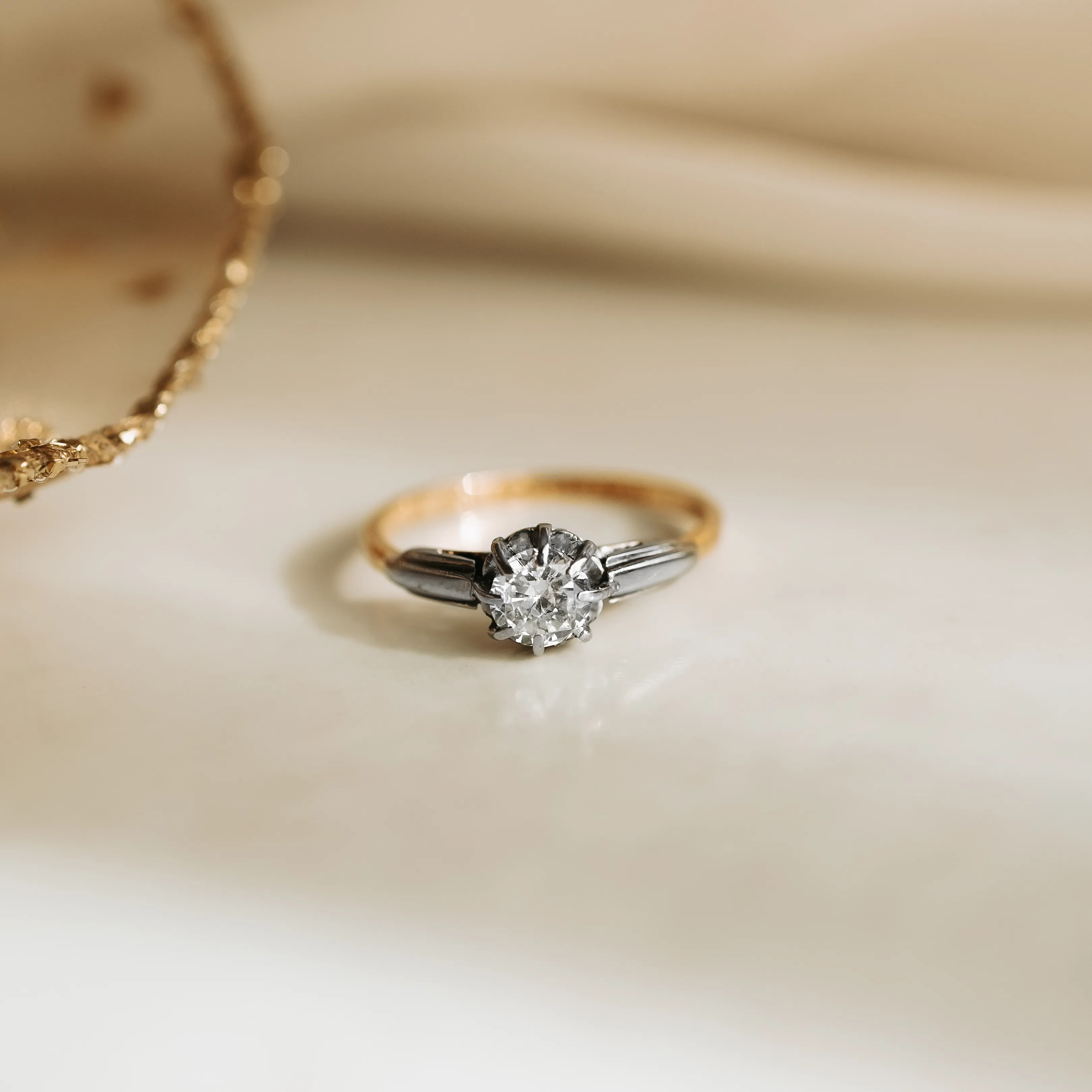 Solitario antiguo de oro amarillo y platino con diamante talla brillante.