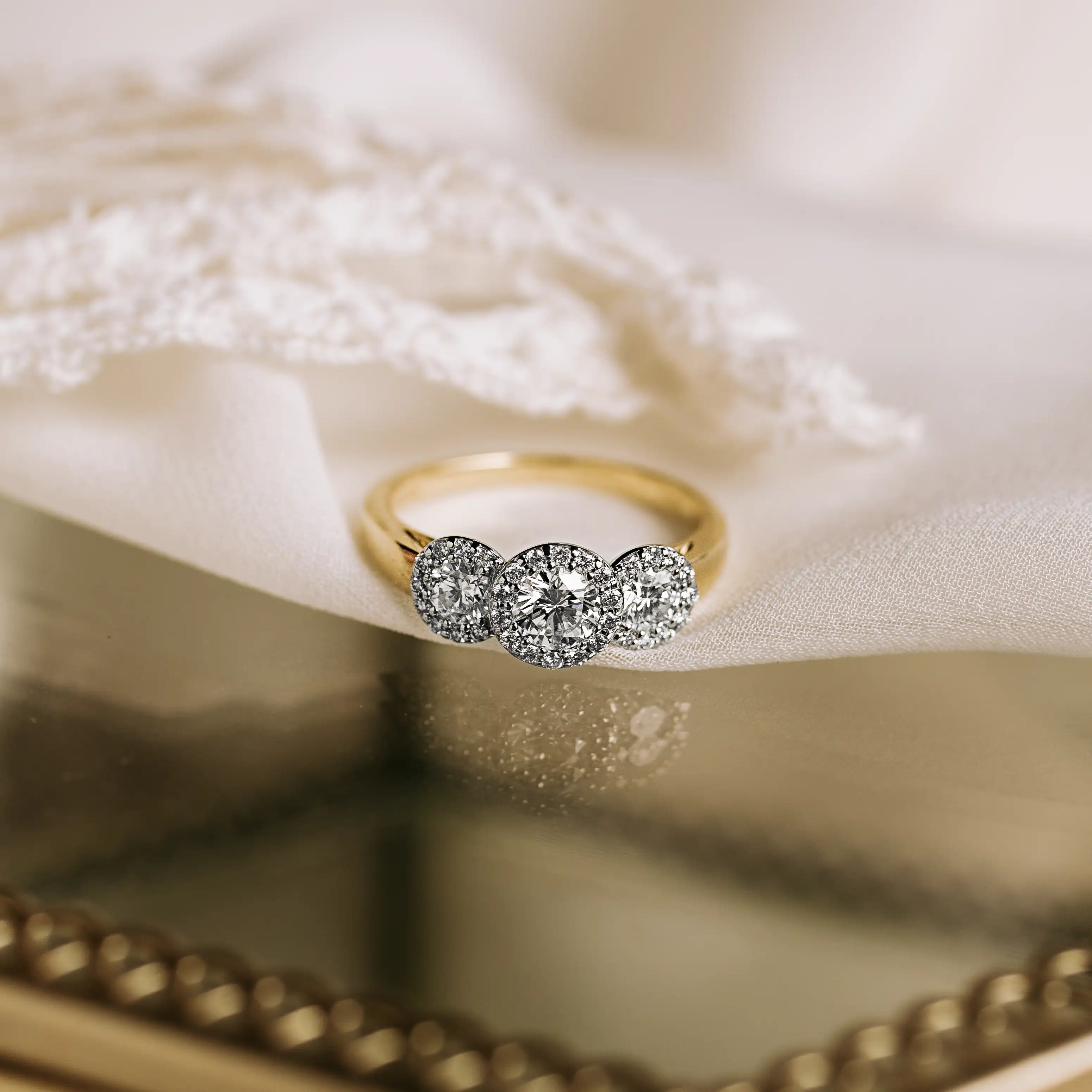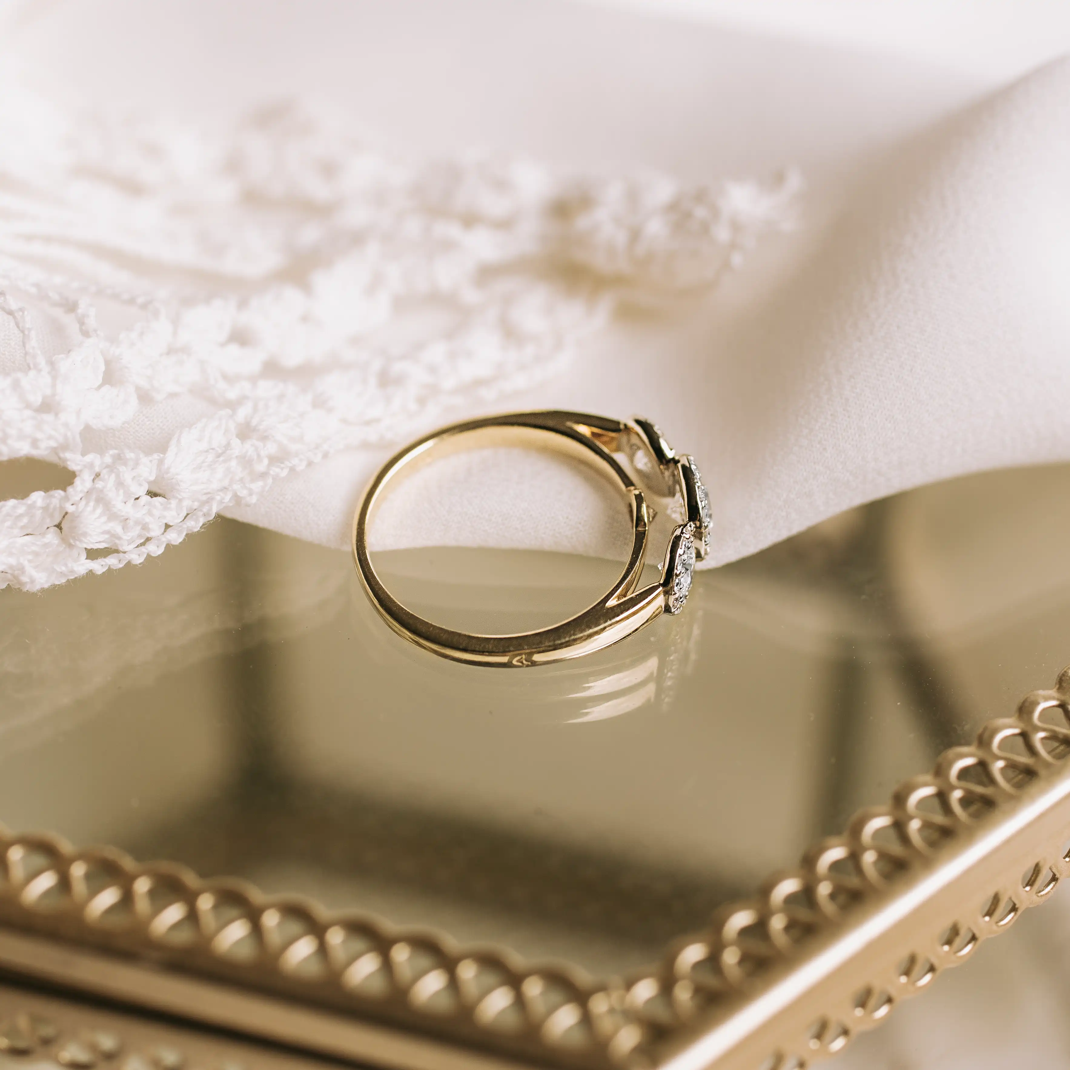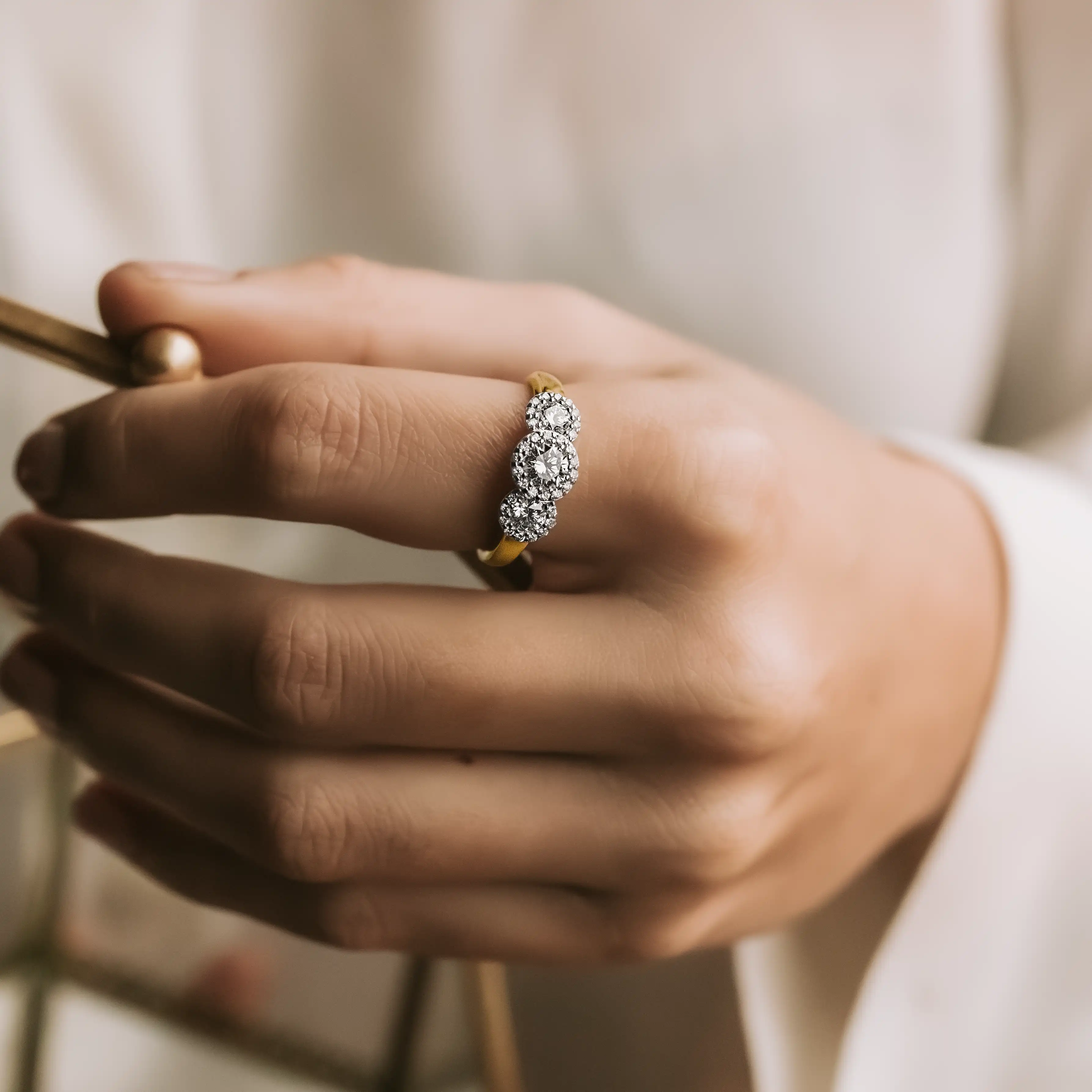 Espectacular tresillo vintage de oro amarillo y blanco con 3 diamantes talla brillante y orlas de 33 diamantes talla brillante.