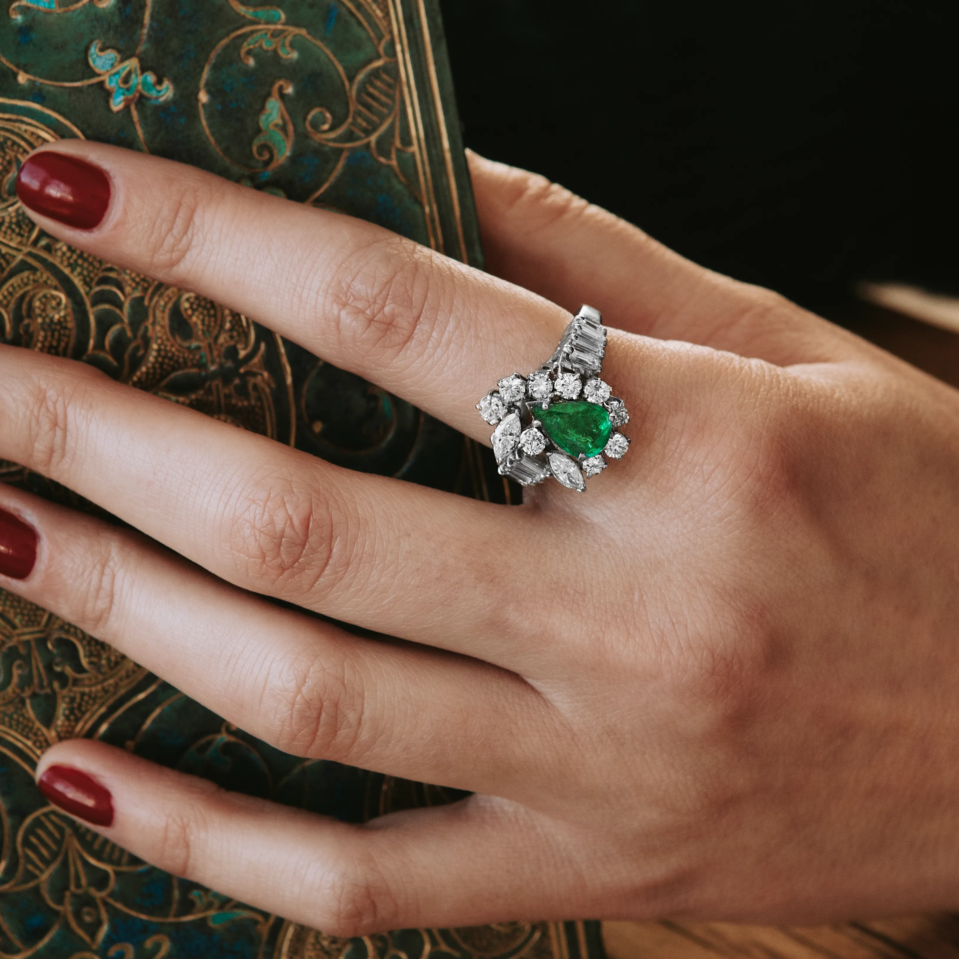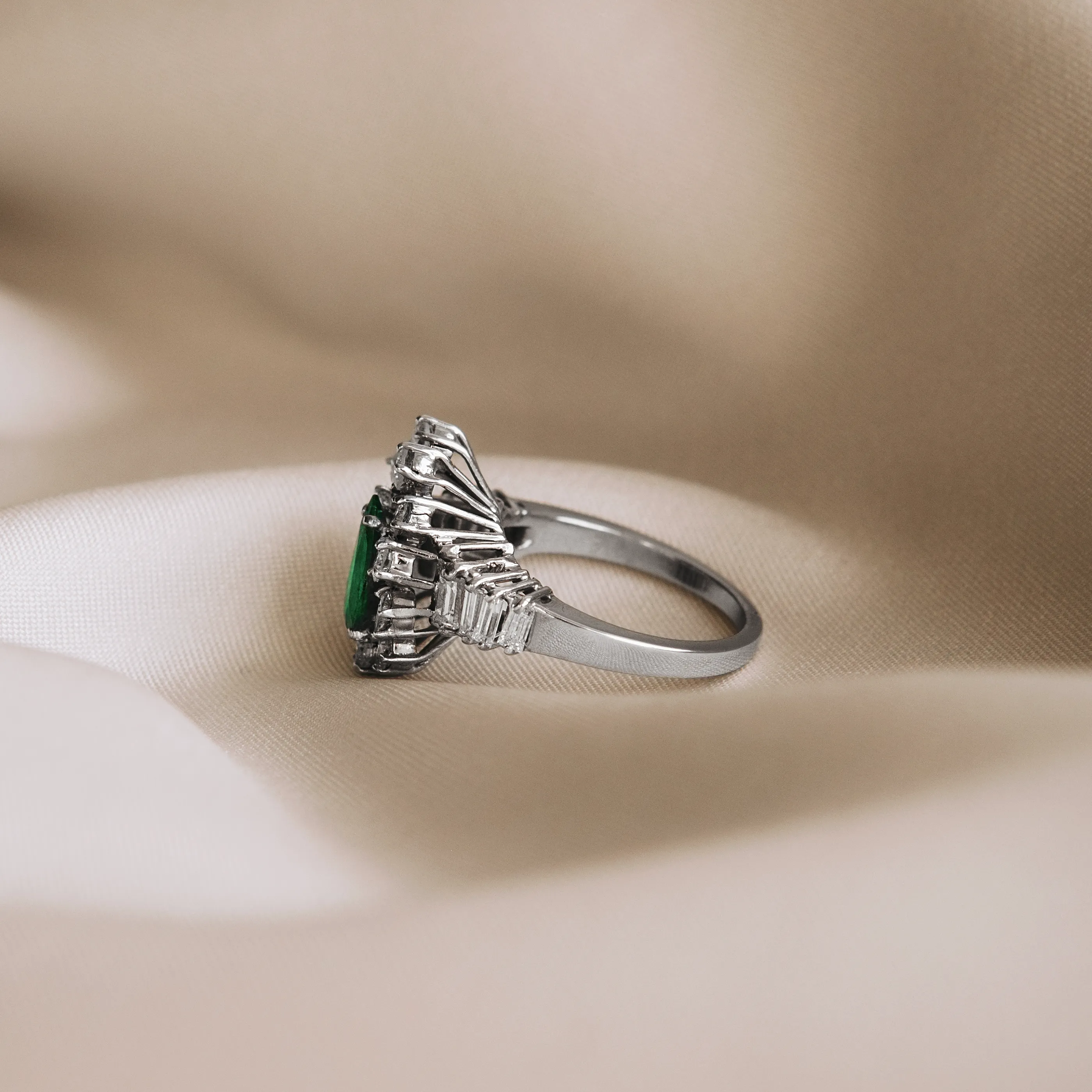 Gran roseta vintage de oro blanco con esmeralda talla pera y orla y brazos con 9 diamantes talla brillante, 2 diamantes talla marquesa y 8 diamantes talla baguette.
