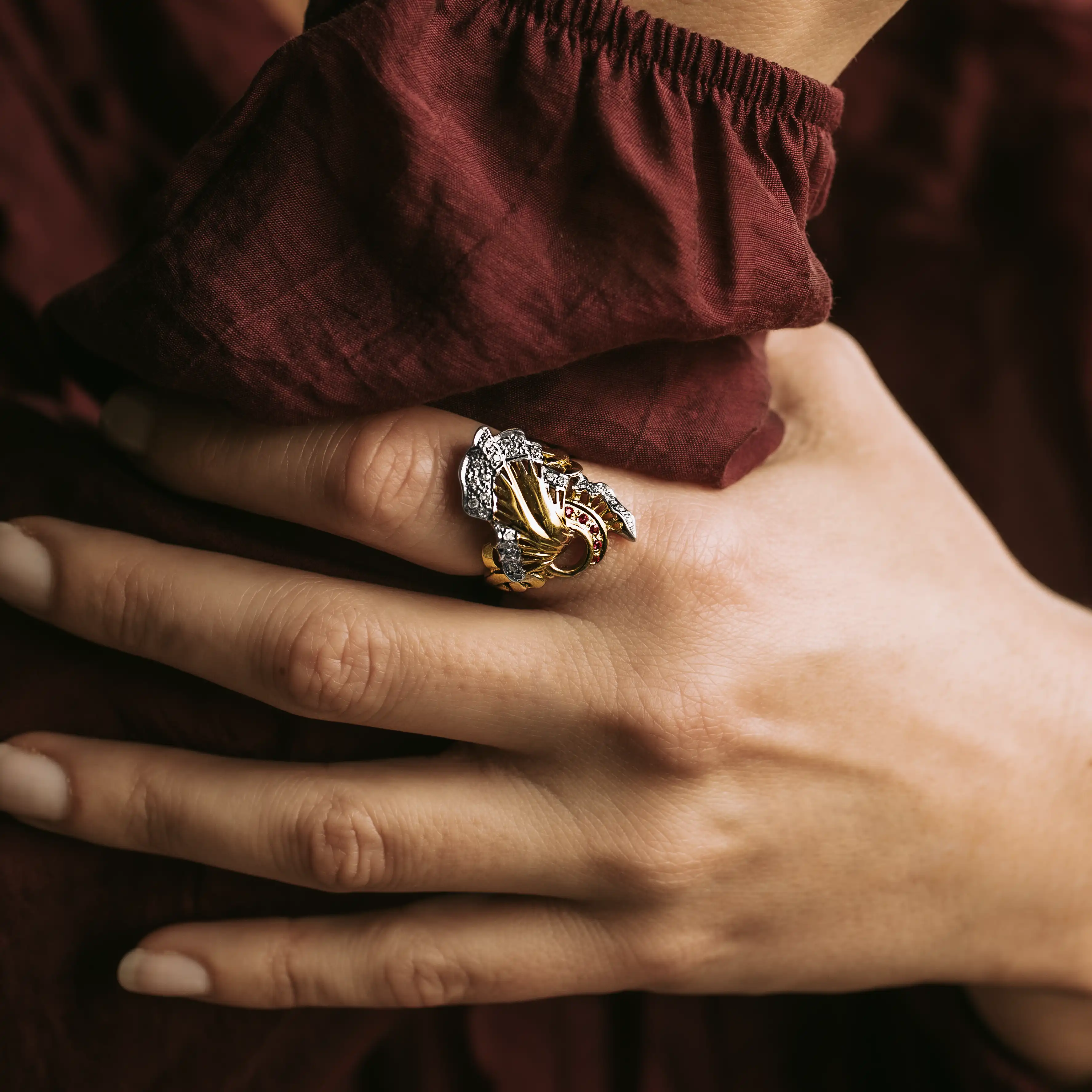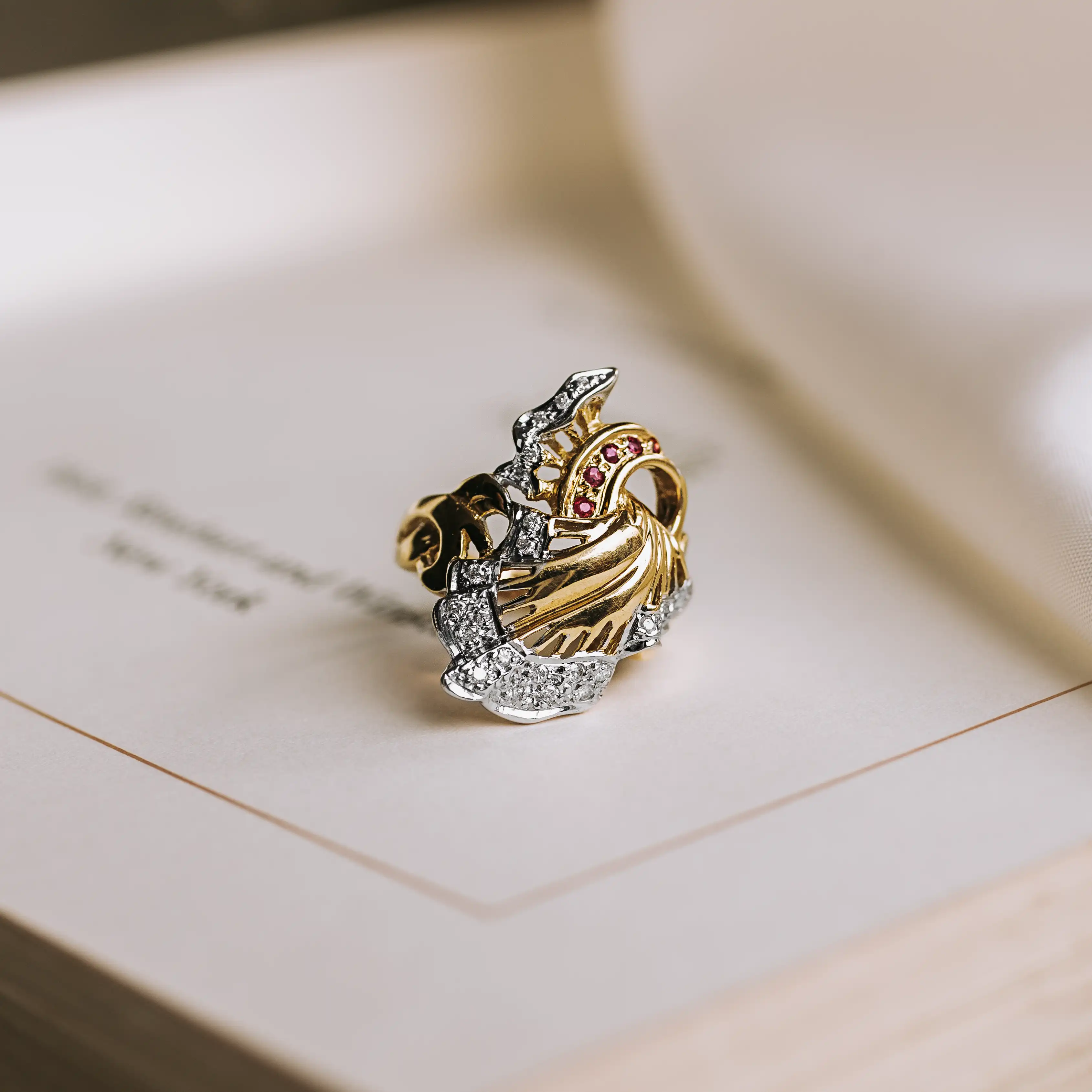 Sortija chevalier de oro amarillo y blanco con 5 rubíes talla redonda y 25 diamantes talla brillante.