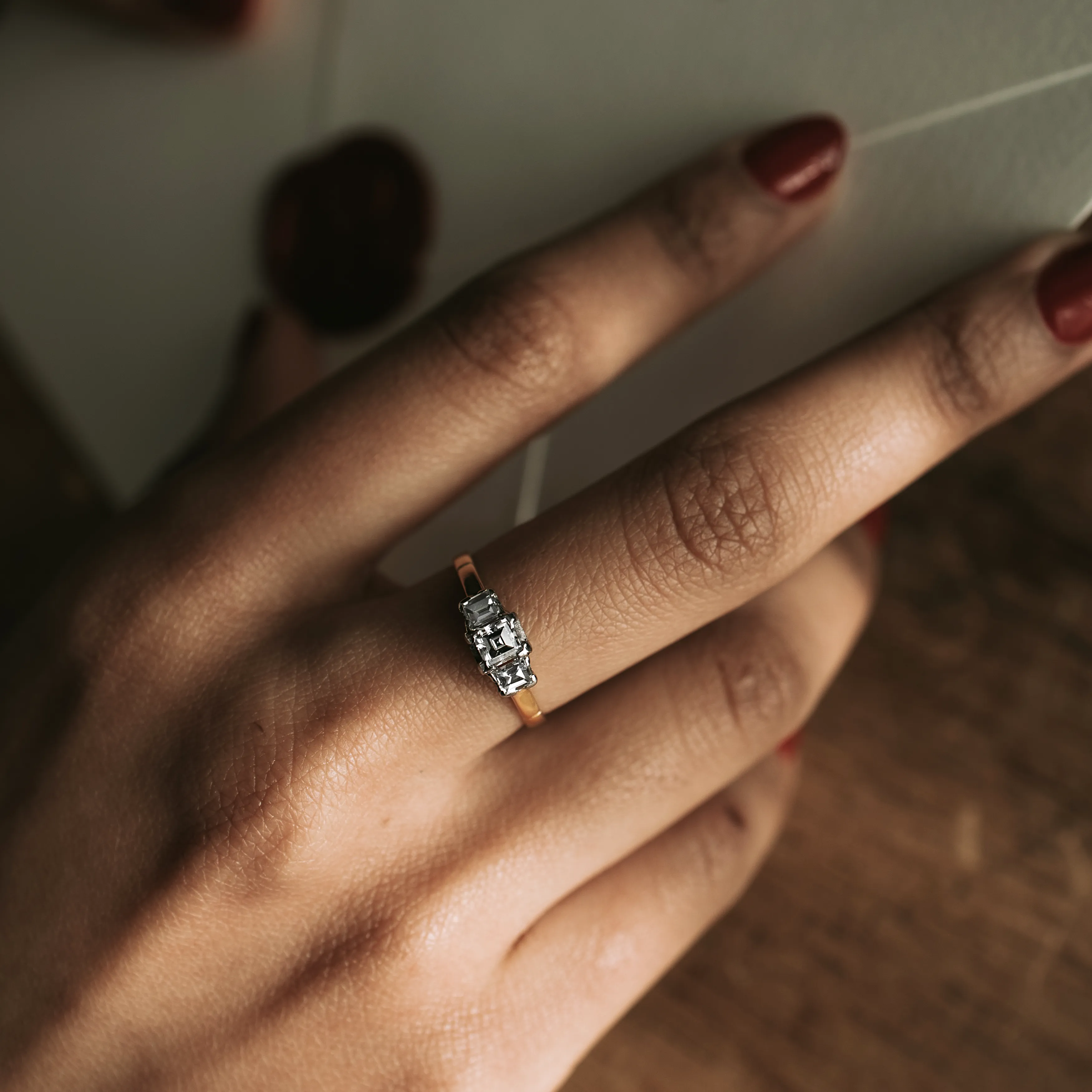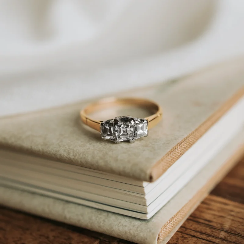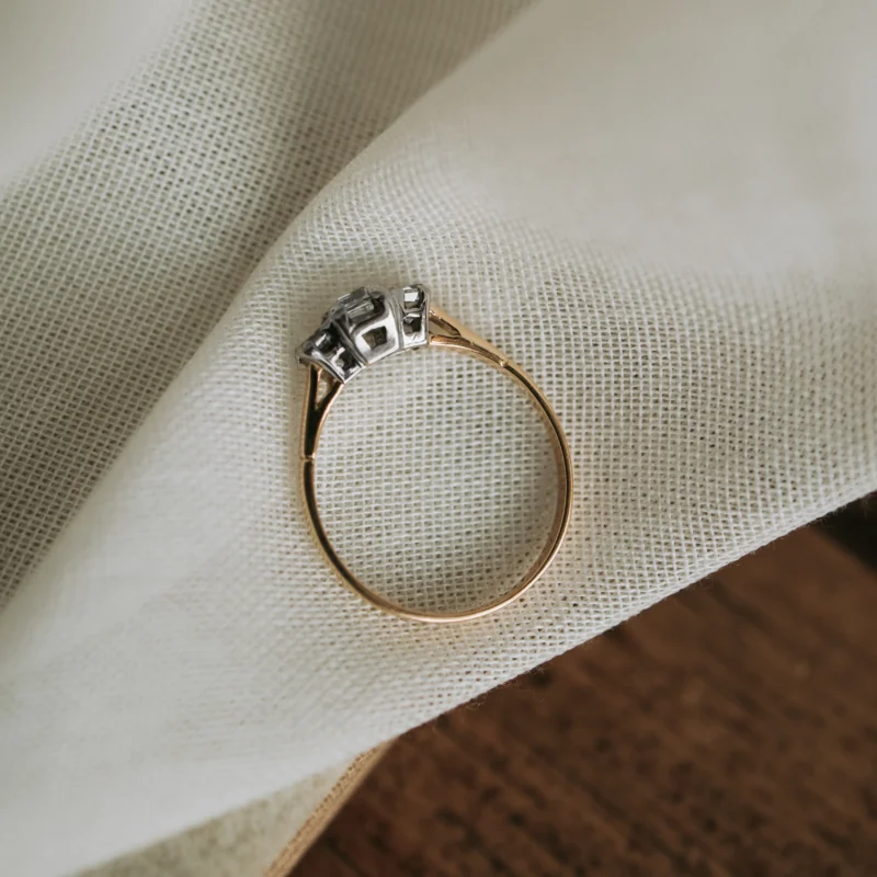 Tresillo vintage de oro amarillo y blanco con diamante talla carré y otros 2 diamantes talla baguette.