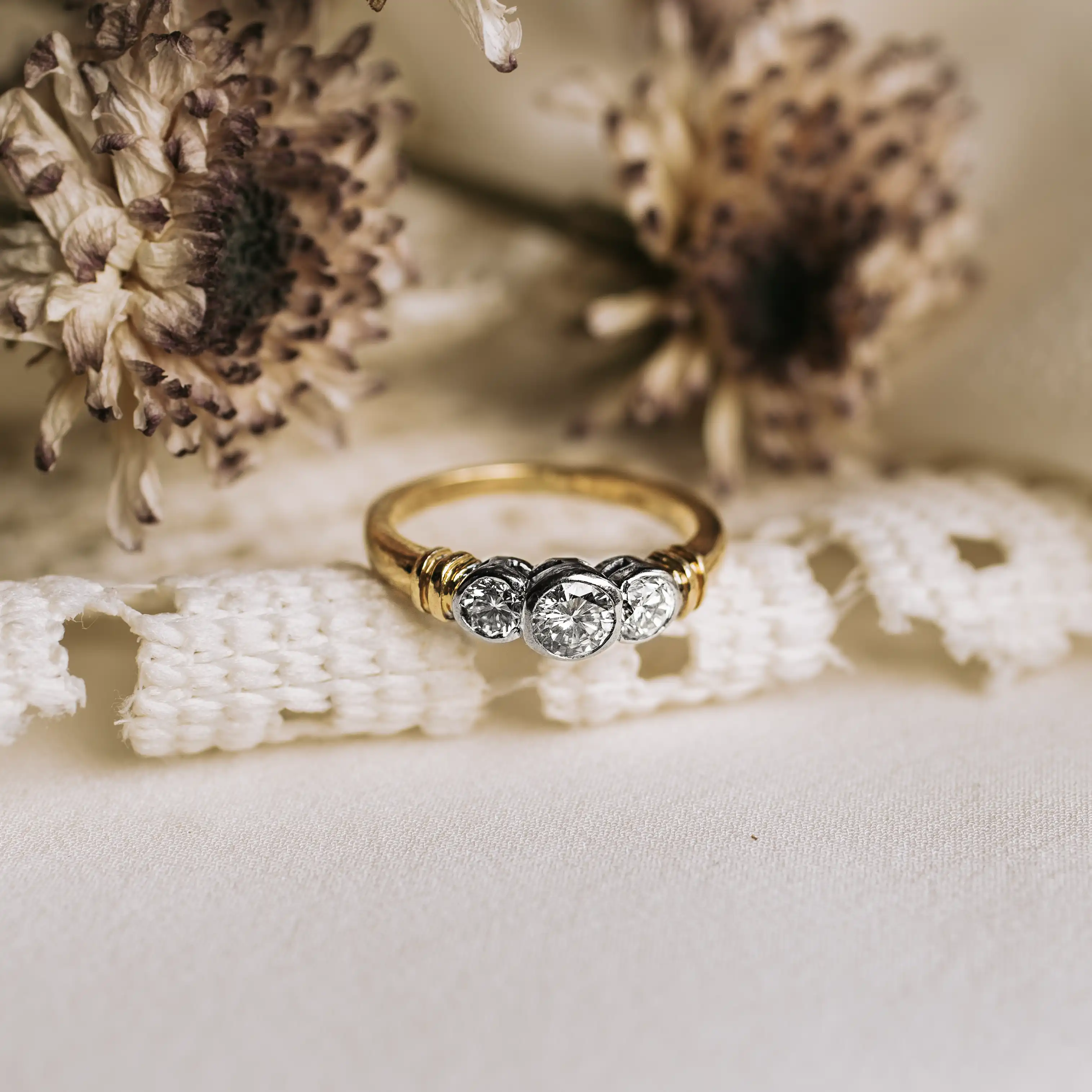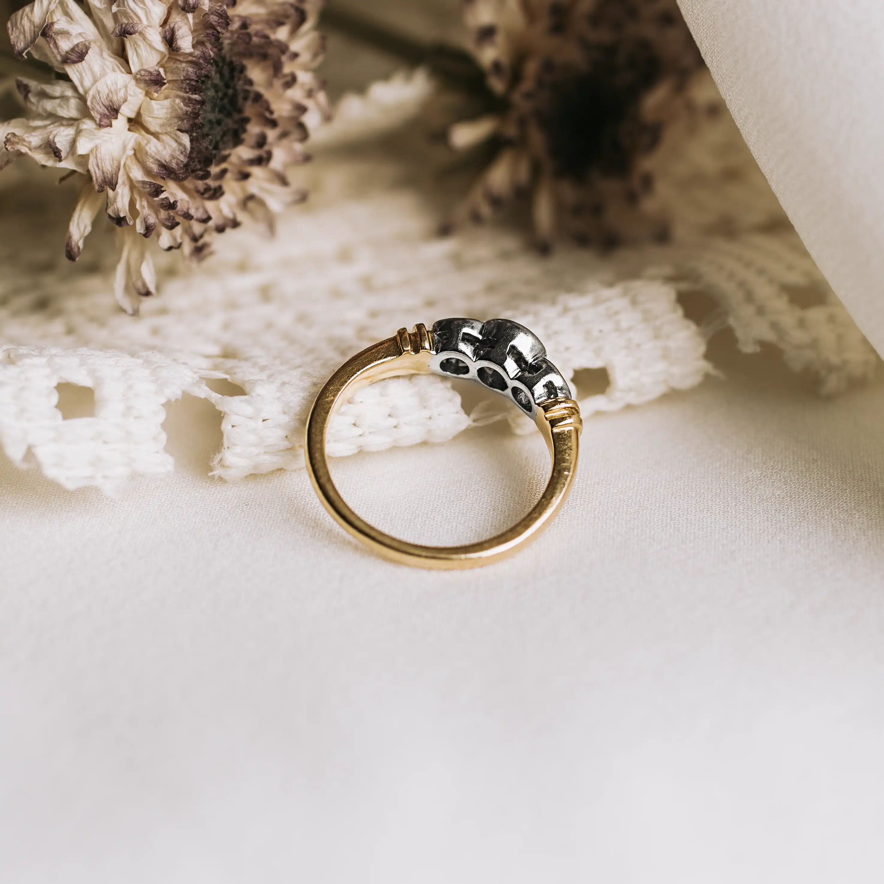 Tresillo vintage de oro amarillo y blanco con tres diamantes talla brillante en chatón.