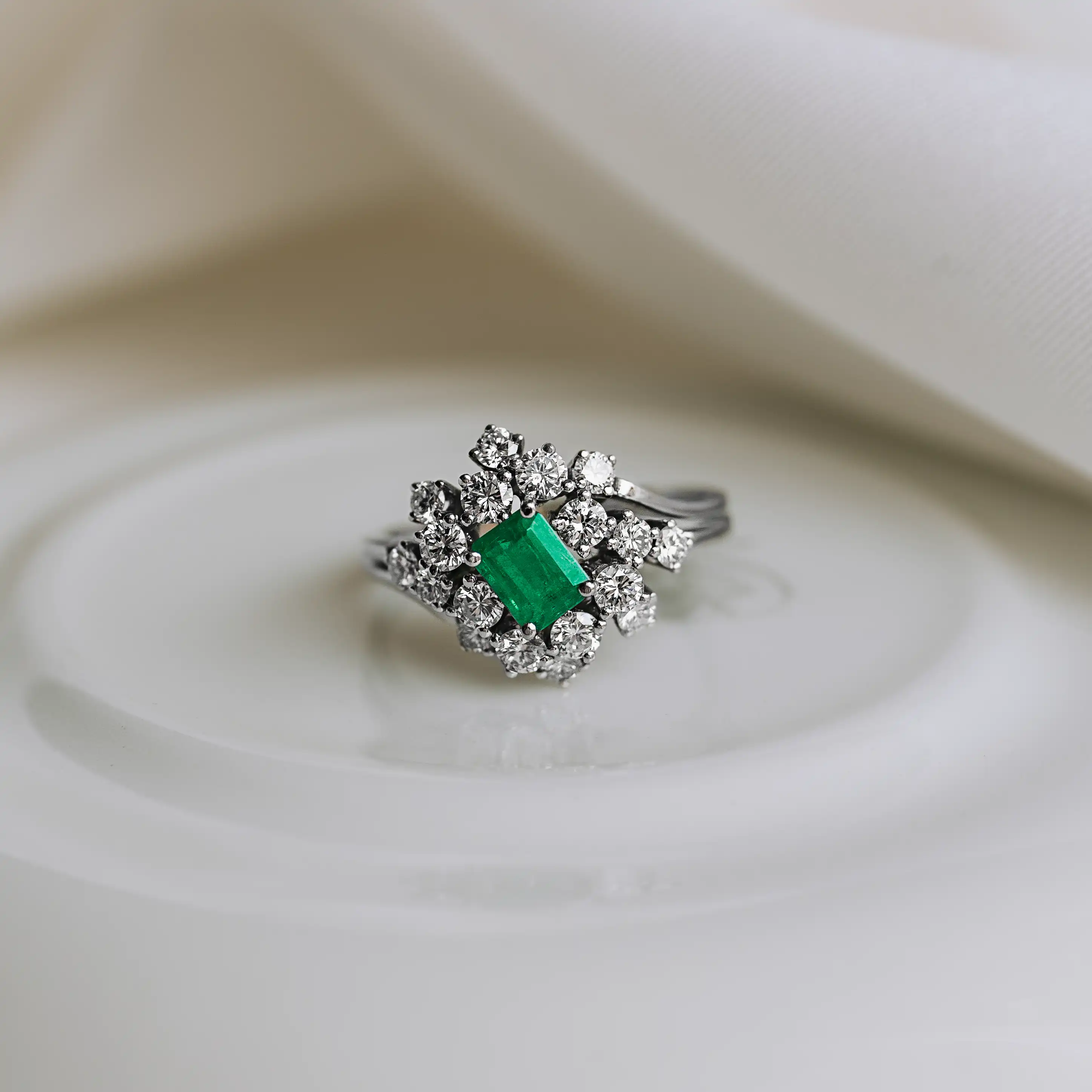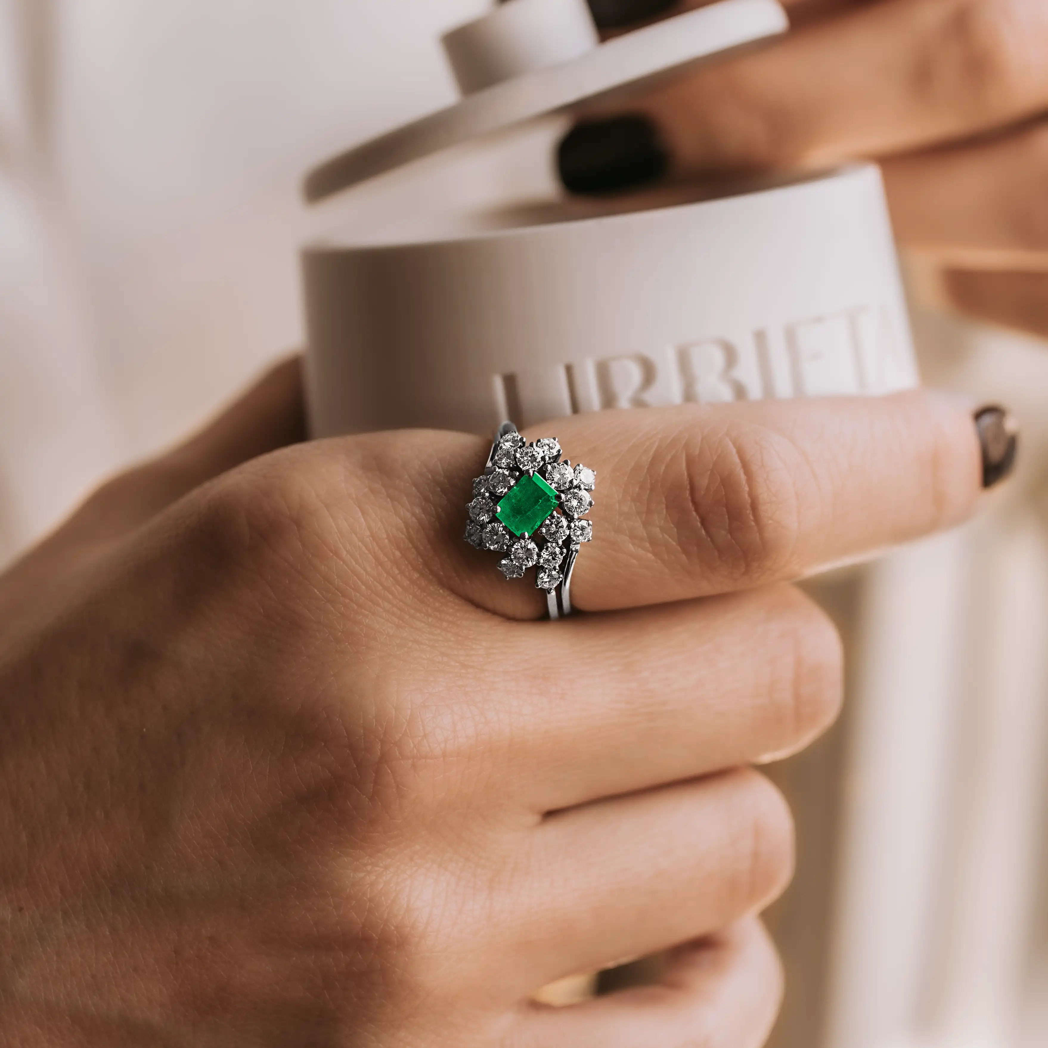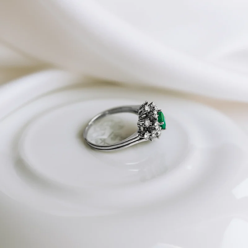 Roseta vintage de oro blanco con esmeralda en su talla y original orla con 18 diamantes talla brillante.