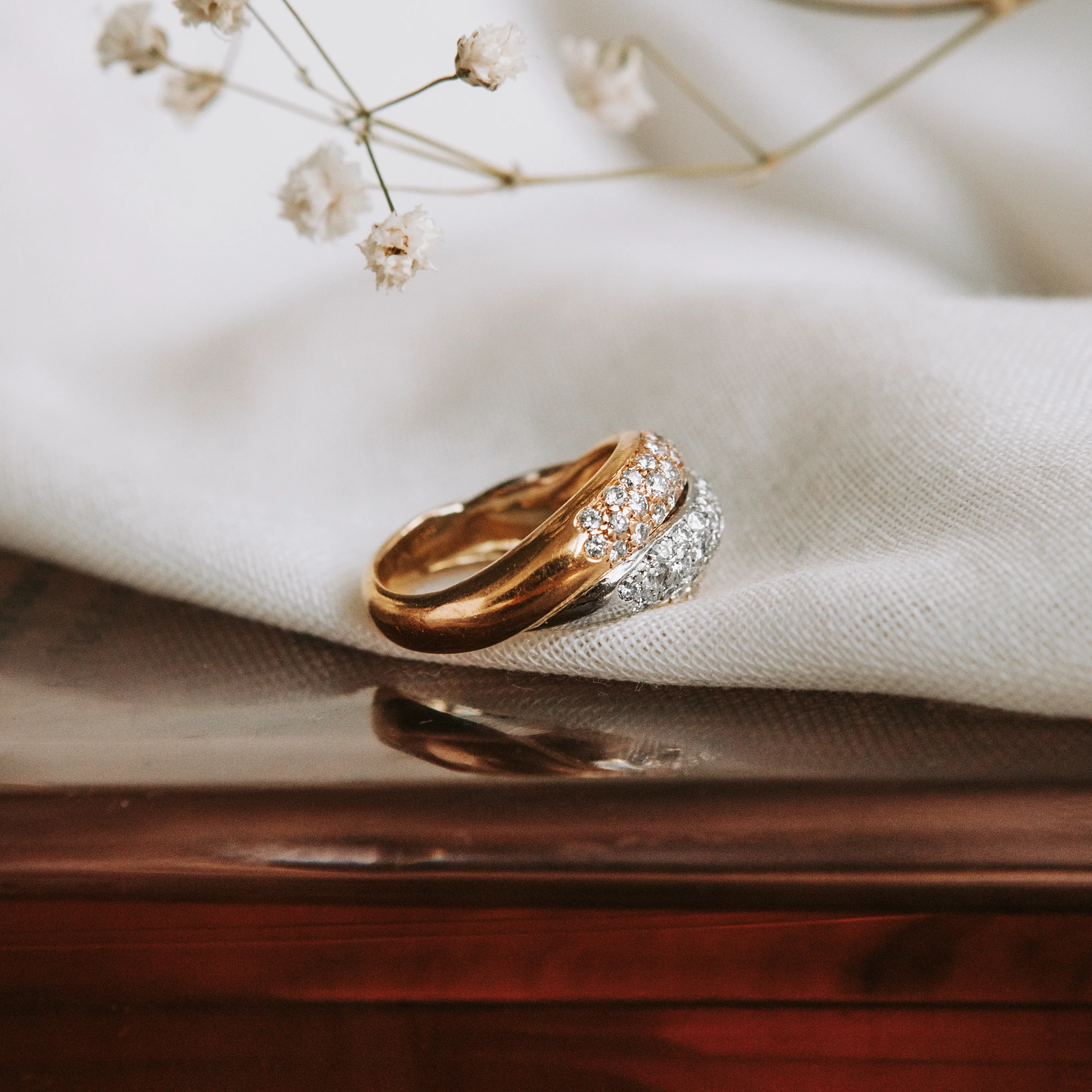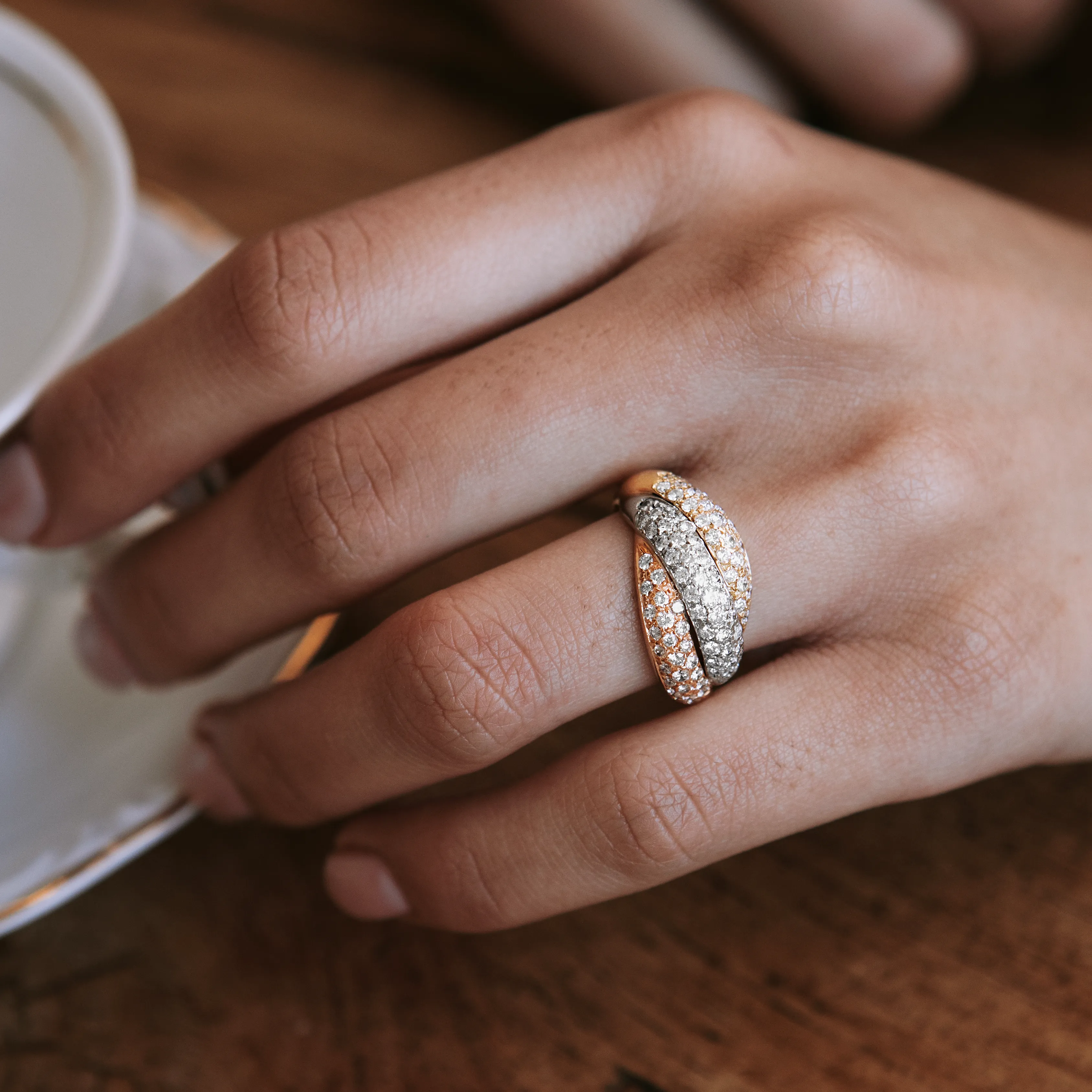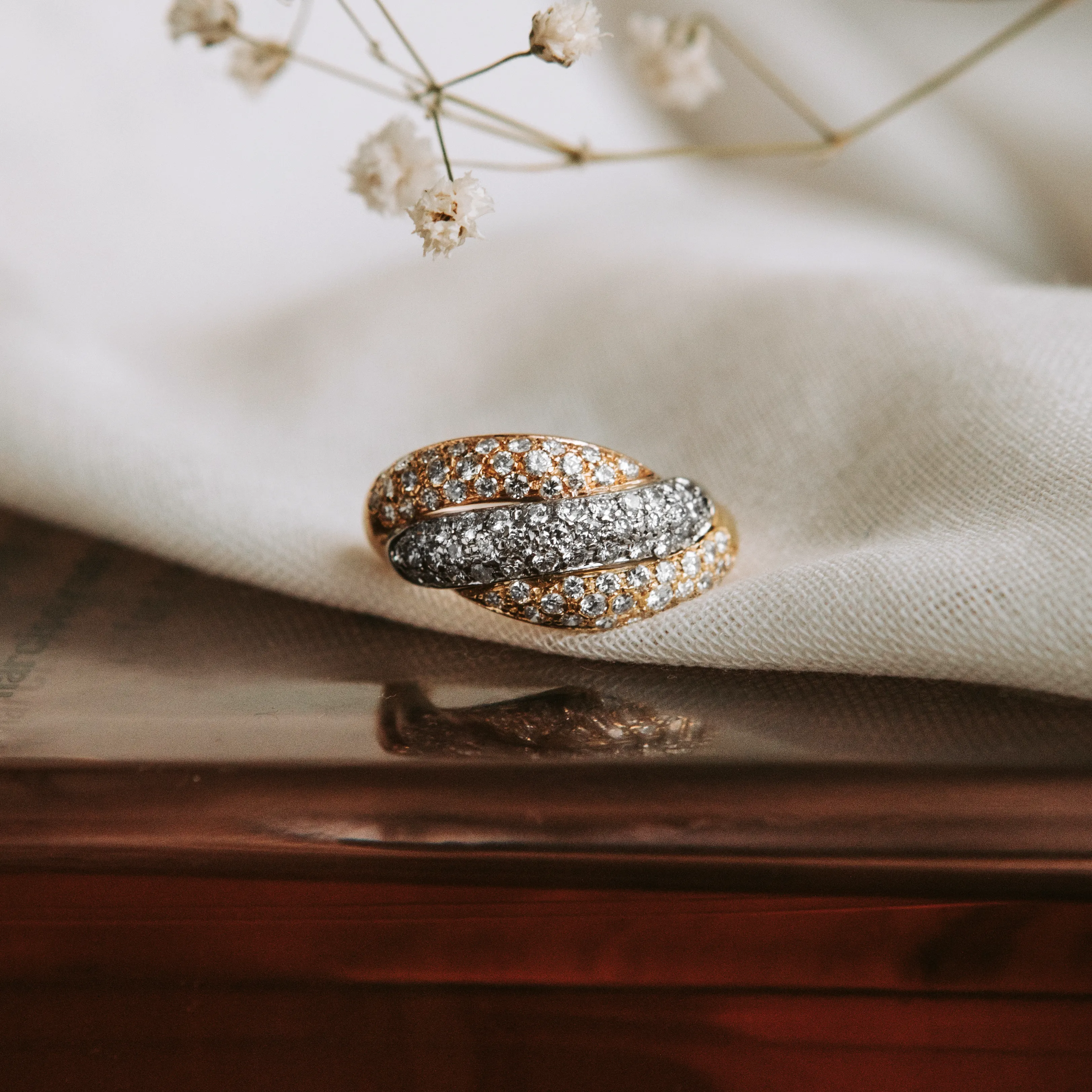 Sortija vintage de oro amarillo, rosa y blanco cuajada por un pavé con 85 diamantes talla brillante.