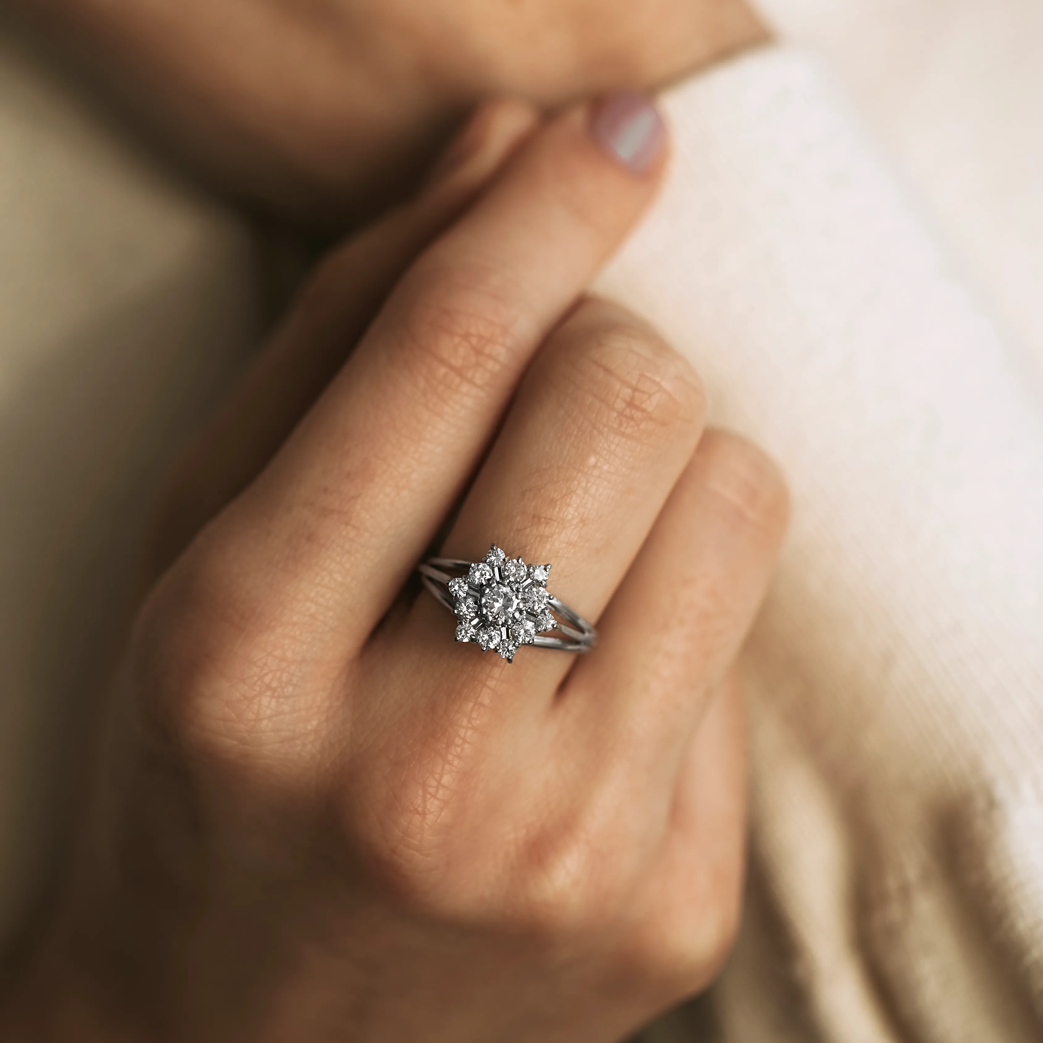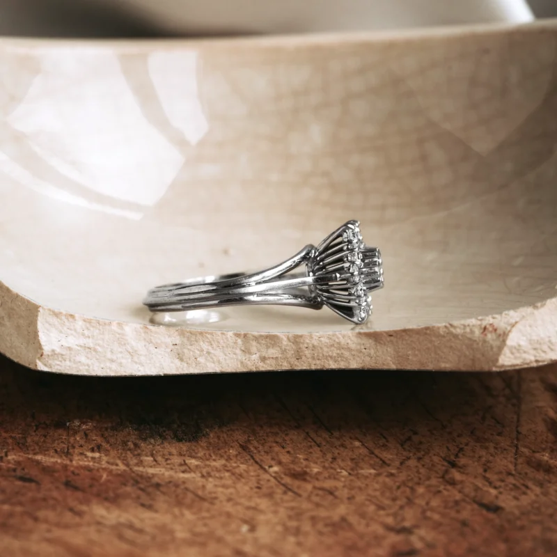 Rosetón vintage de oro blanco con diamante talla brillante y doble orla de 12 diamantes tallas brillante y antigua.