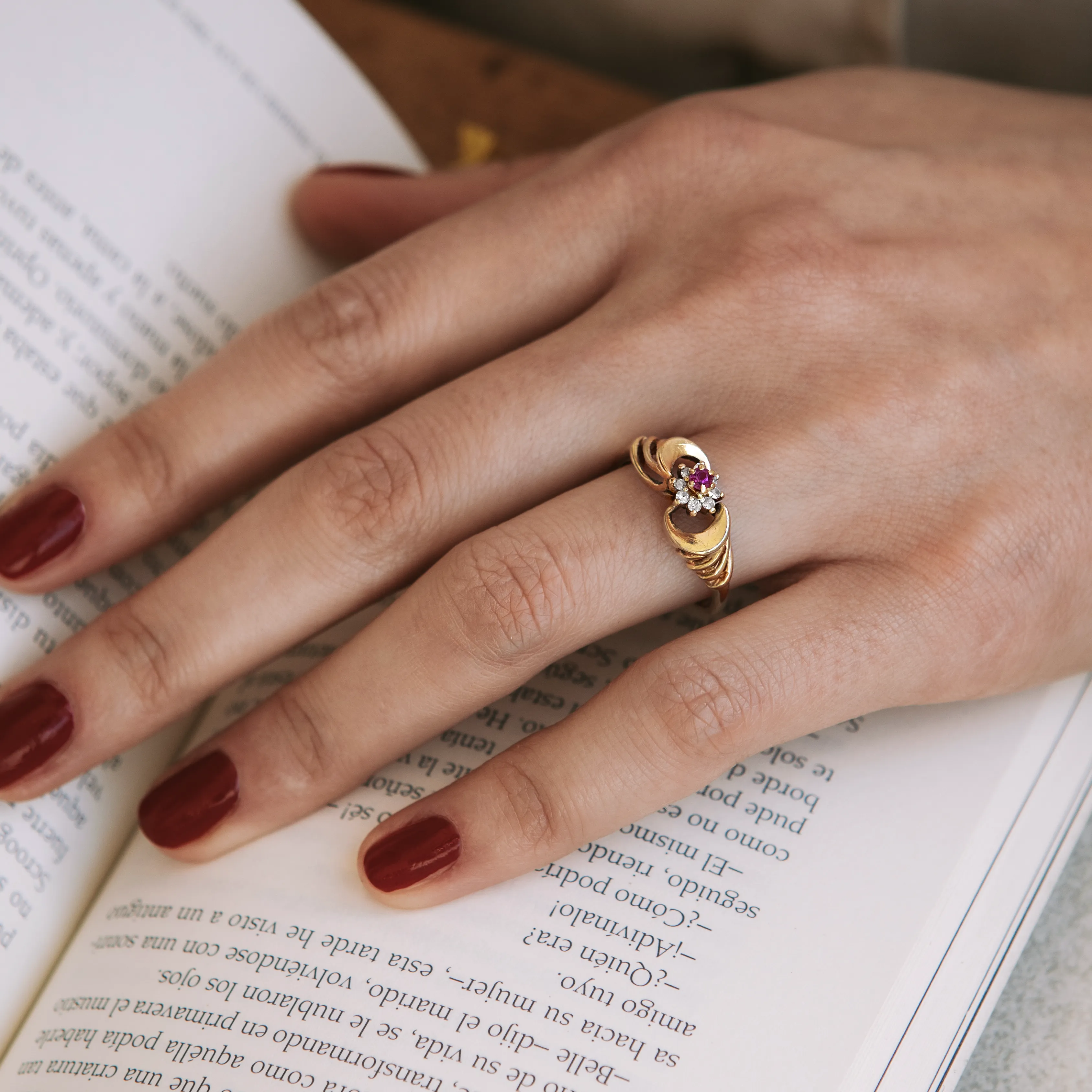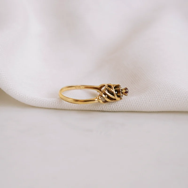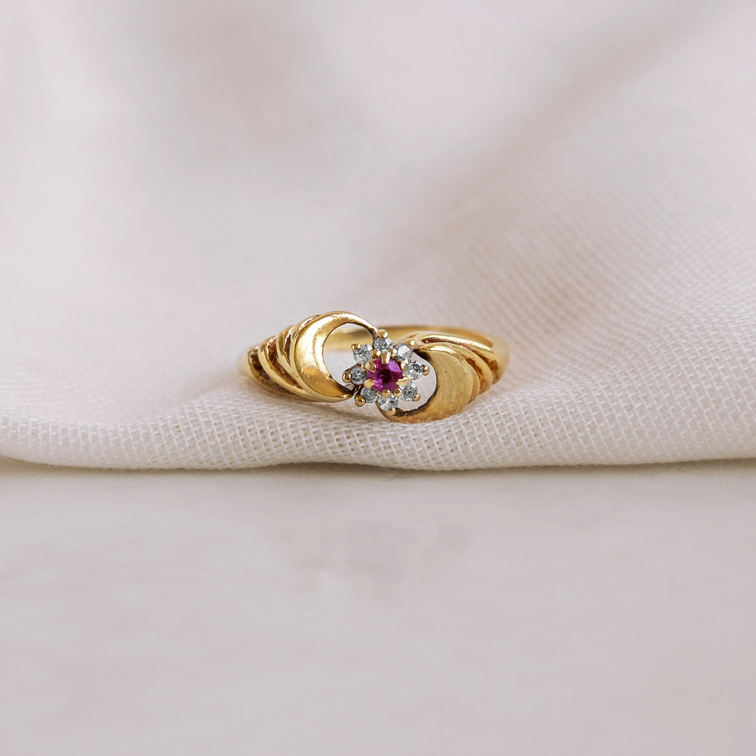 Roseta vintage de oro amarillo de originales brazos con rubí talla redonda y orla de 8 diamantes talla antigua.