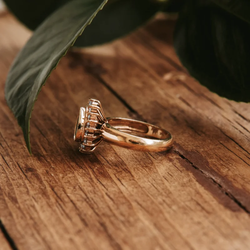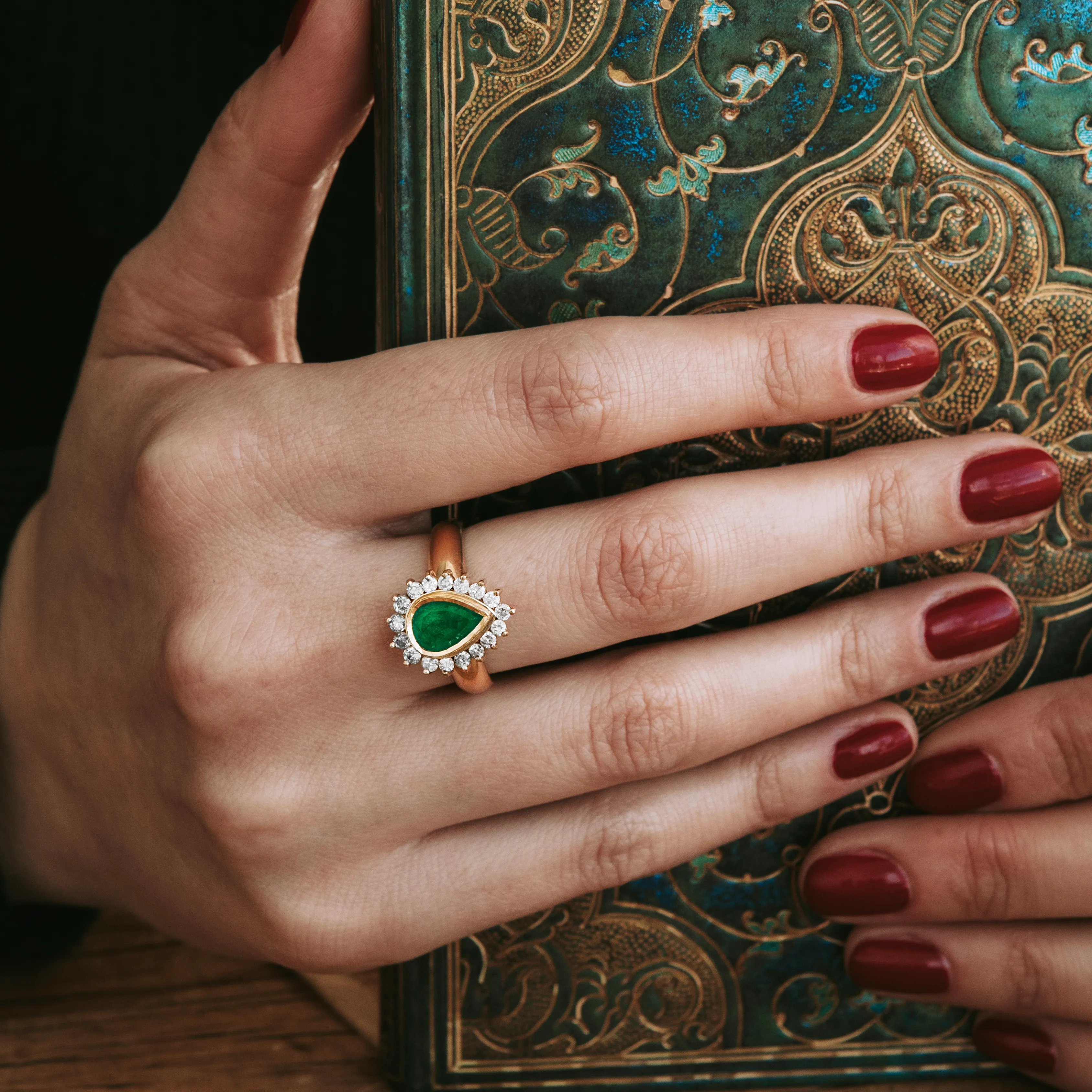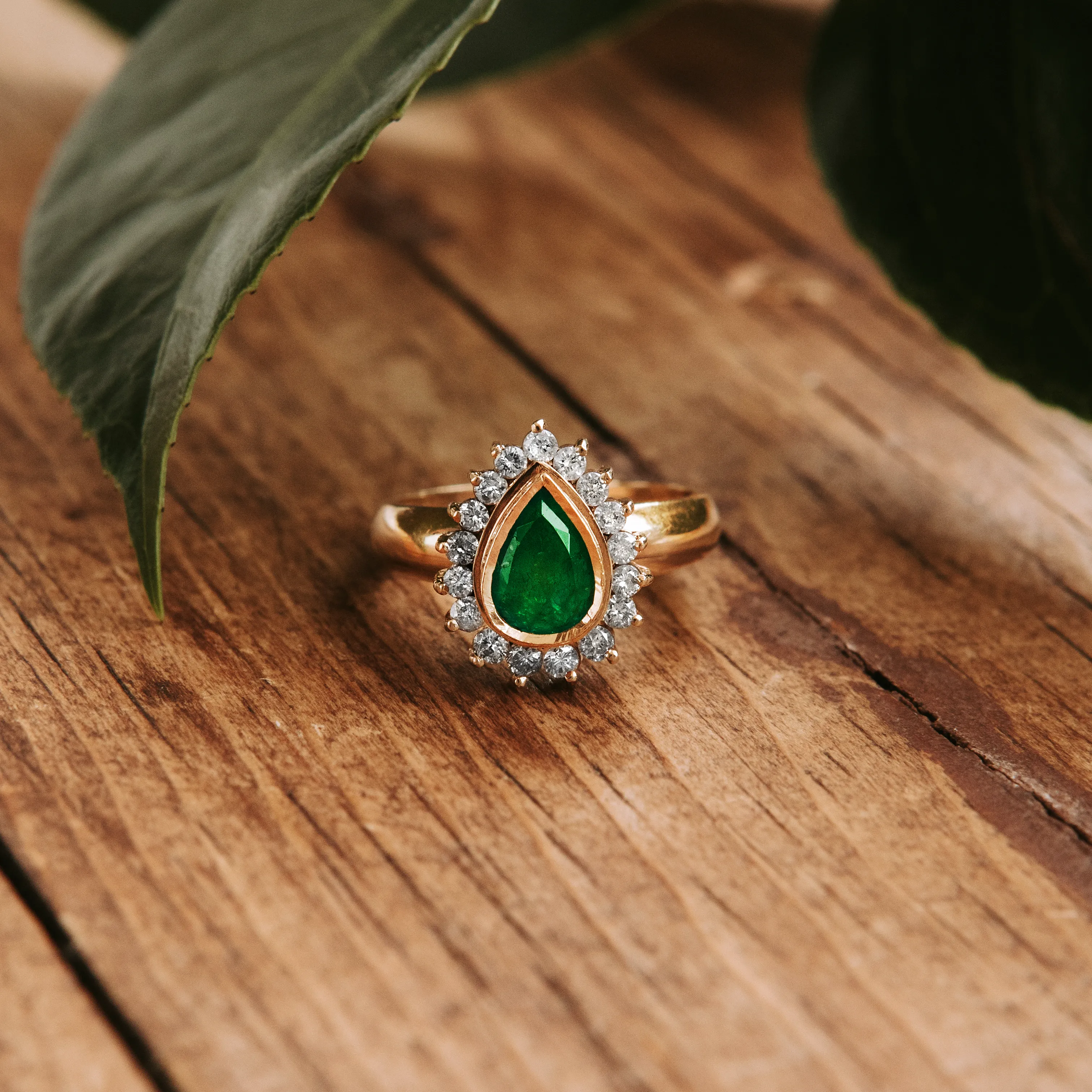 Roseta vintage de oro amarillo con esmeralda colombiana talla pera y orla de 17 diamantes talla brillante.