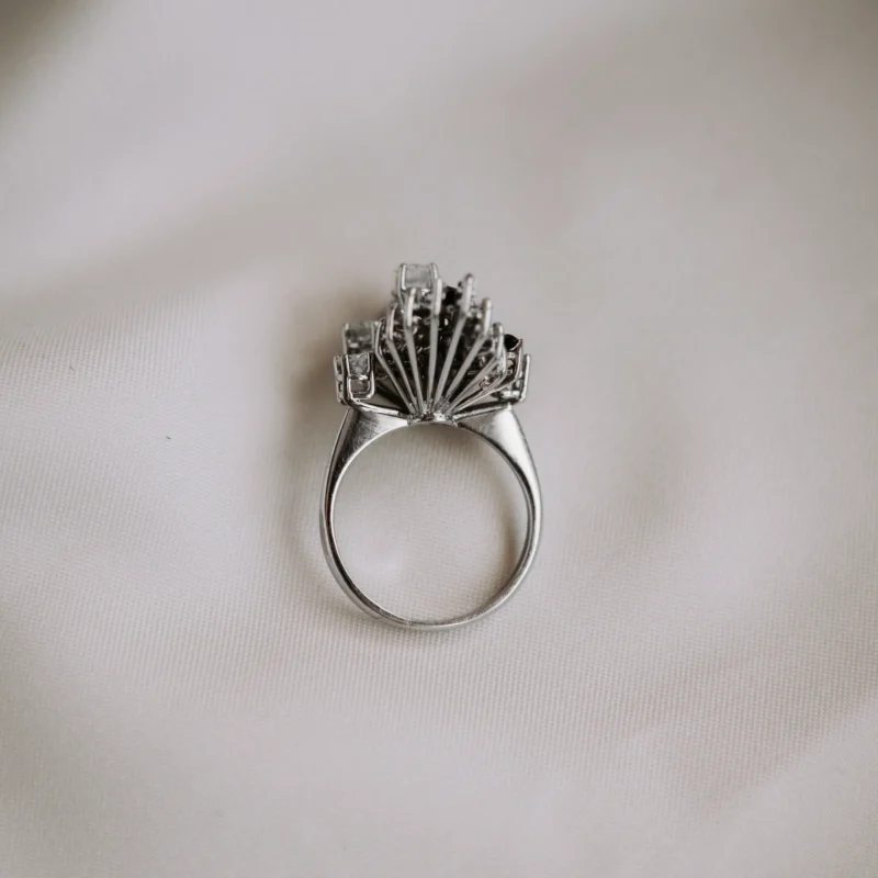 Rosetón vintage de oro blanco con 3 zafiros talla marquesa y 17 diamantes tallas brillante y trapecio.