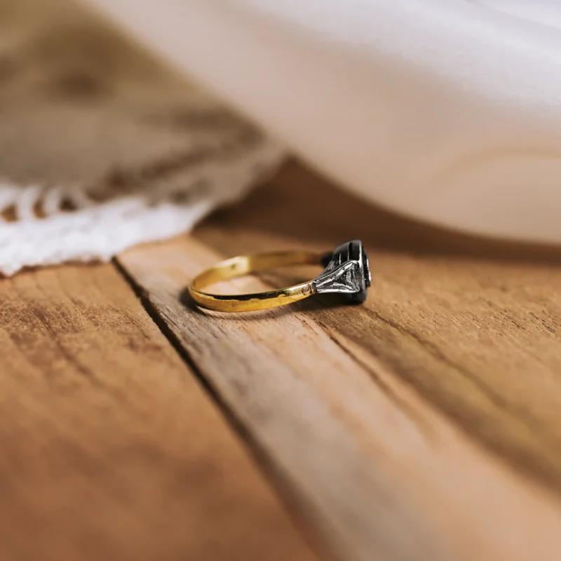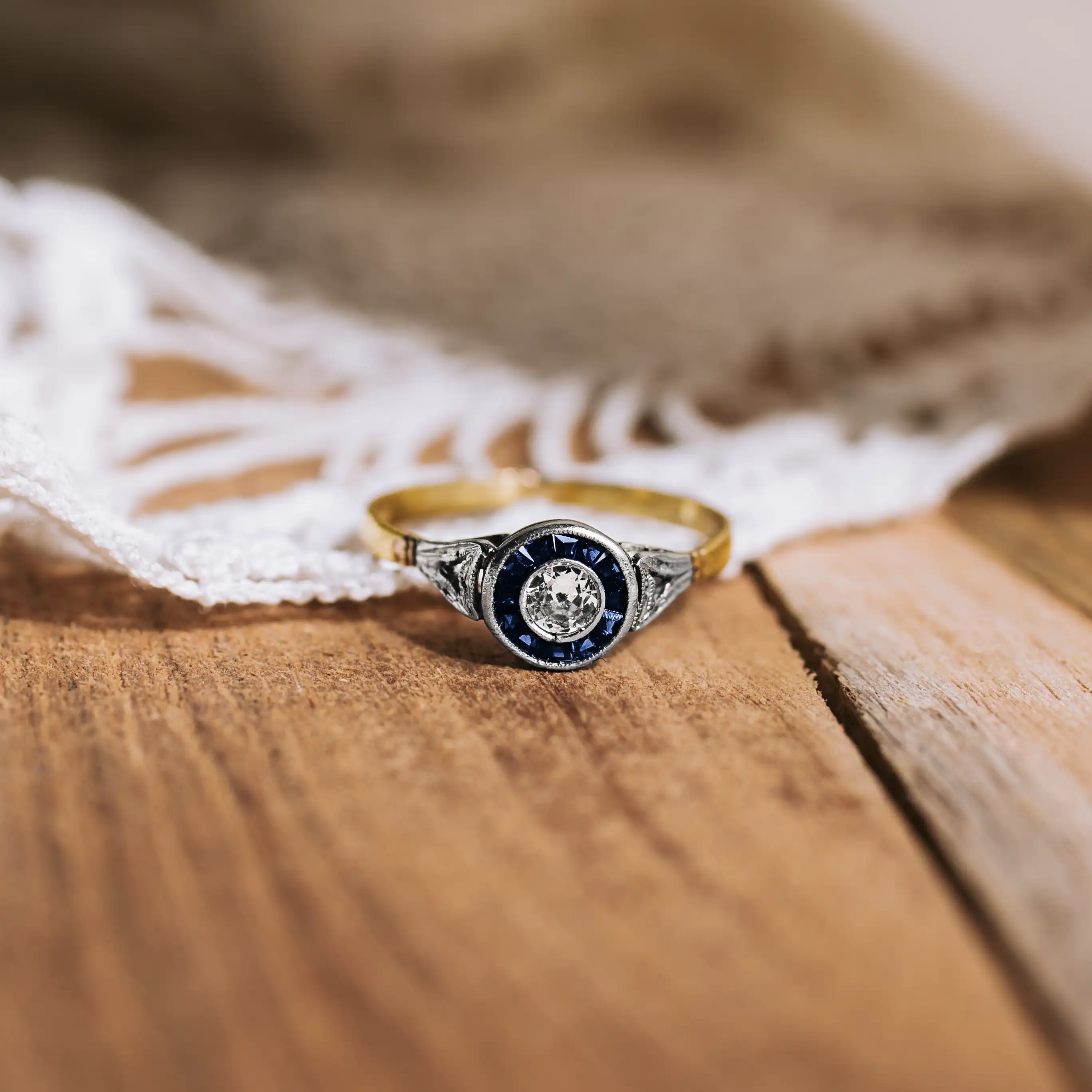 Ojo de perdiz de oro amarillo y vistas de platino con diamante talla brillante y orla de 12 zafiros sintéticos de Verneuil propios de la época.