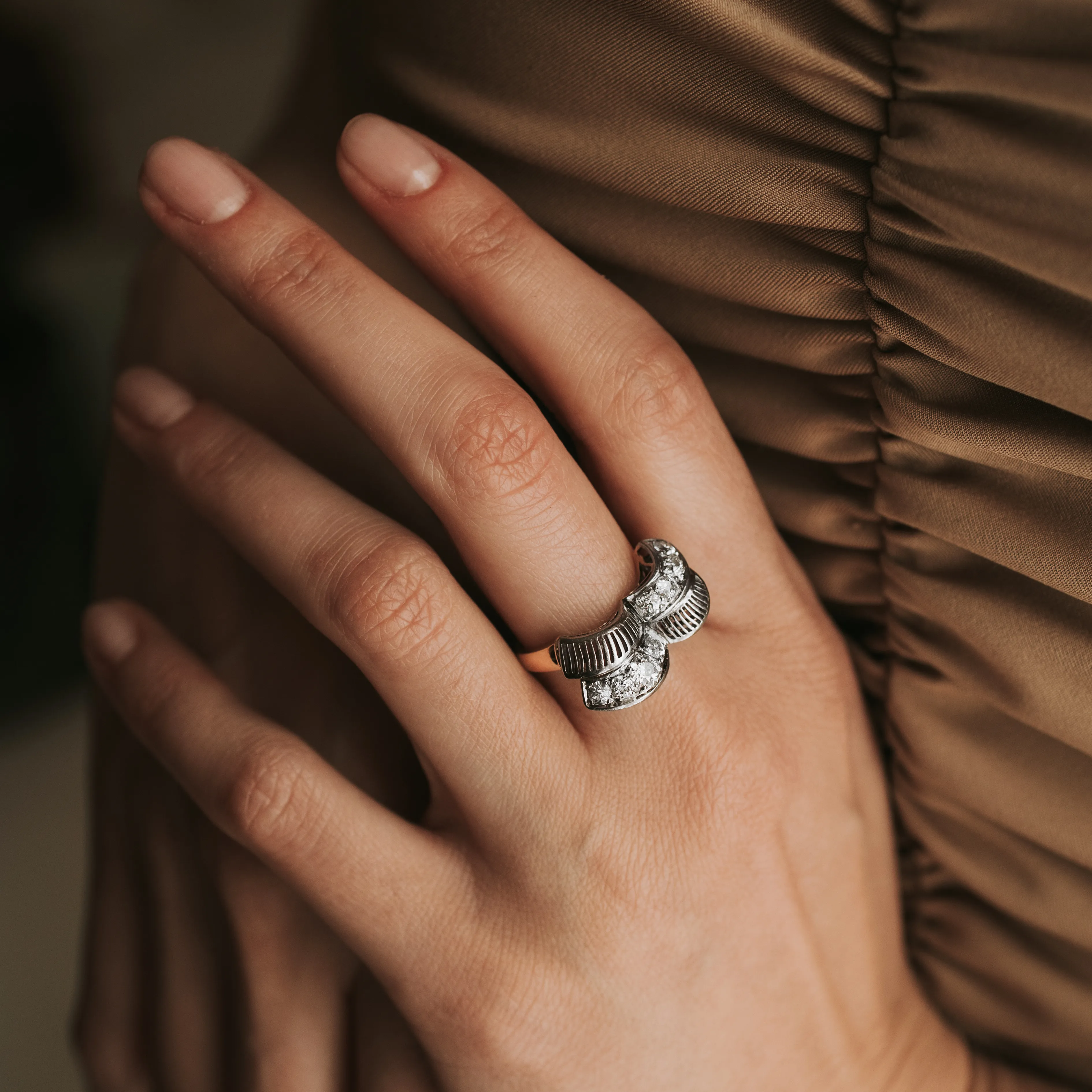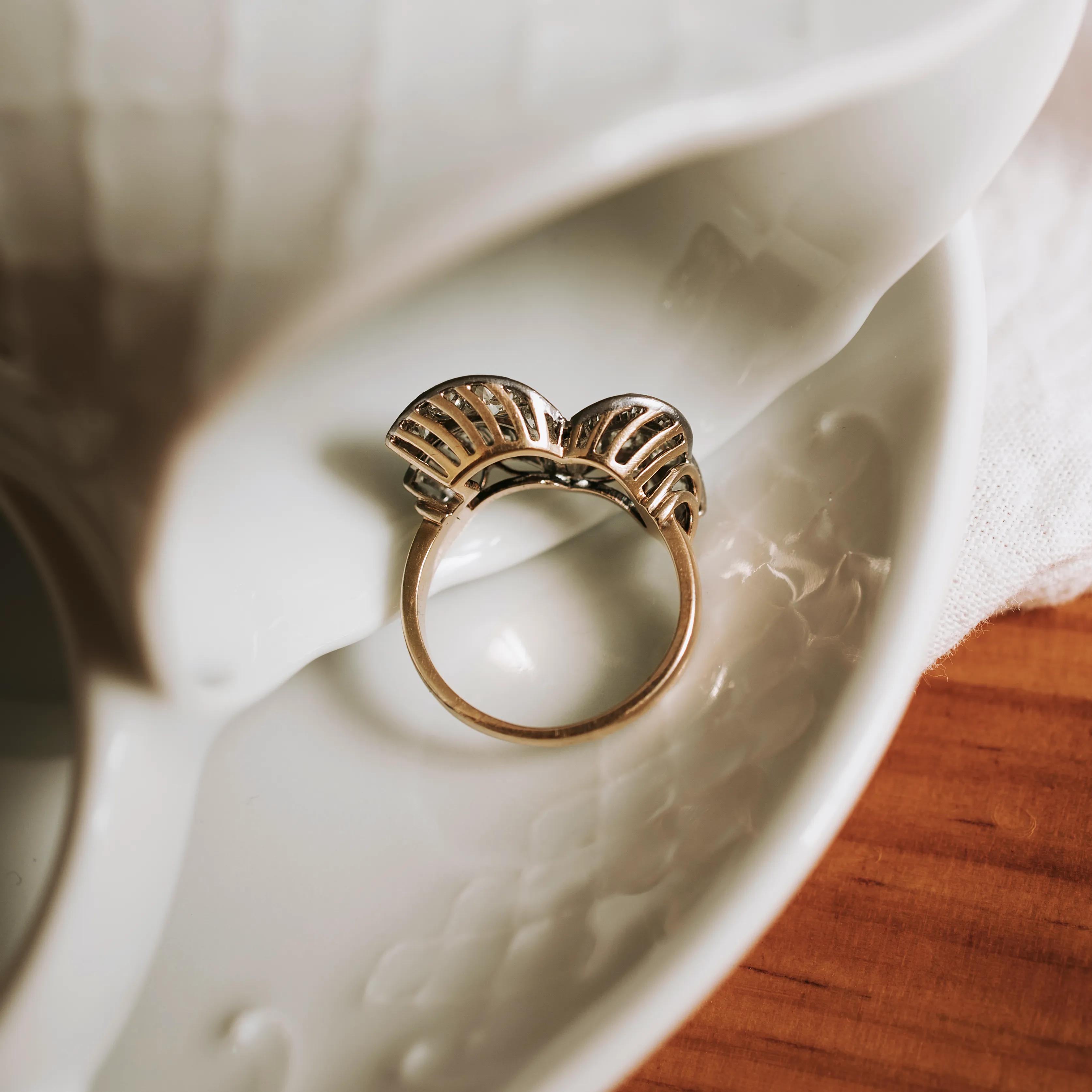 Sortija antigua abanico de oro amarillo y vistas de oro blanco con 8 diamantes talla antigua.